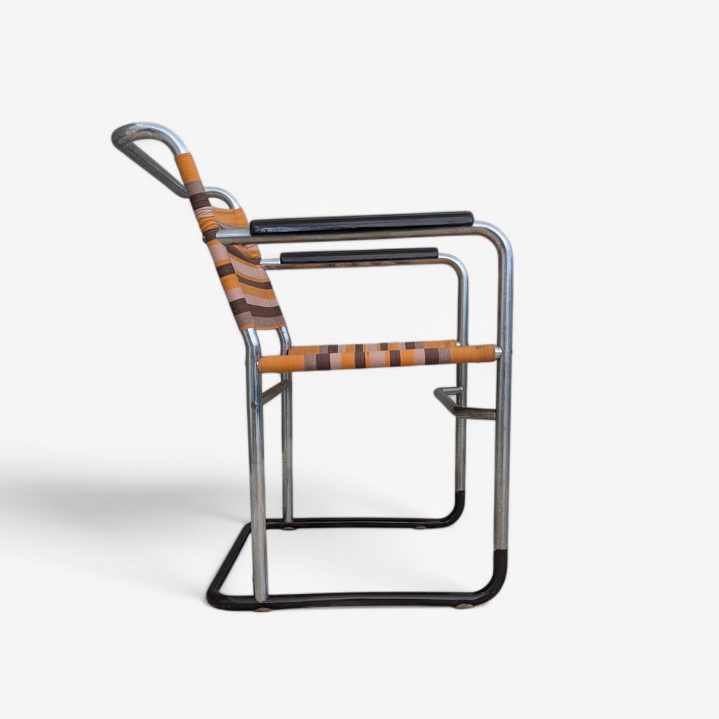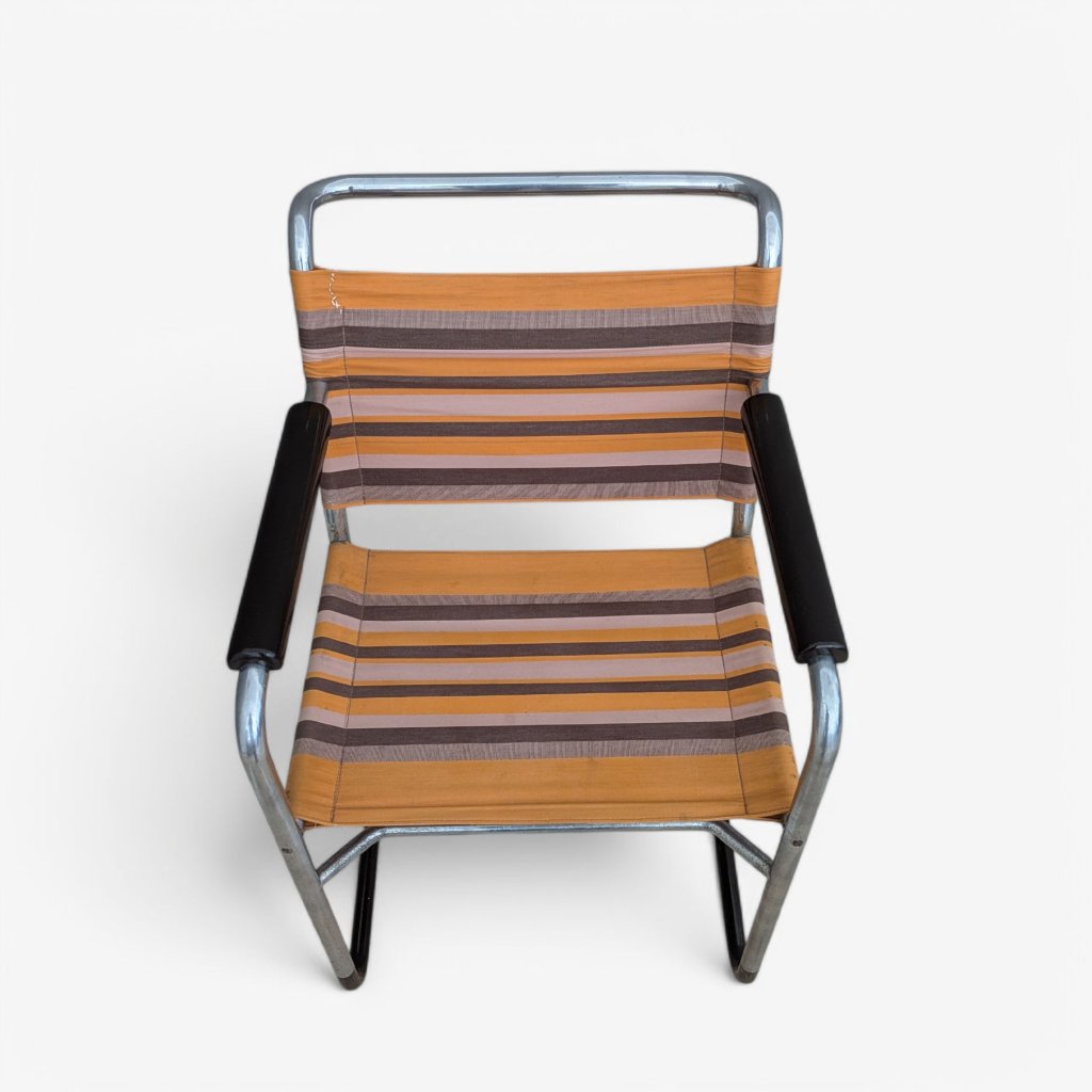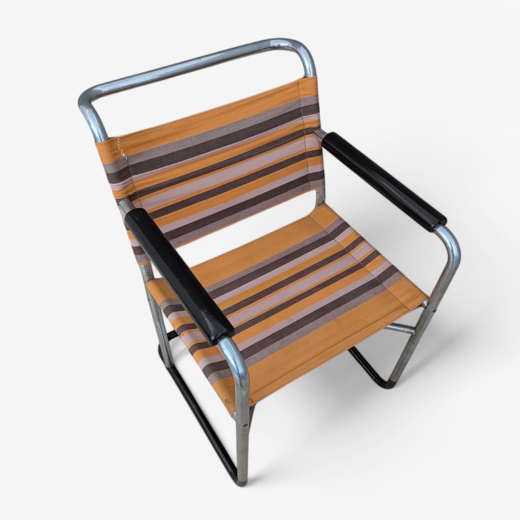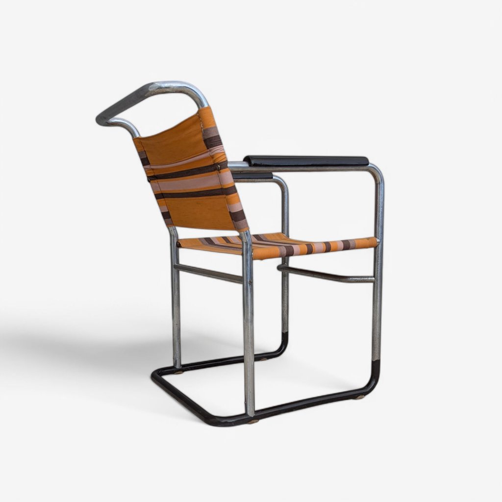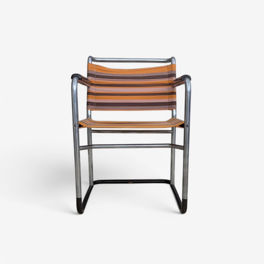 Bauhaus tubular steel armchair, designed by František Langer and manufactured by SAB Prague in former Czechoslovakia during the 1930s under catalogue number 523. This rare outdoor variant features brown lacquered bottom tubes and durable outdoor fabric. In good original condition with minor signs of wear and age. A highly collectible piece, yet perfectly suitable for everyday use by any design enthusiast.