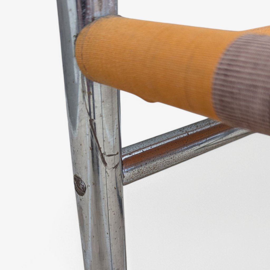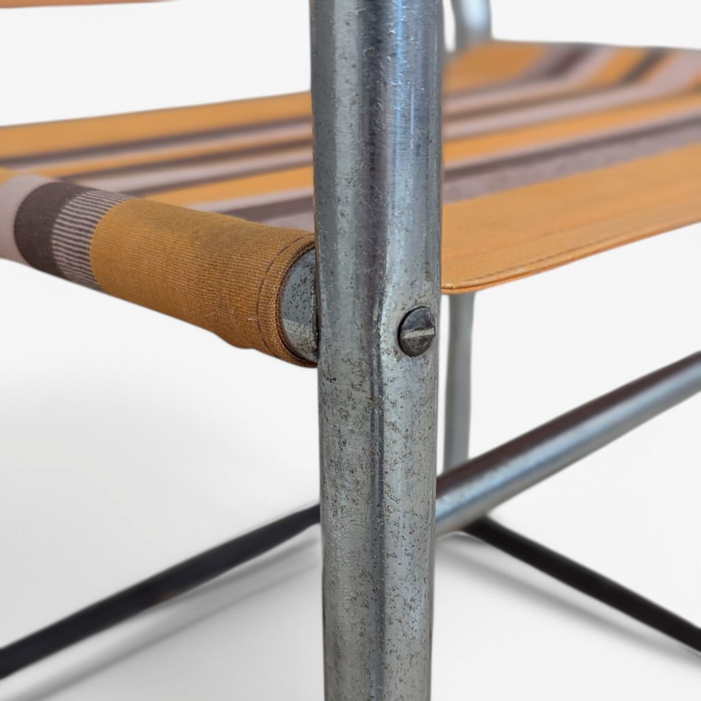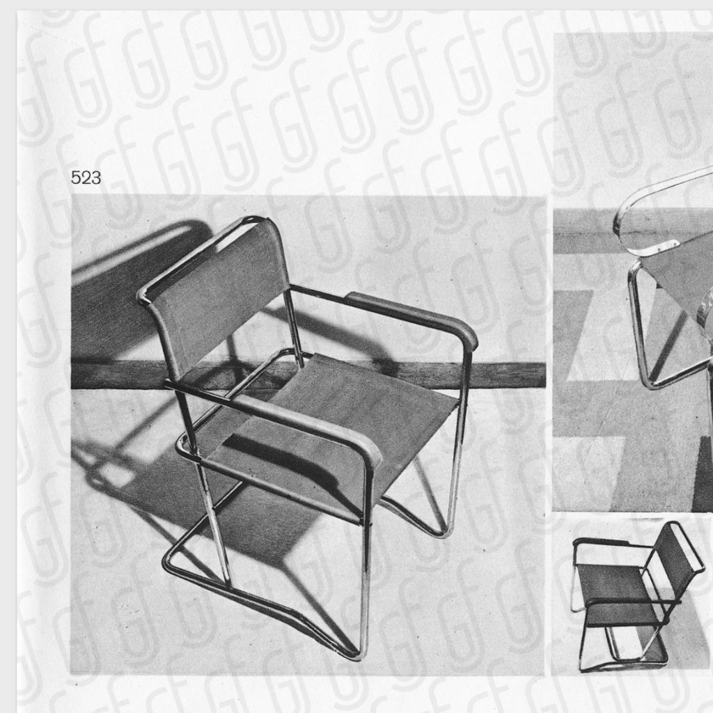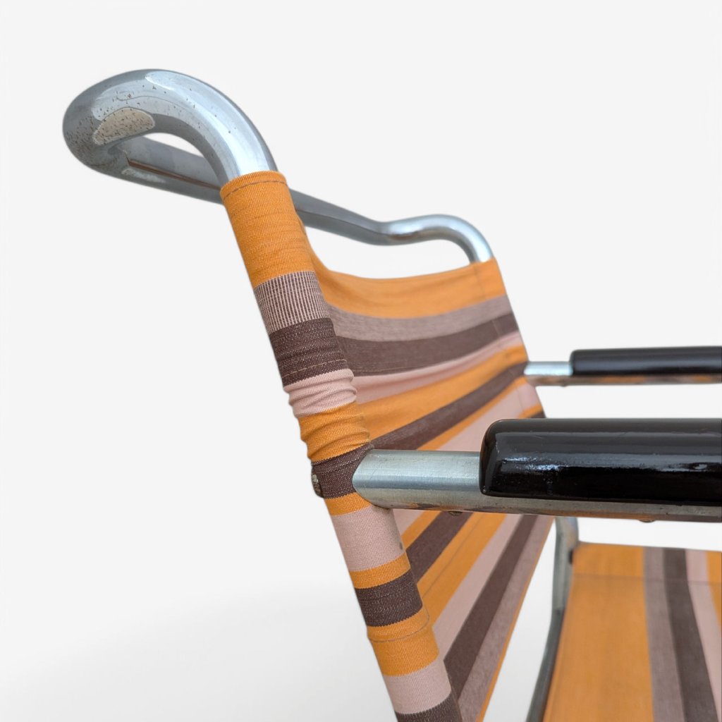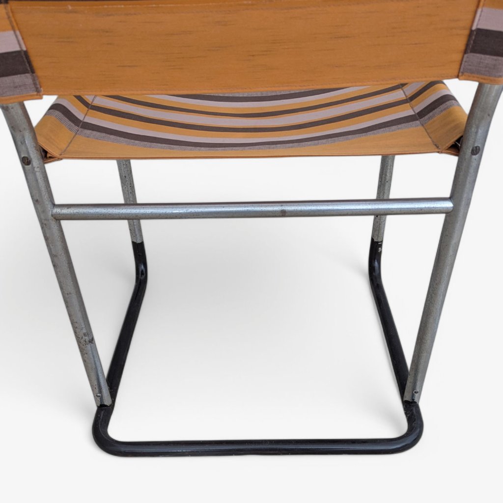 Bauhaus tubular steel armchair, designed by František Langer and manufactured by SAB Prague in former Czechoslovakia during the 1930s under catalogue number 523. This rare outdoor variant features brown lacquered bottom tubes and durable outdoor fabric. In good original condition with minor signs of wear and age. A highly collectible piece, yet perfectly suitable for everyday use by any design enthusiast.
