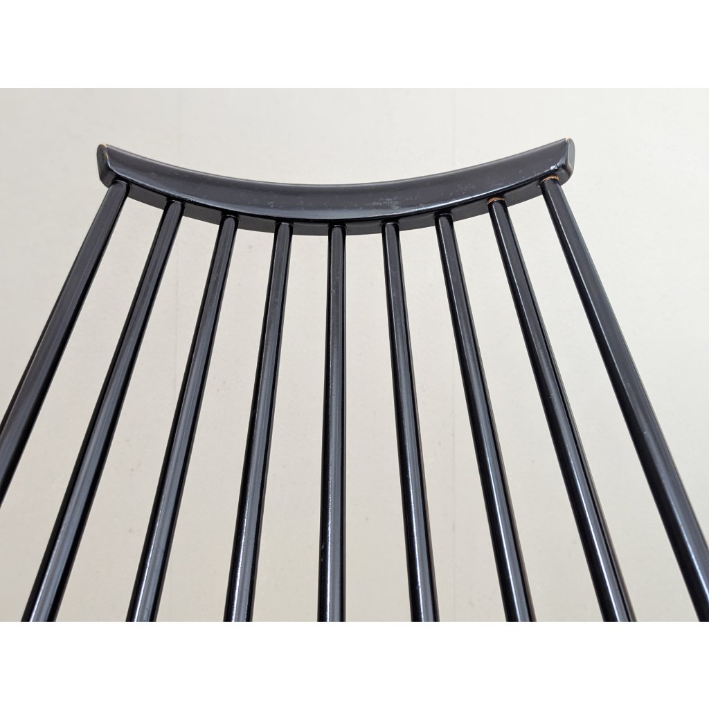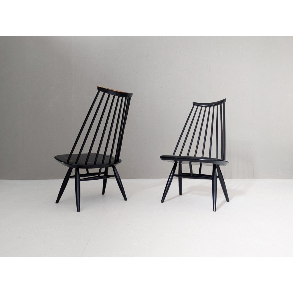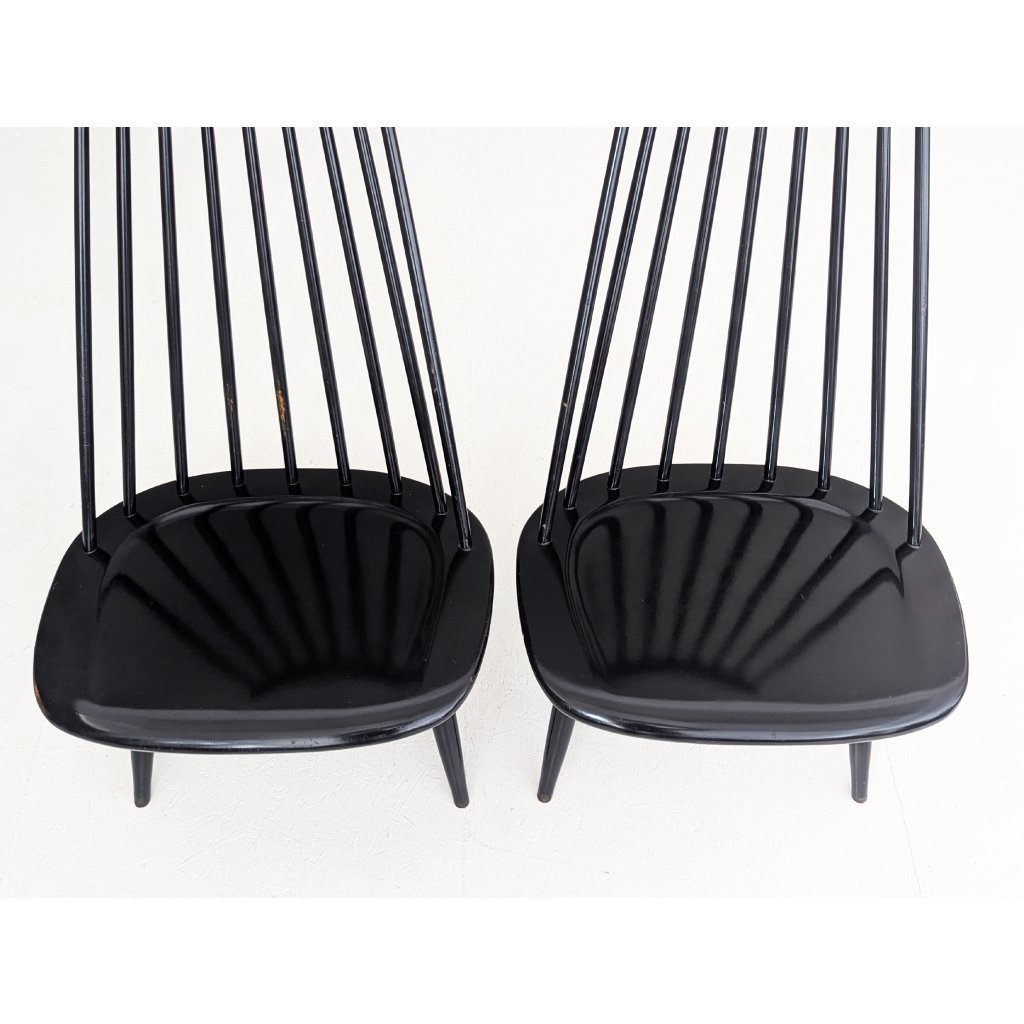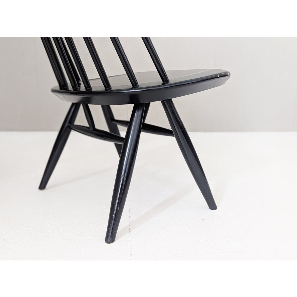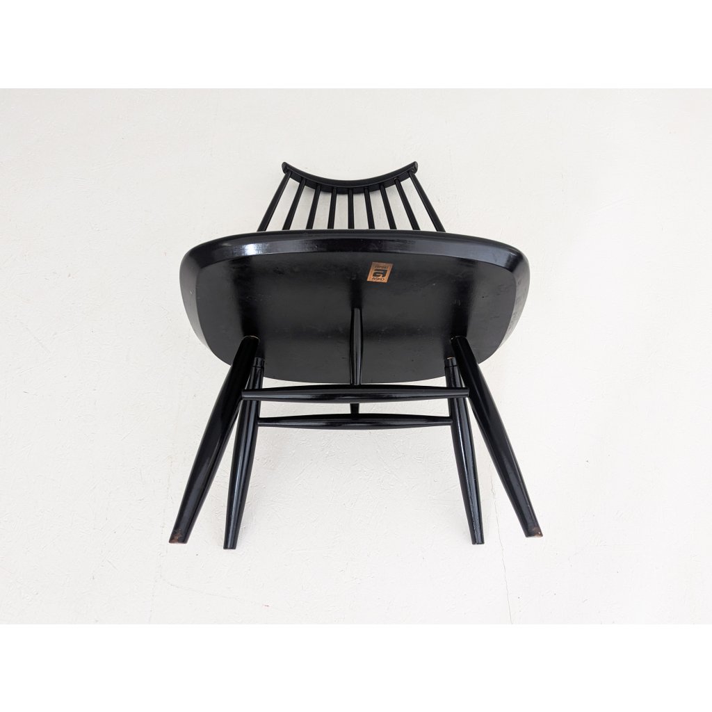 Crafted from black lacquered birch, these original early production chairs exemplify Tapiovaara’s mastery of form — with slender tapering spindles, a softly curved backrest, and a gracefully reclined posture that invites relaxation. The light, open structure creates a powerful sculptural silhouette while maintaining strength and comfort.