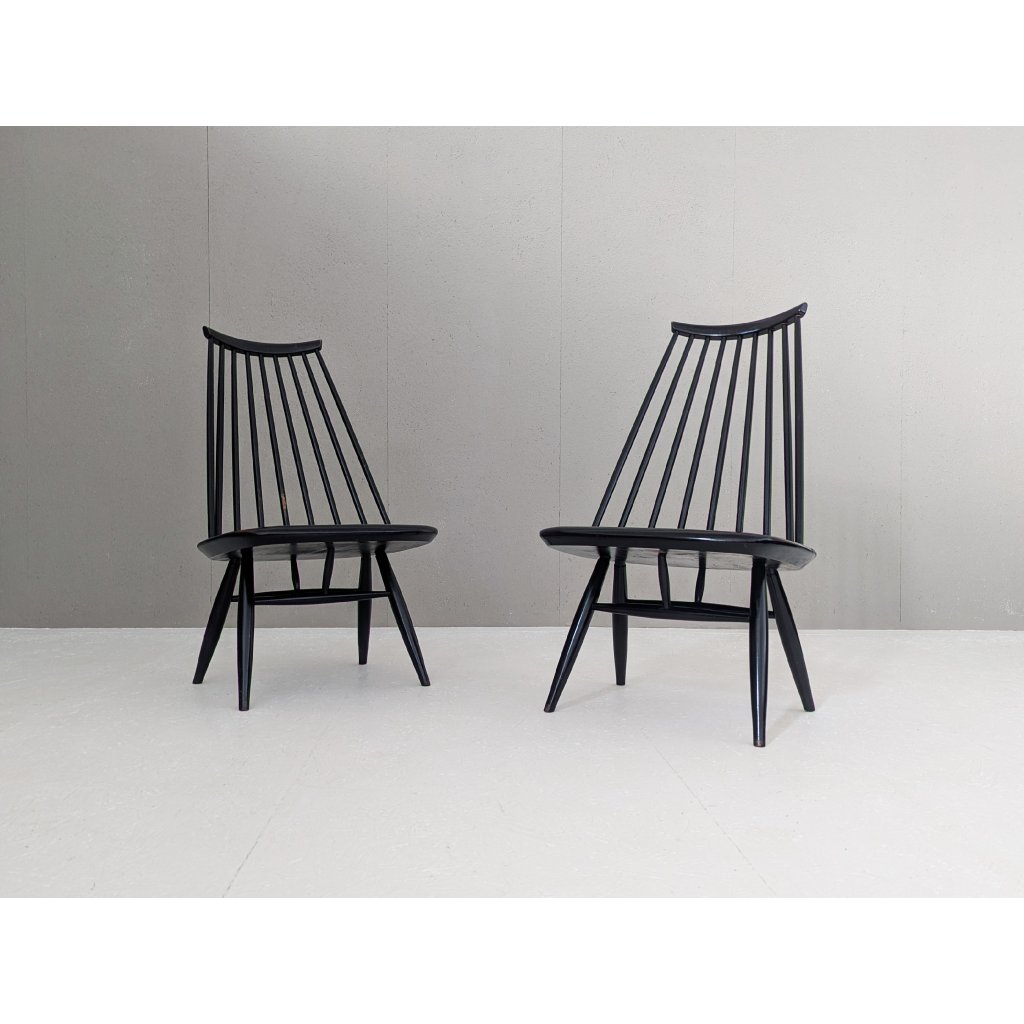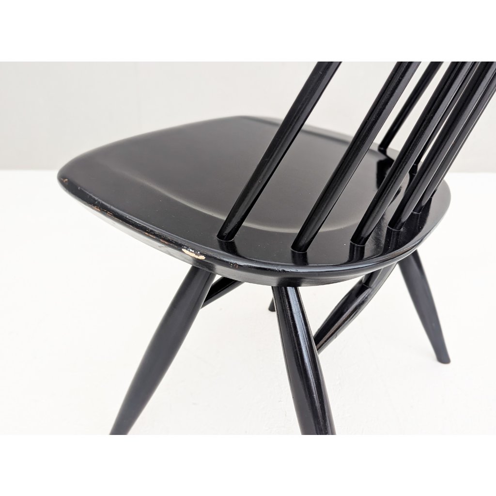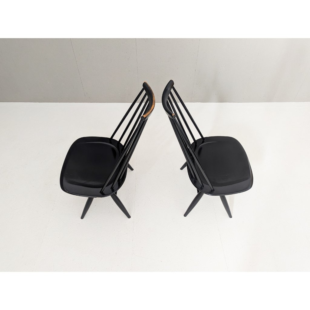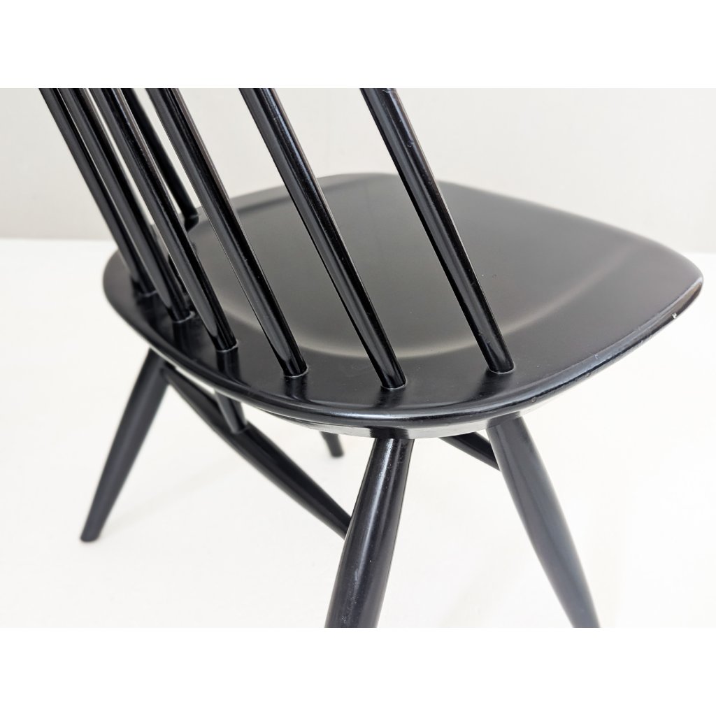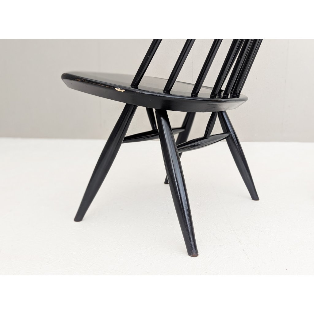Crafted from black lacquered birch, these original early production chairs exemplify Tapiovaara’s mastery of form — with slender tapering spindles, a softly curved backrest, and a gracefully reclined posture that invites relaxation. The light, open structure creates a powerful sculptural silhouette while maintaining strength and comfort.