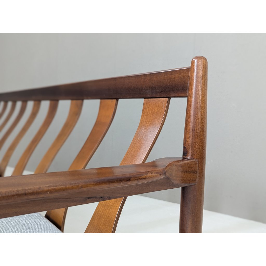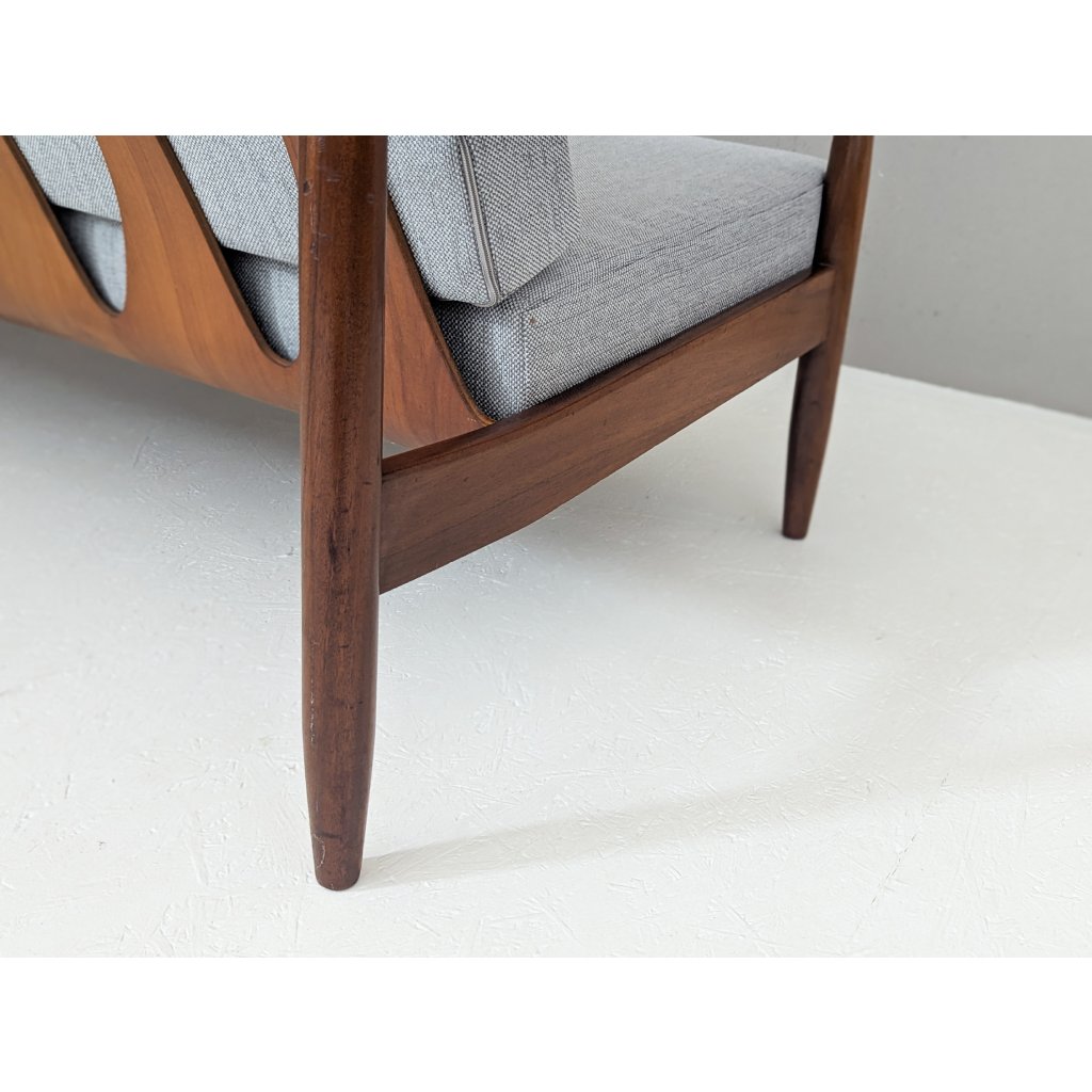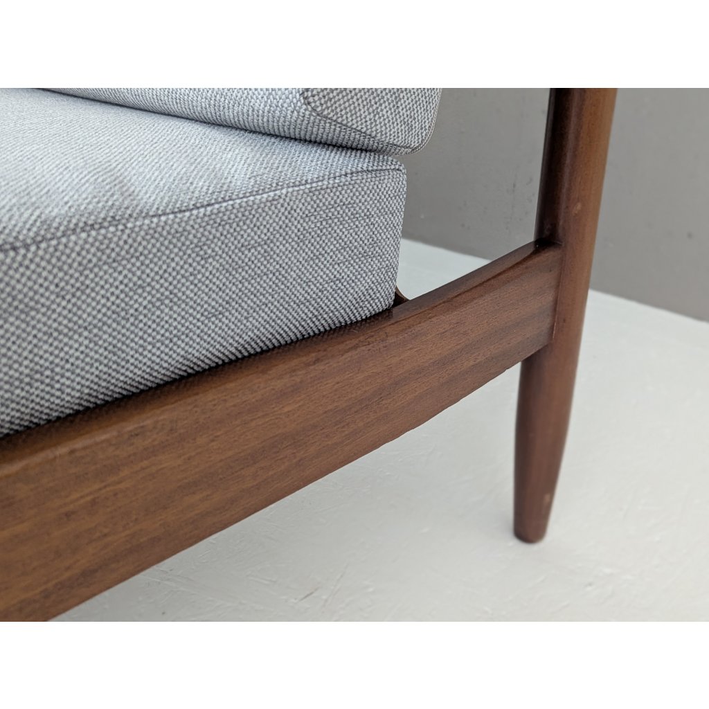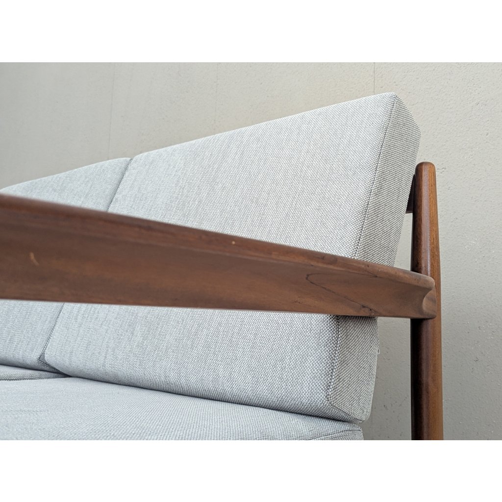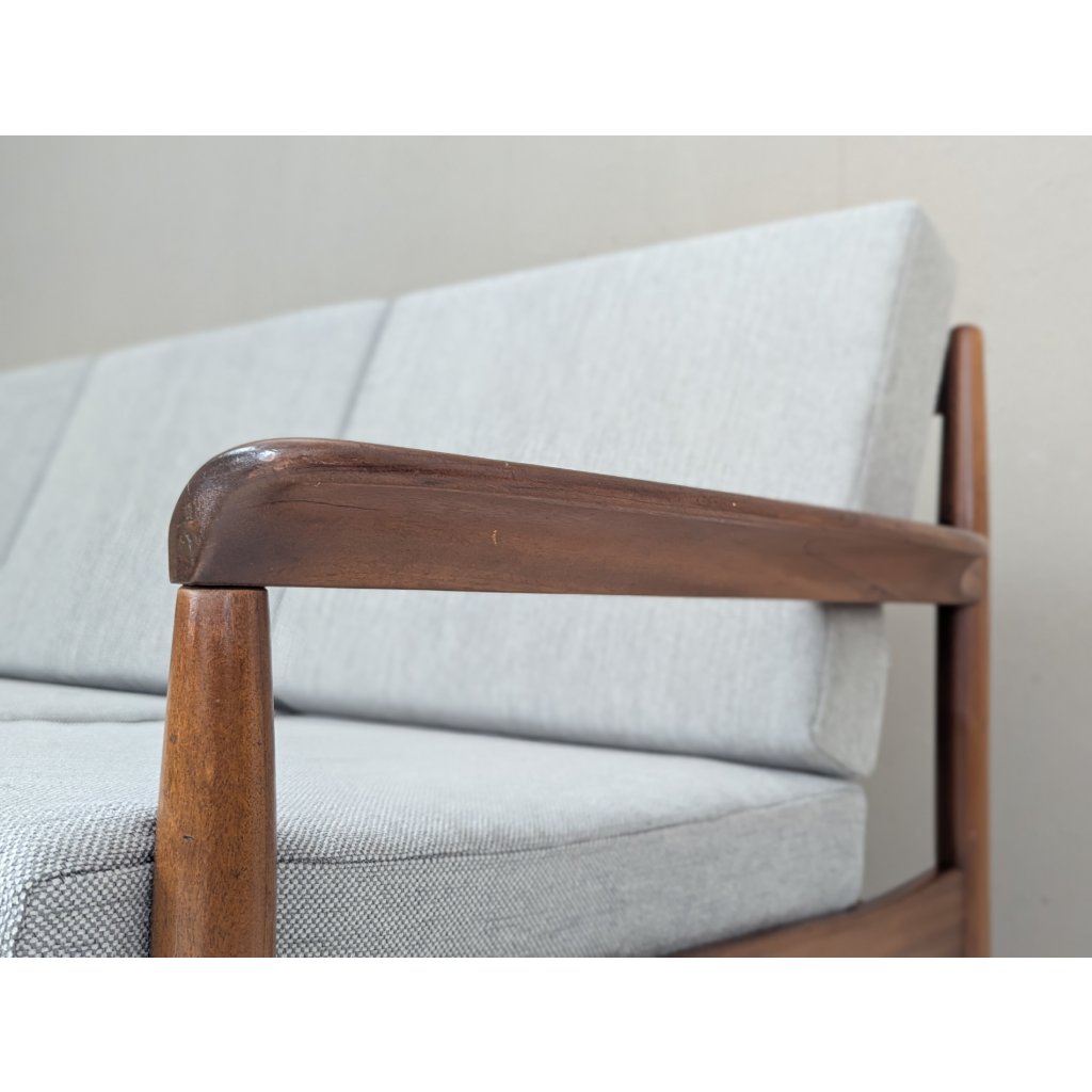 The teak structure is in very good original condition with a warm patina and remains structurally sound. Newly made cushions, upholstered in a soft grey textured fabric, provide firm yet comfortable seating, updating the piece for contemporary living without compromising its vintage character.