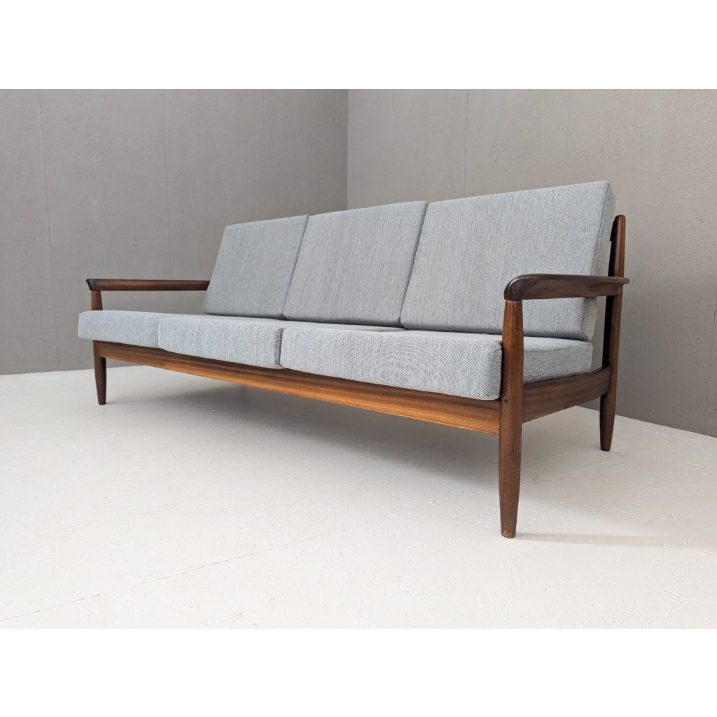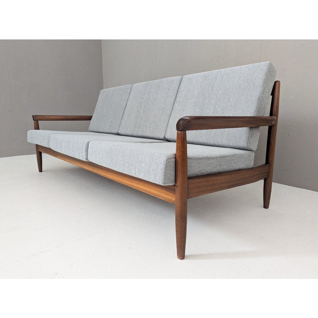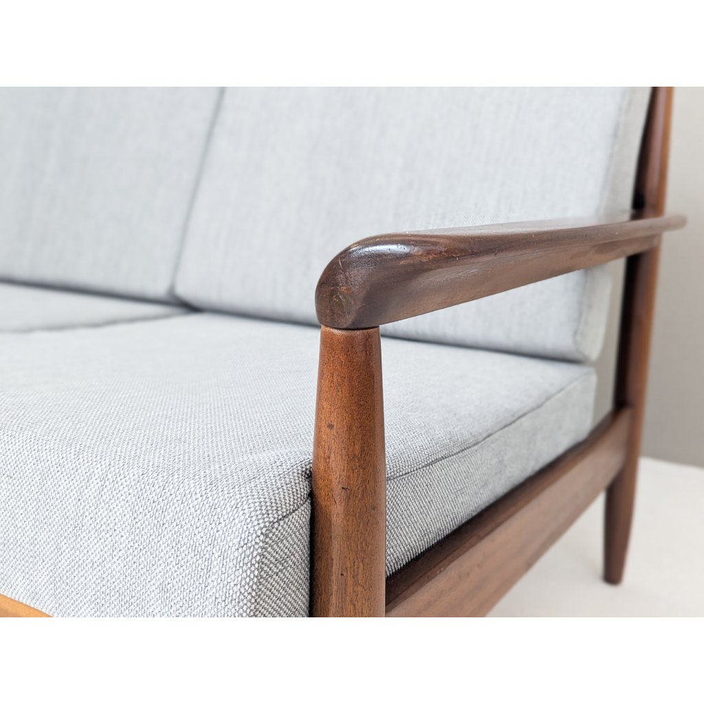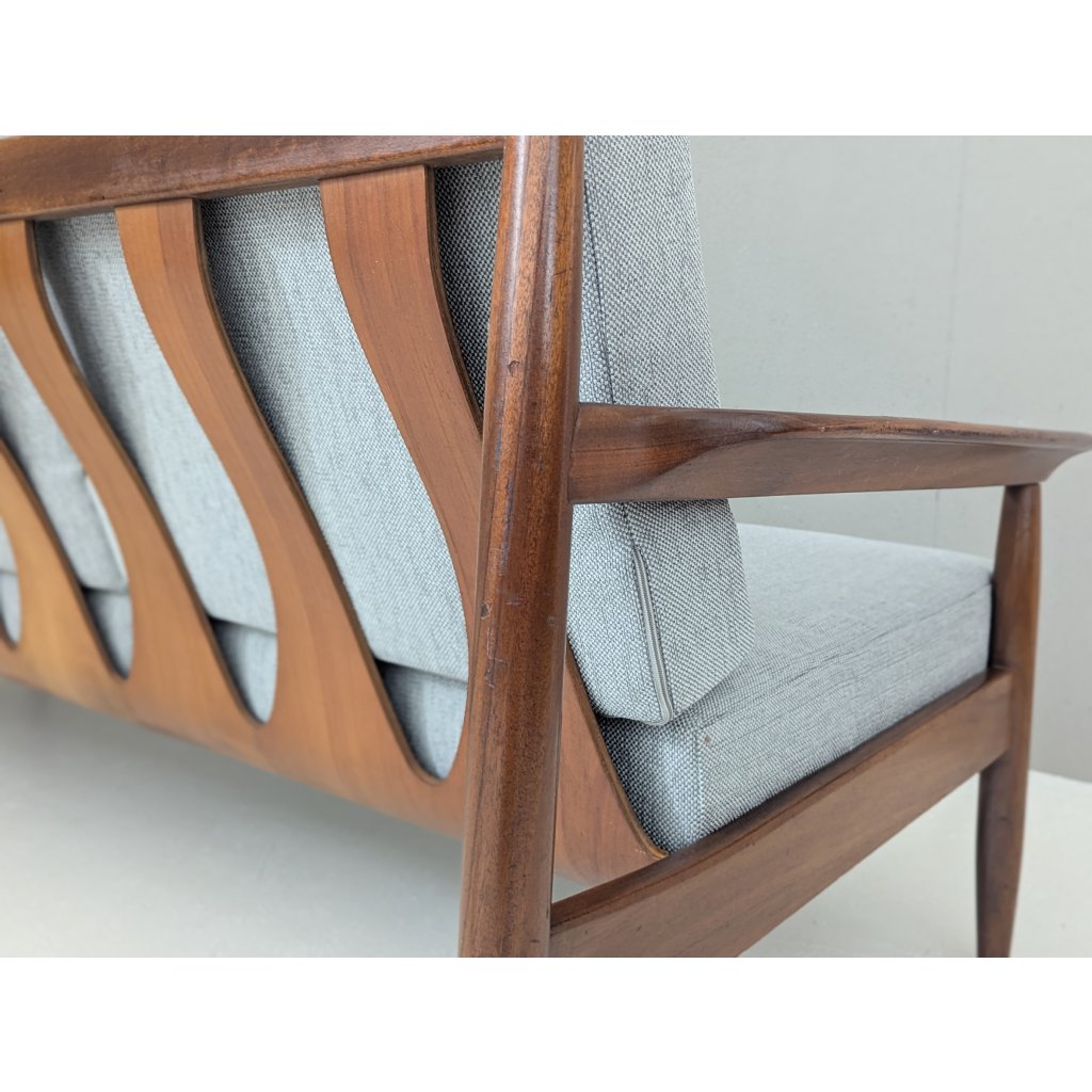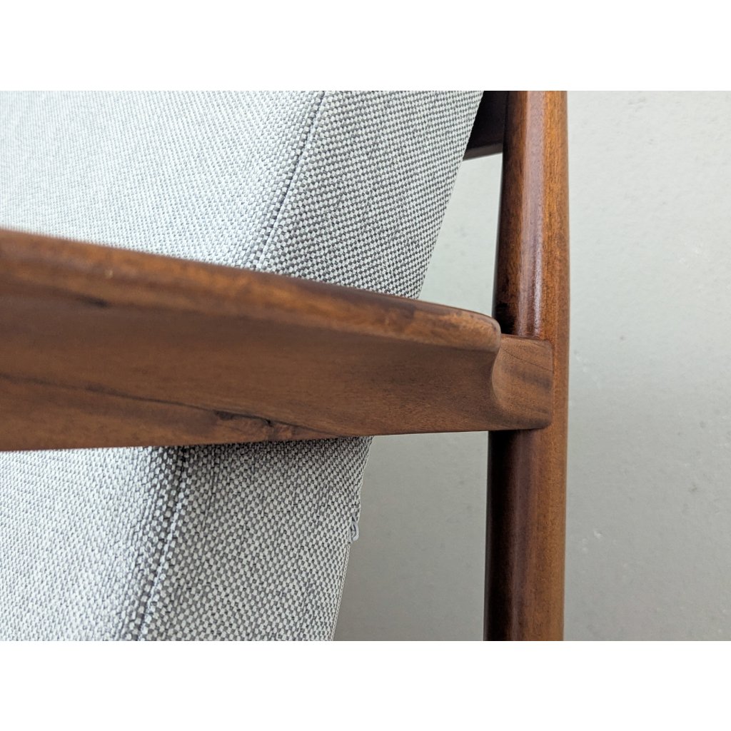The teak structure is in very good original condition with a warm patina and remains structurally sound. Newly made cushions, upholstered in a soft grey textured fabric, provide firm yet comfortable seating, updating the piece for contemporary living without compromising its vintage character.