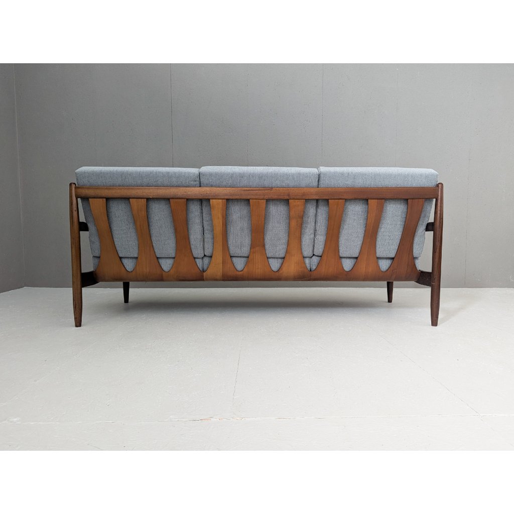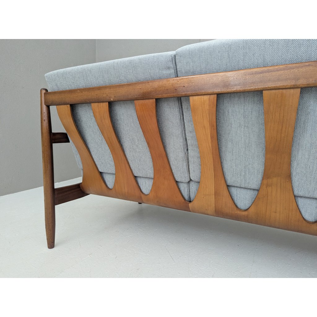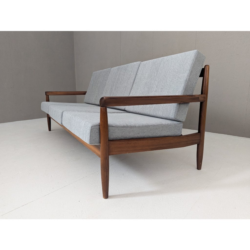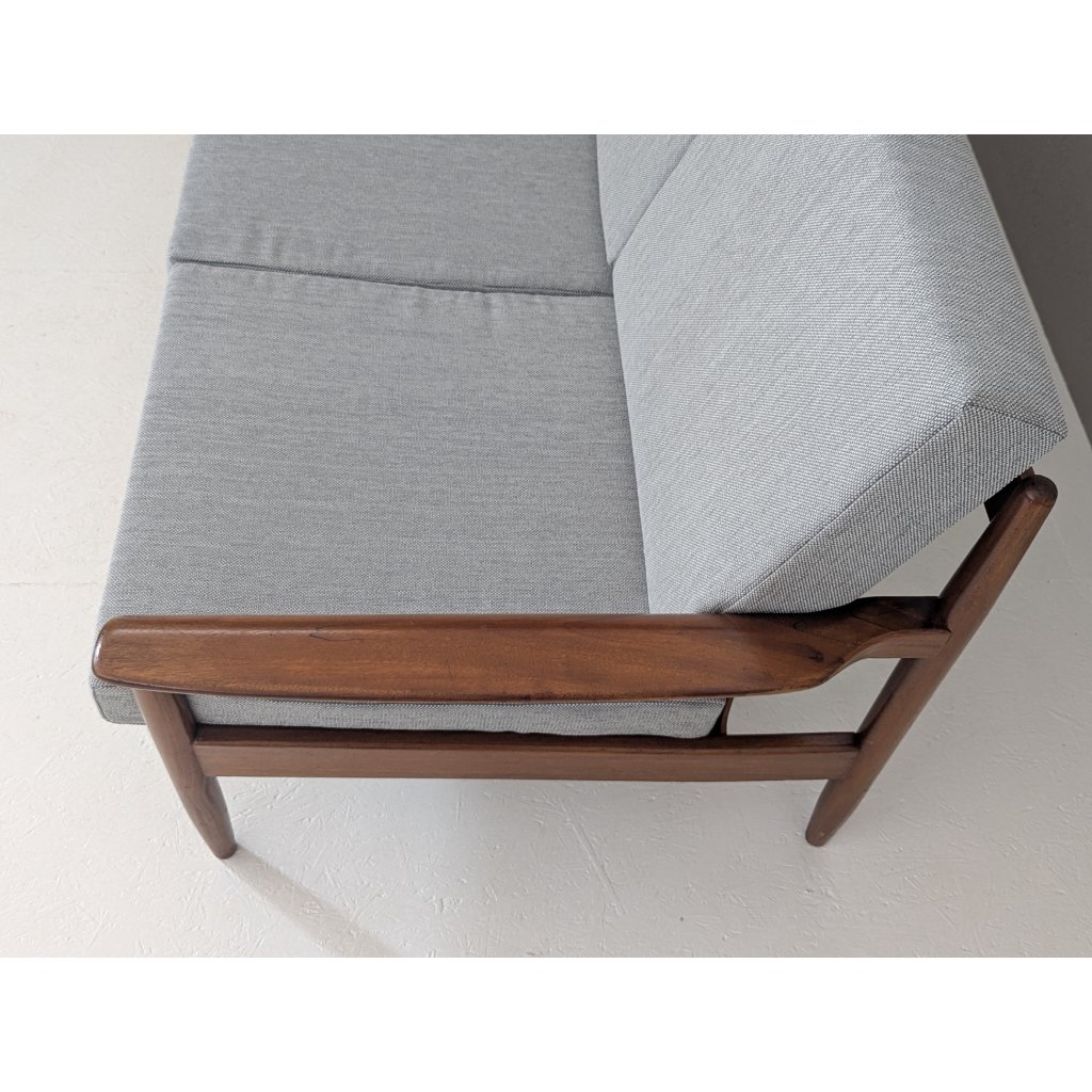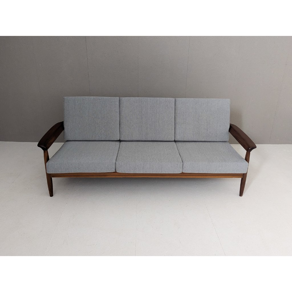 The teak structure is in very good original condition with a warm patina and remains structurally sound. Newly made cushions, upholstered in a soft grey textured fabric, provide firm yet comfortable seating, updating the piece for contemporary living without compromising its vintage character.