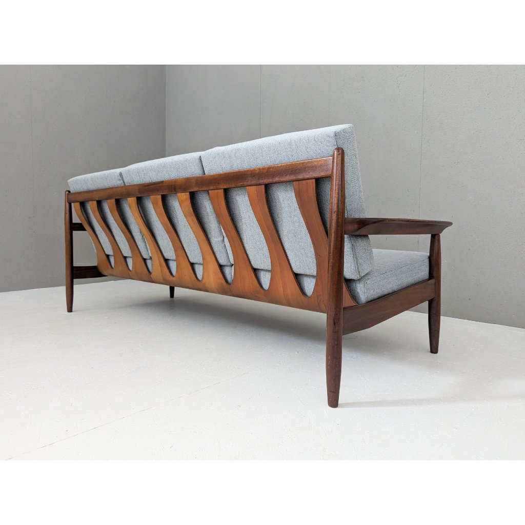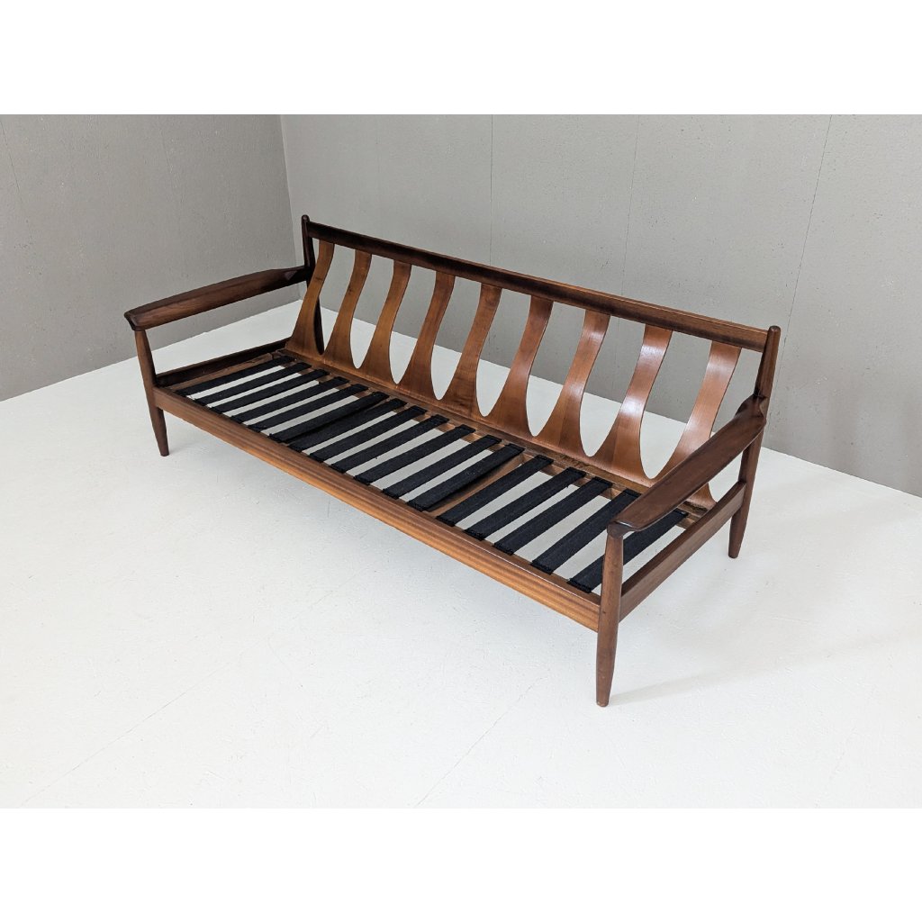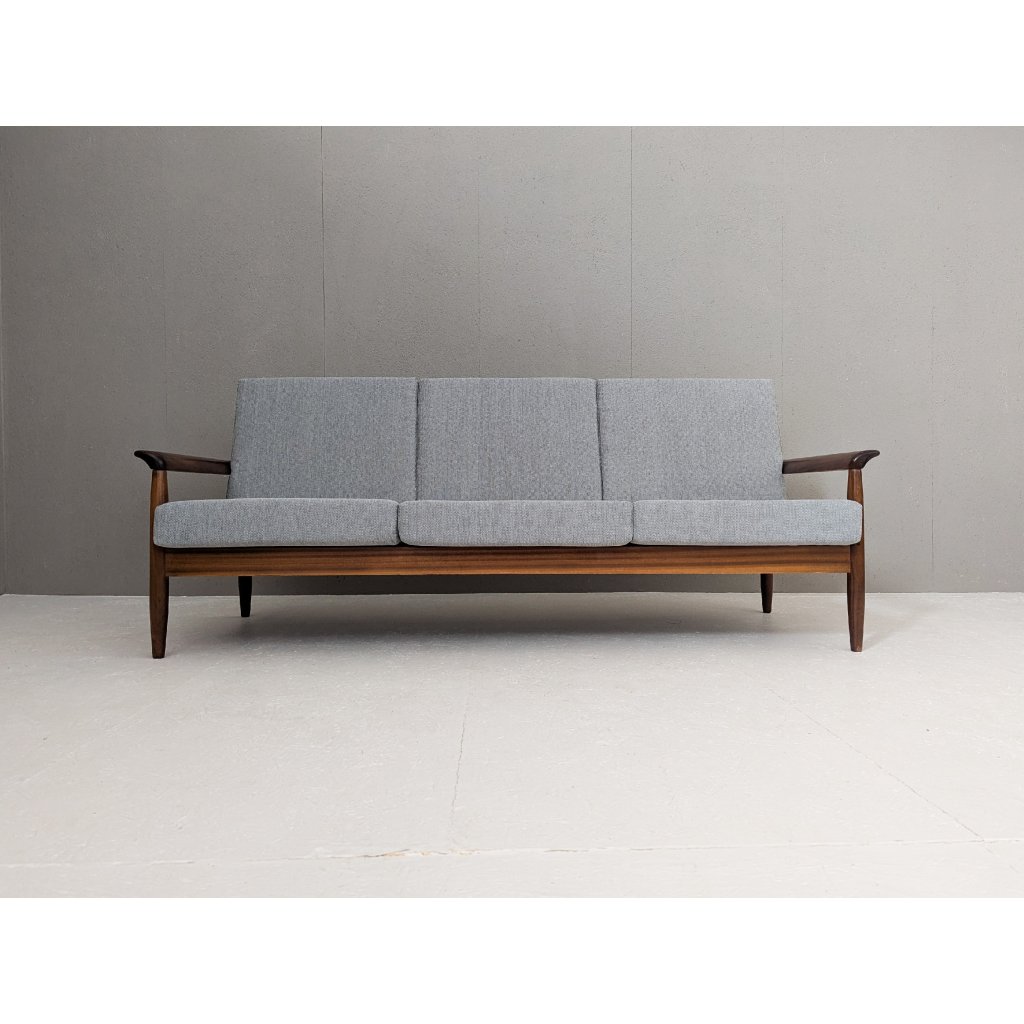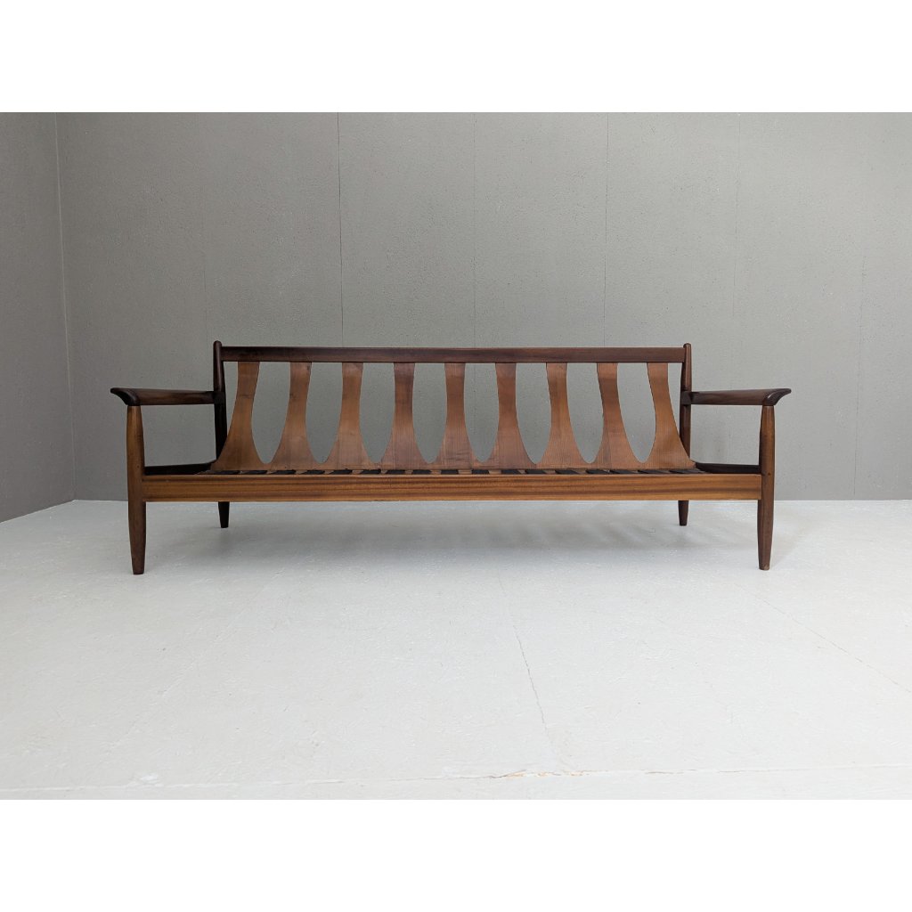 Elegant and timeless, this mid-century Danish teak sofa beautifully exemplifies the design values of Scandinavian modernism—simplicity, craftsmanship, and functionality. Crafted from richly grained teak wood, the frame is sculpturally refined with gently tapered legs and softly contoured armrests, offering both visual lightness and sturdy support. The expressive backrest features a rhythmic, wave-like slat design that adds dynamic sophistication from every angle.