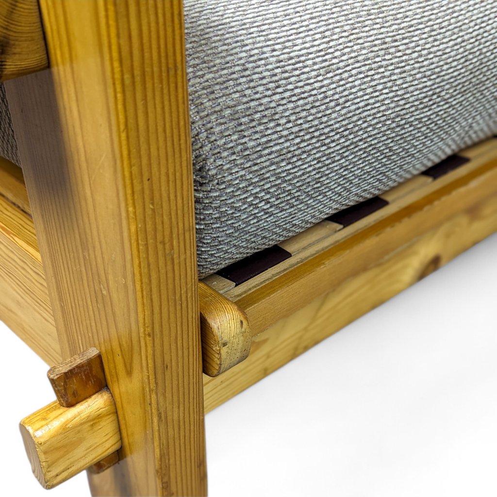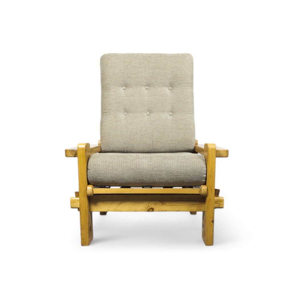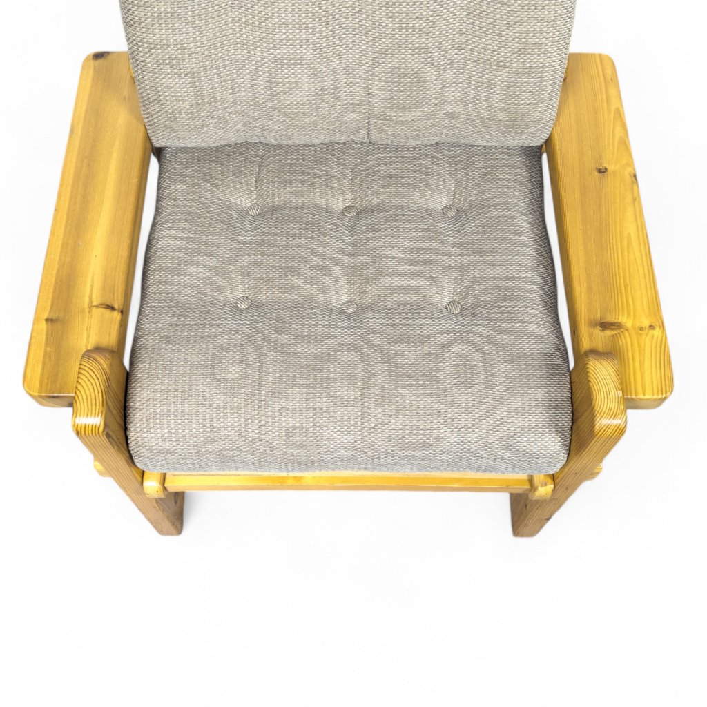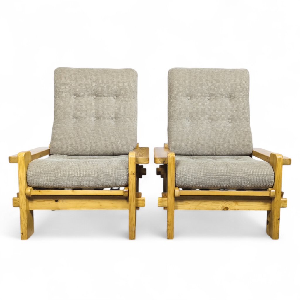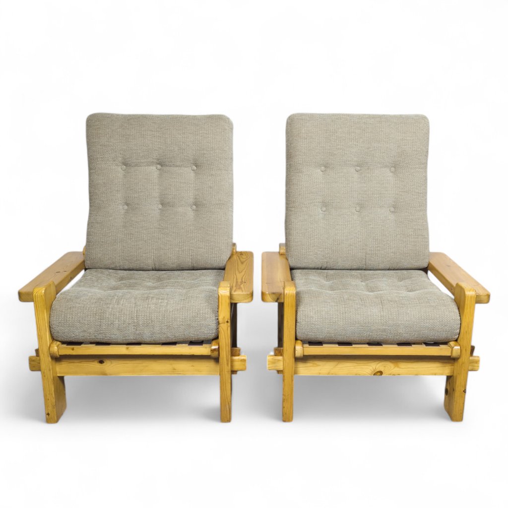Pair of solid pine wood armchairs by Yngve Ekström, Sweden, 1970s. Designed by Yngve Ekström for Swedese and manufactured in Sweden during the 1970s. The armchairs feature a solid pine wood frame in very good original condition, showcasing a beautiful patina. Both are structurally sound and have been recently reupholstered with fabric that closely matches the original design. The cushions have new fillings for added comfort. Height 86 cm, width 82 cm, depth 98 cm, seat height ca 40 cm.