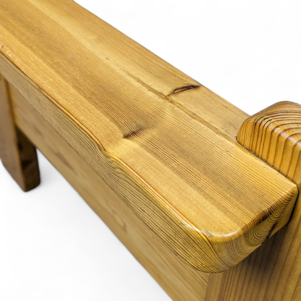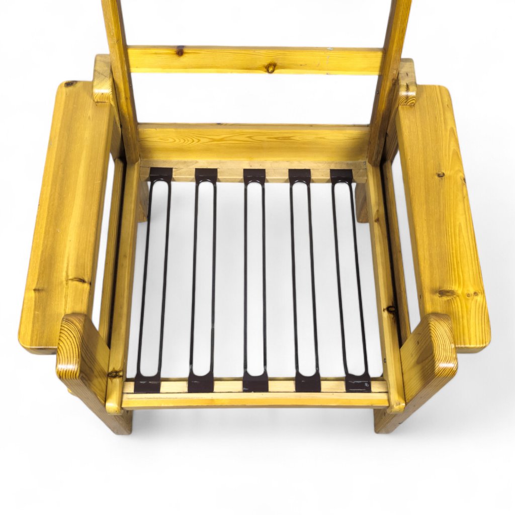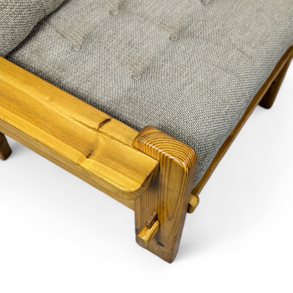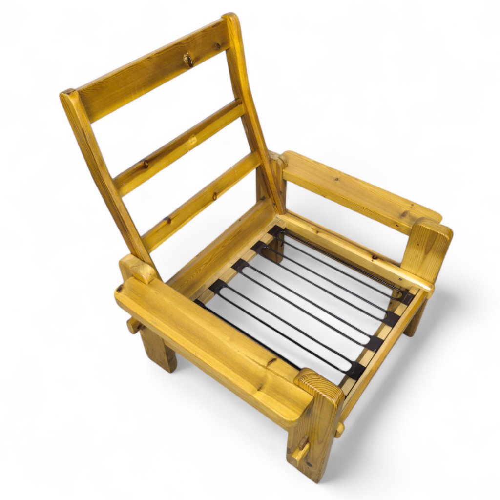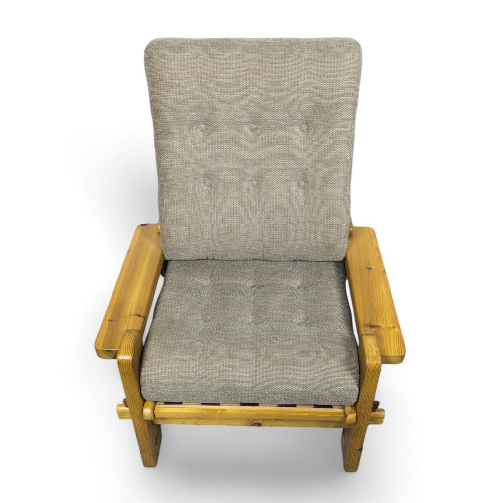 Pair of solid pine wood armchairs by Yngve Ekström, Sweden, 1970s. Designed by Yngve Ekström for Swedese and manufactured in Sweden during the 1970s. The armchairs feature a solid pine wood frame in very good original condition, showcasing a beautiful patina. Both are structurally sound and have been recently reupholstered with fabric that closely matches the original design. The cushions have new fillings for added comfort. Height 86 cm, width 82 cm, depth 98 cm, seat height ca 40 cm.