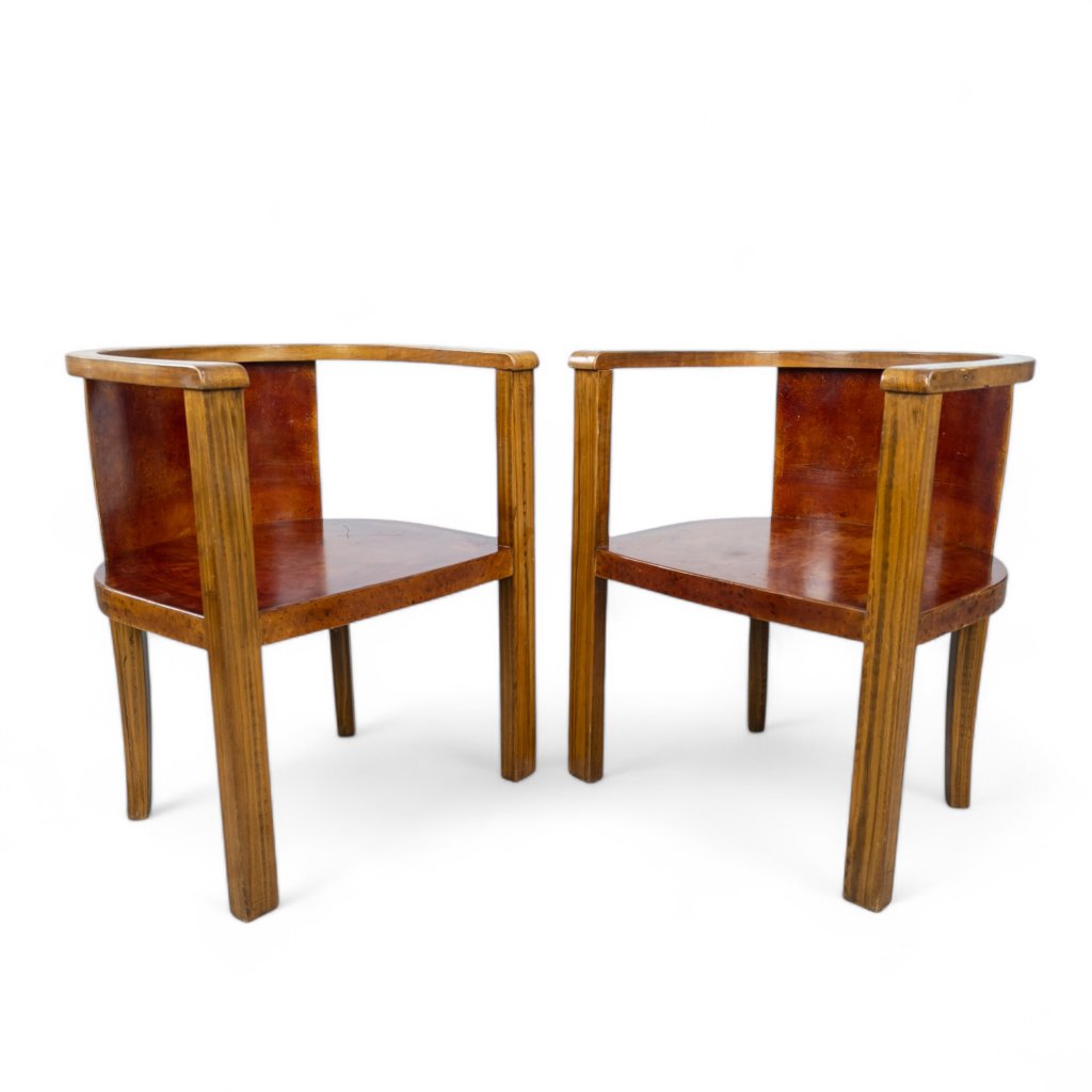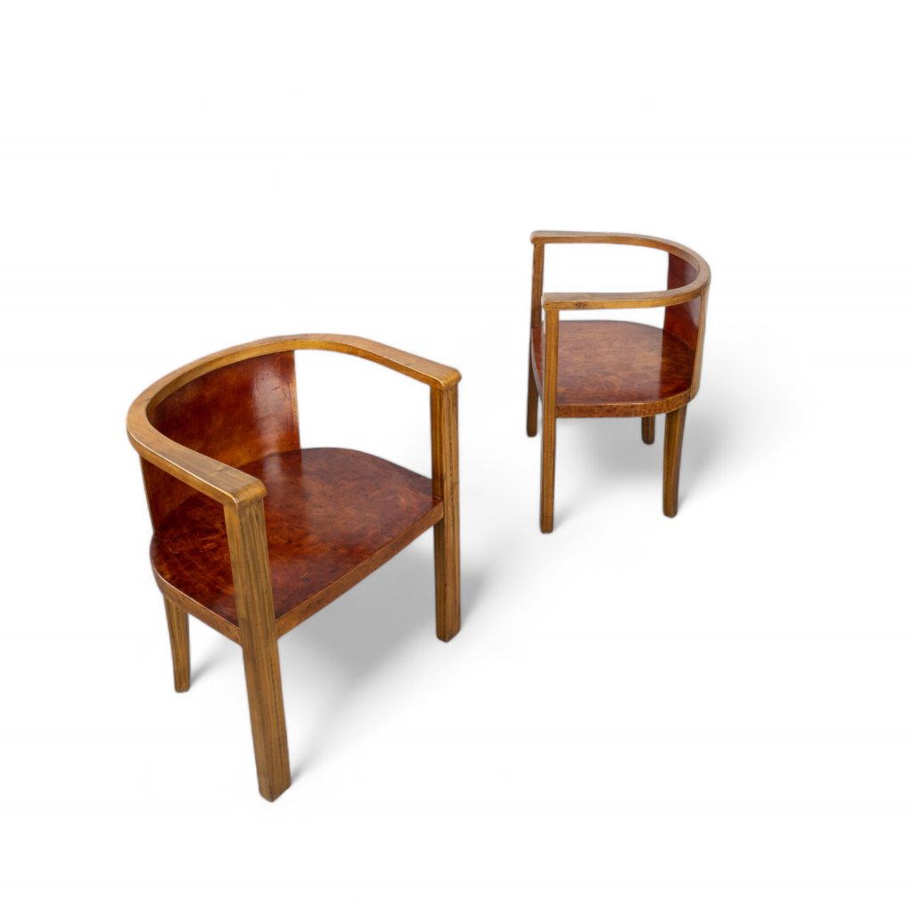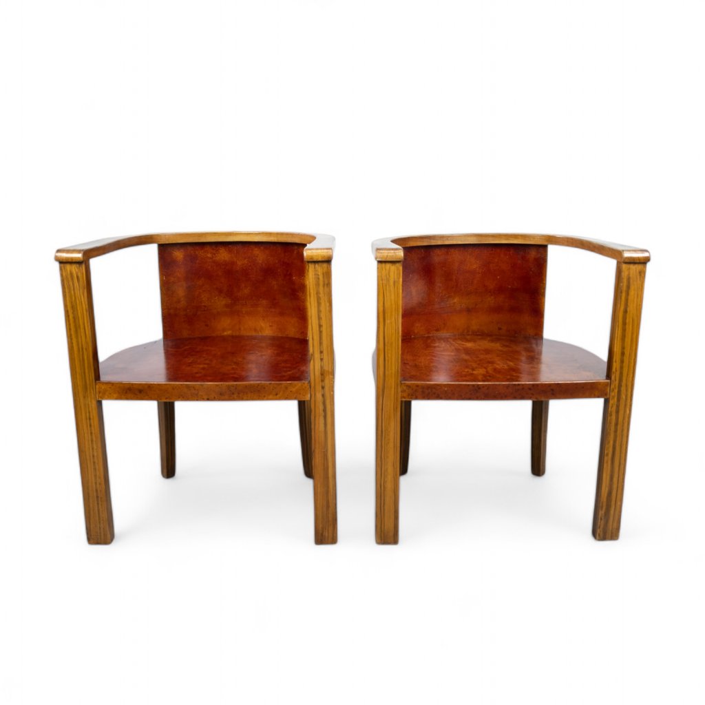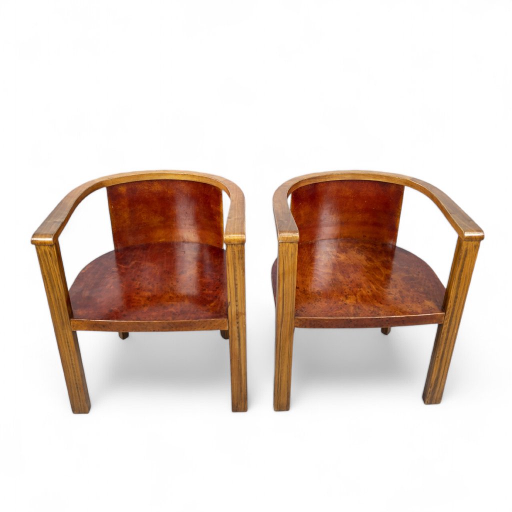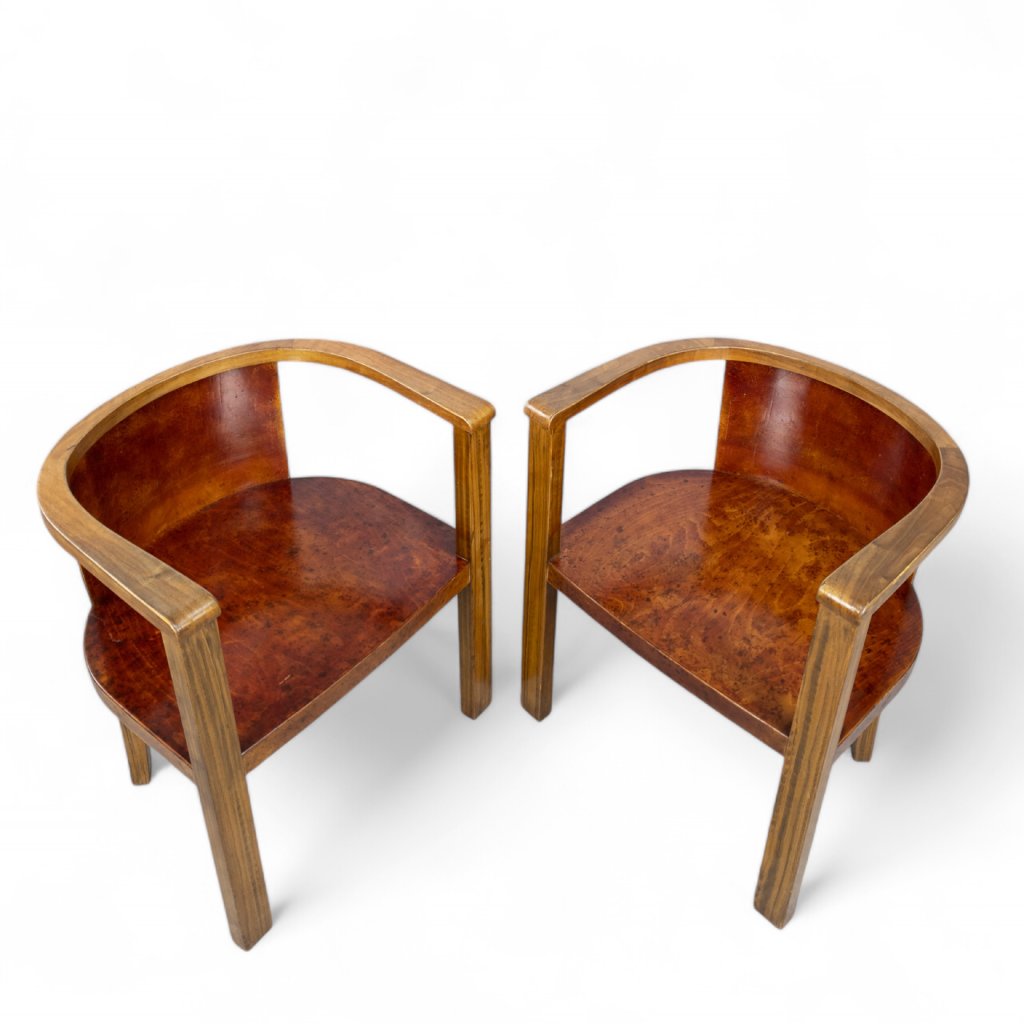 Crafted from solid oak and walnut burl-veneered plywood, this pair is in very good original condition, featuring a beautiful patina. Structurally sound. The dimensions are: height 70 cm, seat height 40 cm (without cushion), width 69 cm, and depth 49 cm.