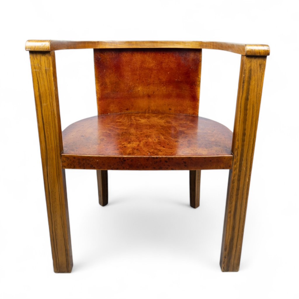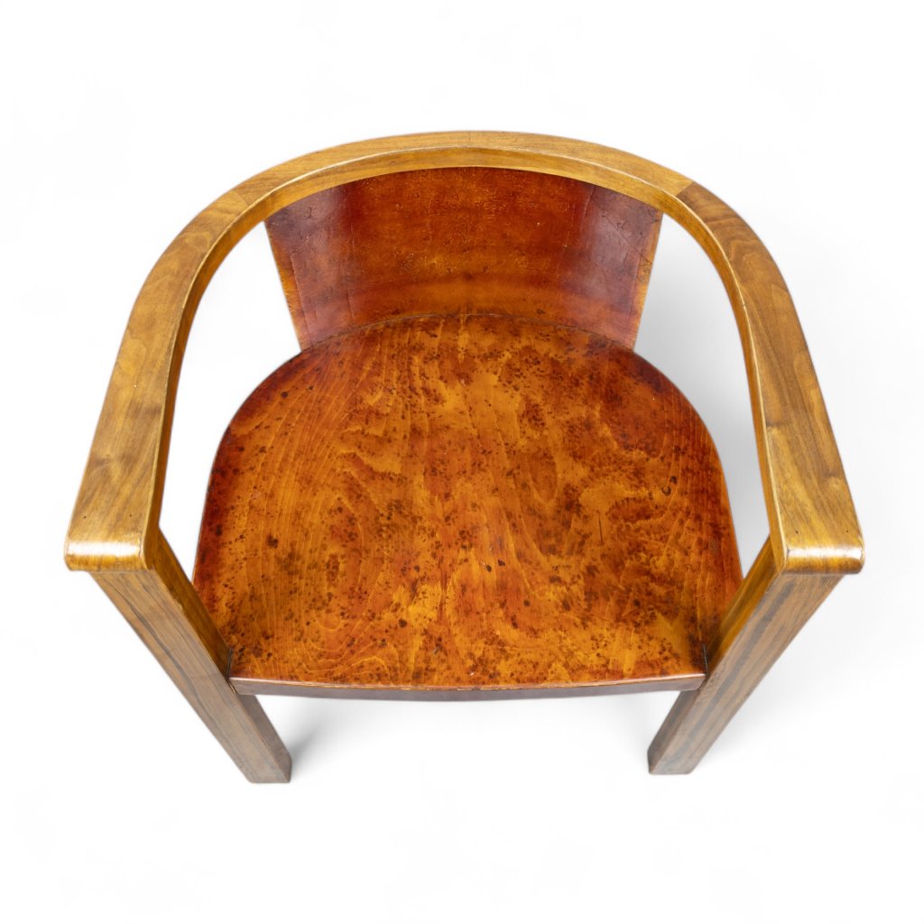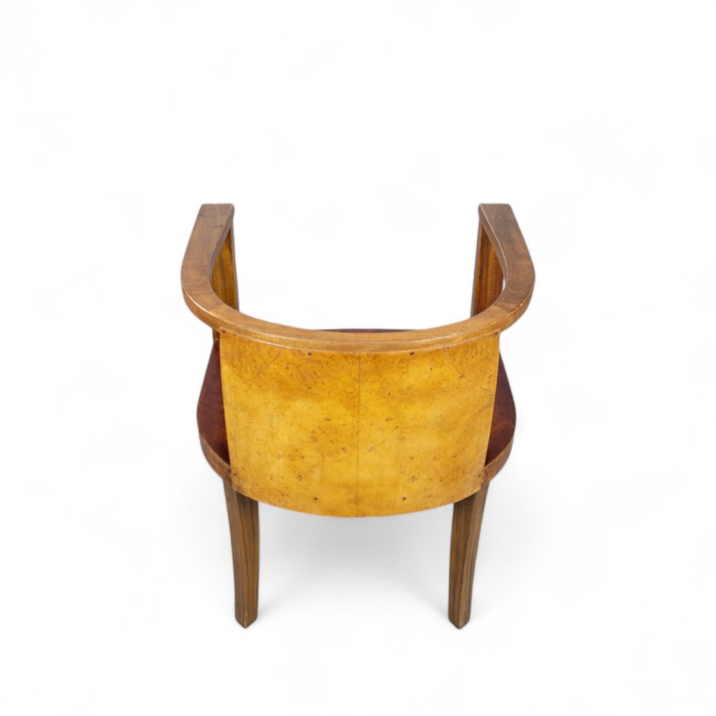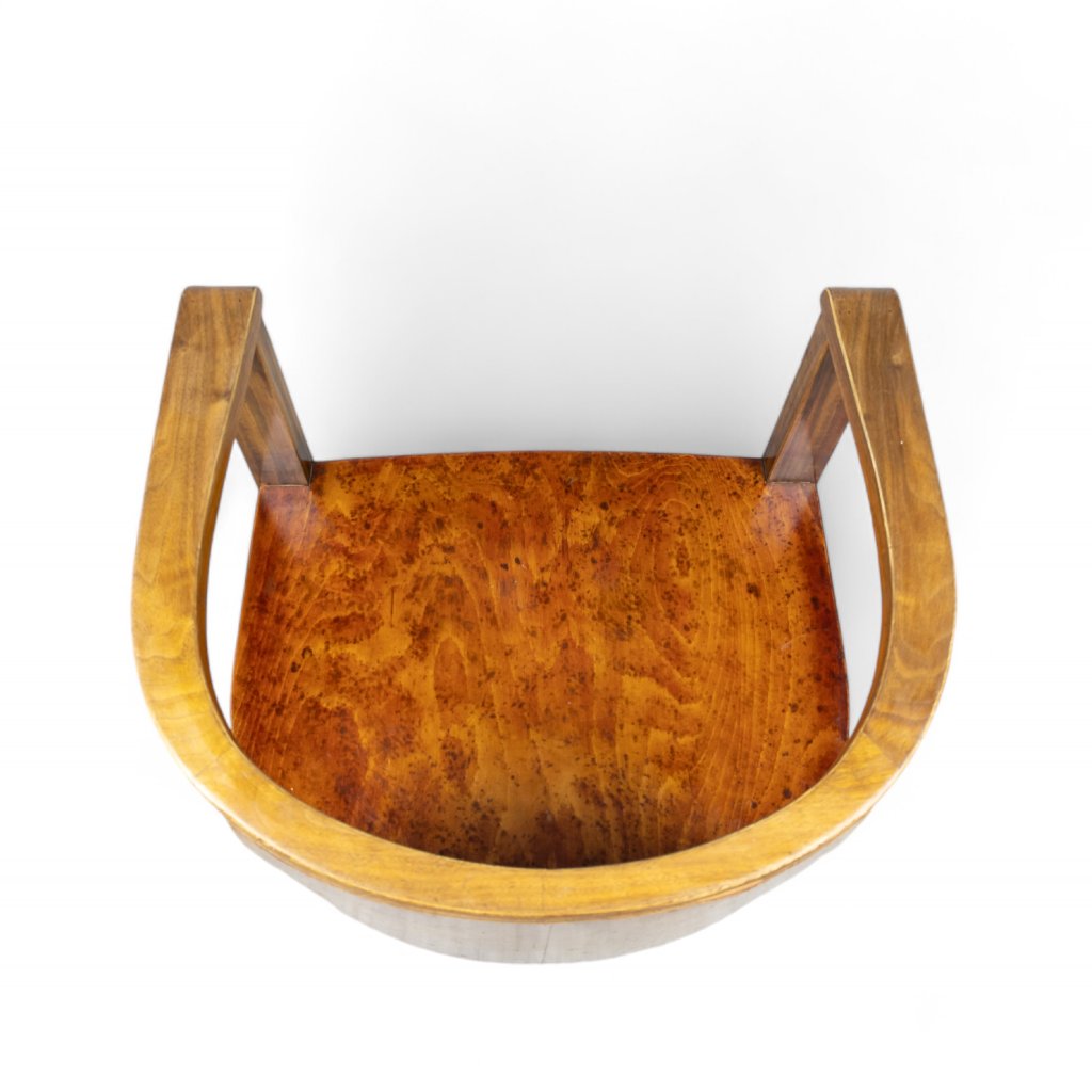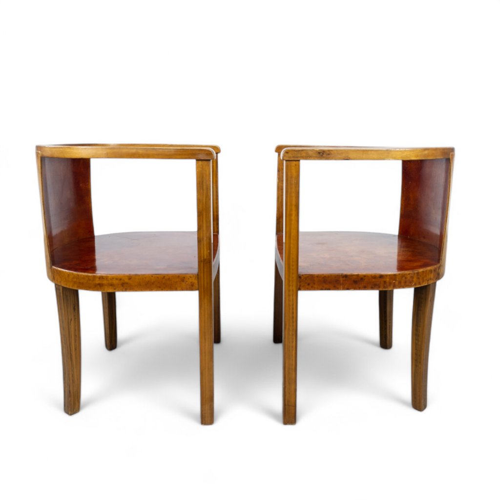 Crafted from solid oak and walnut burl-veneered plywood, this pair is in very good original condition, featuring a beautiful patina. Structurally sound. The dimensions are: height 70 cm, seat height 40 cm (without cushion), width 69 cm, and depth 49 cm.