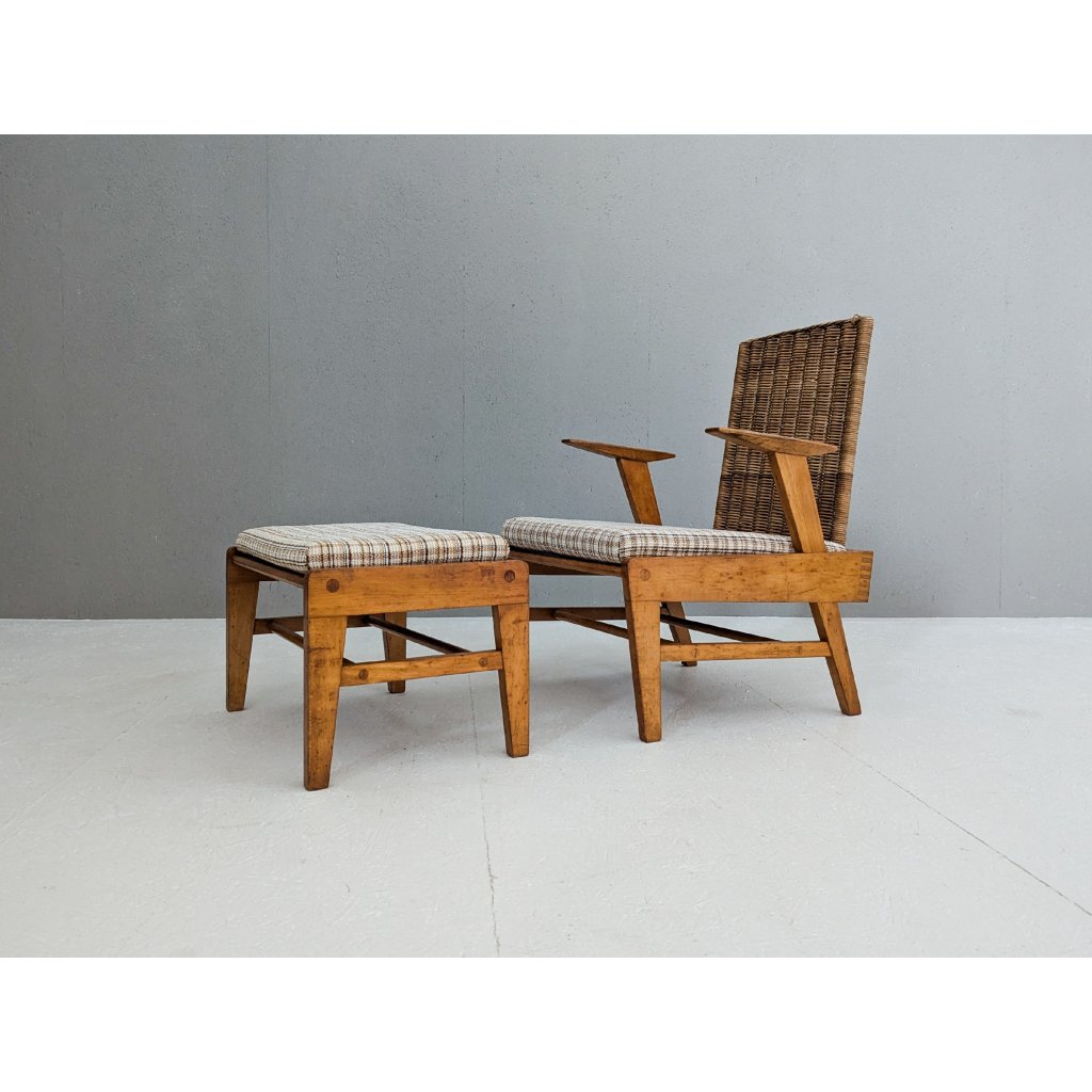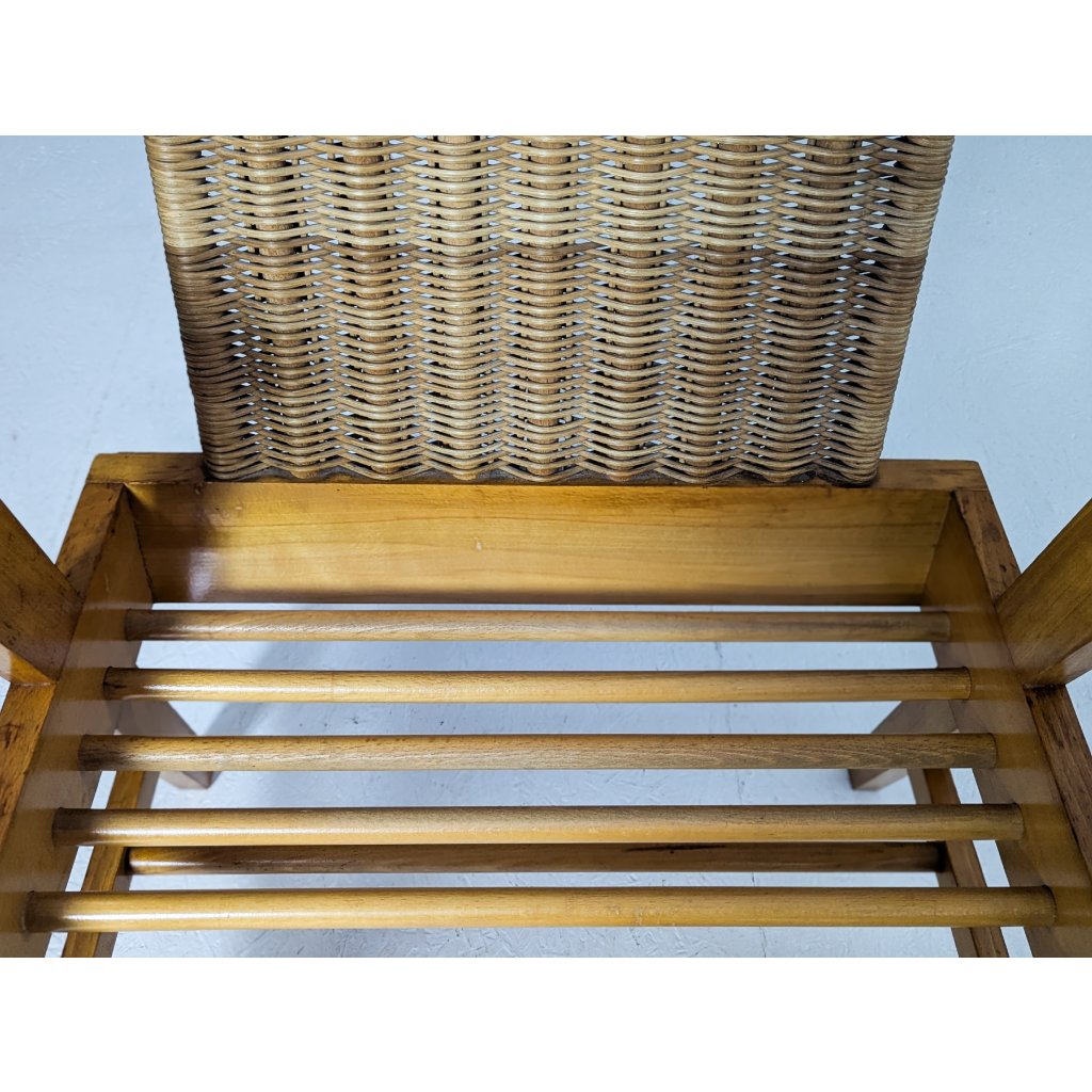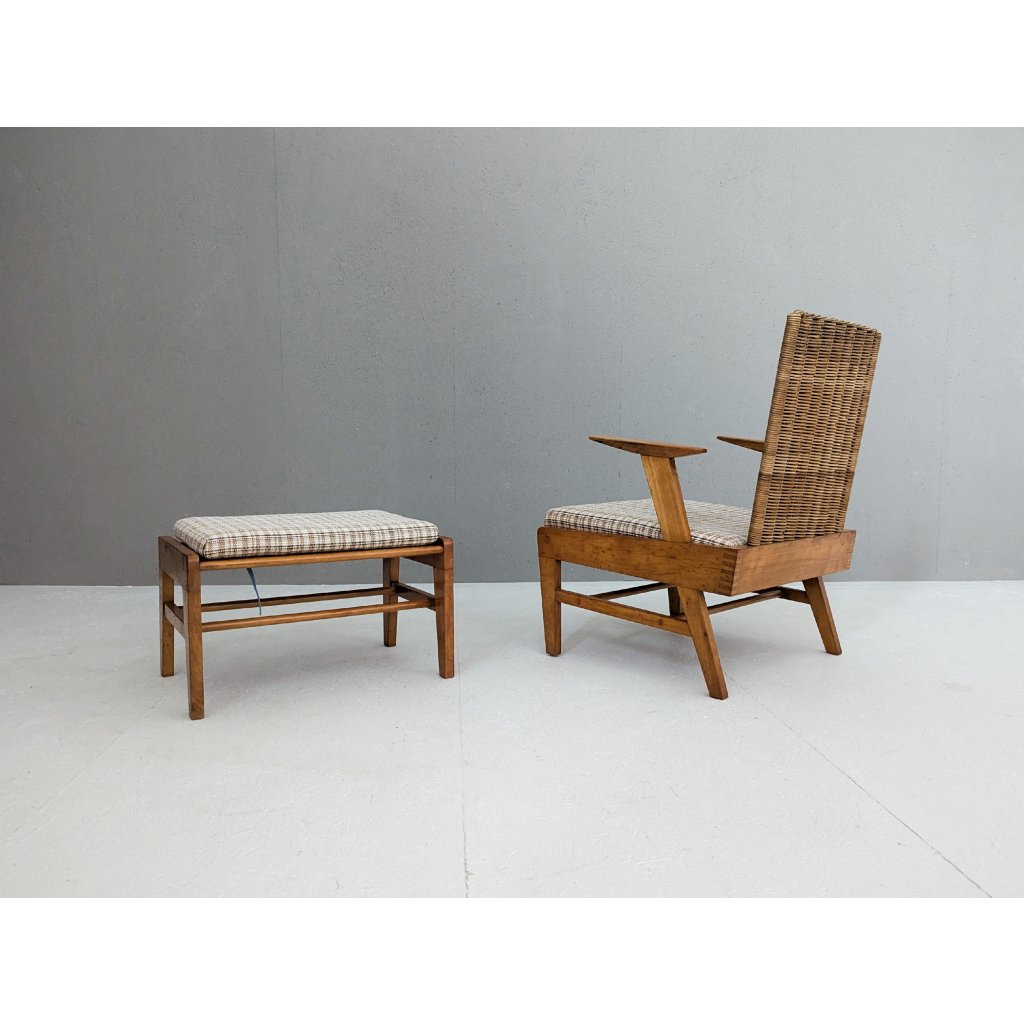 A striking example of mid-century Czech craftsmanship, this sculptural beech and rattan armchair with matching footstool was produced by ÚĽUV (Ústředí lidové umělecké výroby) in the 1960s. Known for its unique blend of traditional handcraft and modernist design principles, ÚĽUV created furniture that emphasized natural materials, structural clarity, and everyday functionality.