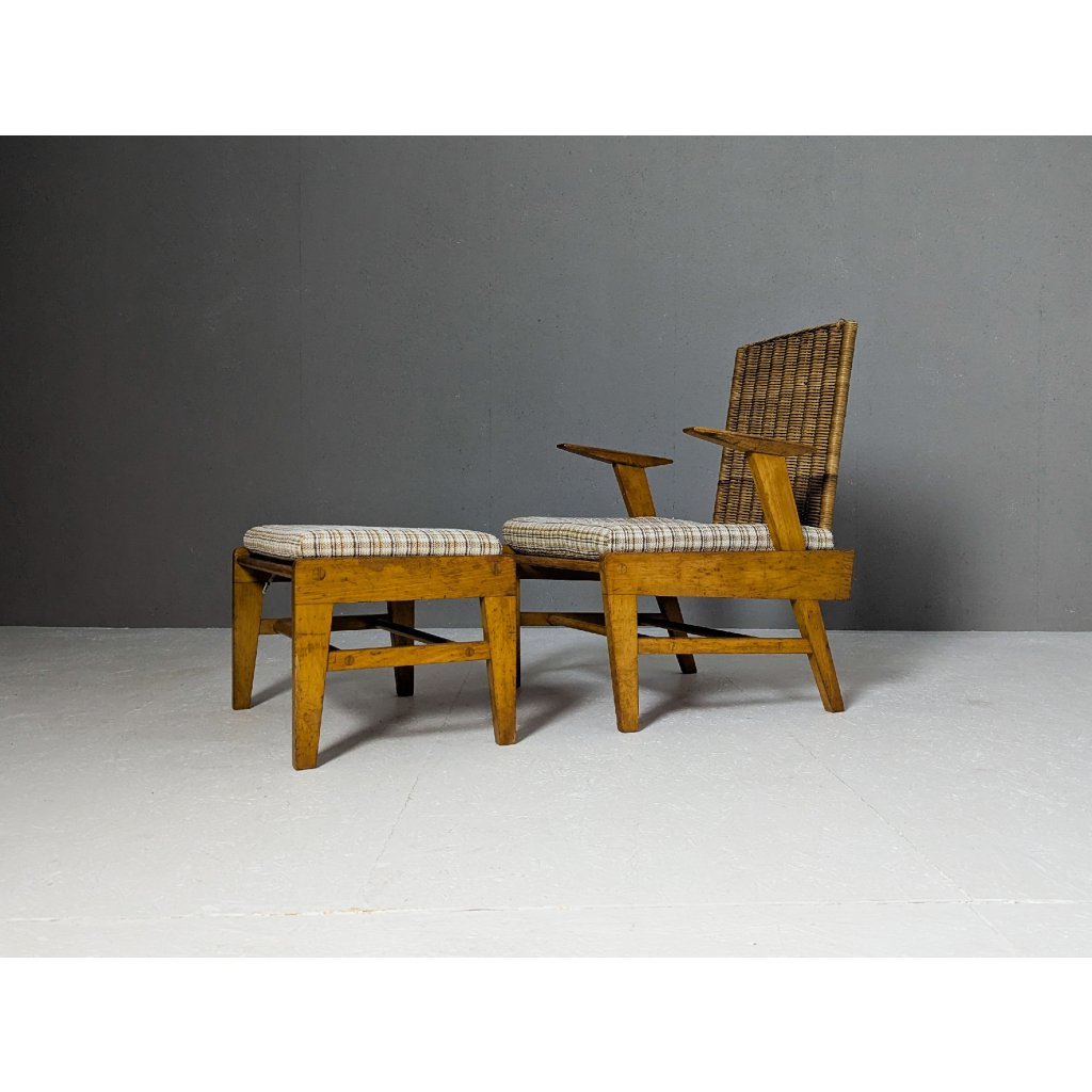 The armchair and footstool are in good vintage condition, structurally sound, with light signs of use consistent with age. An inviting and characterful ensemble that works beautifully in both modern and eclectic interiors.