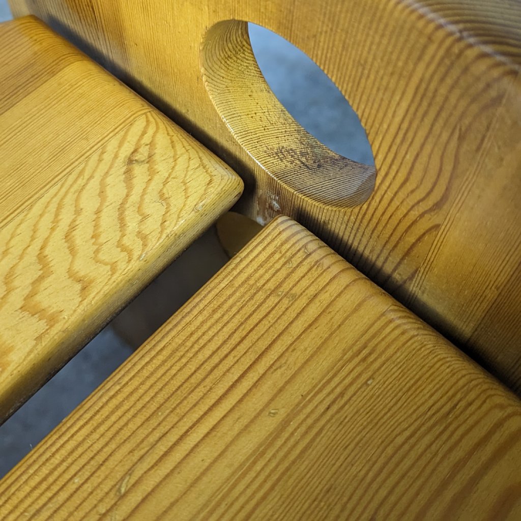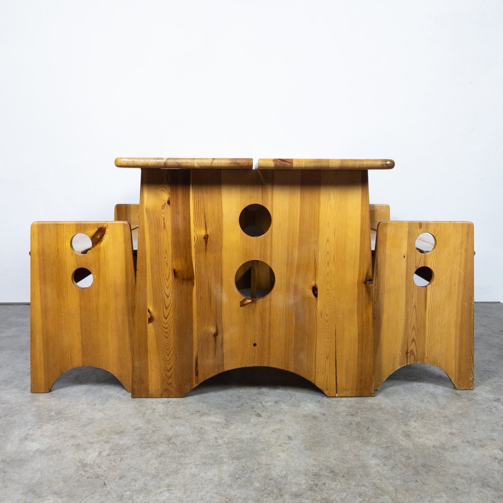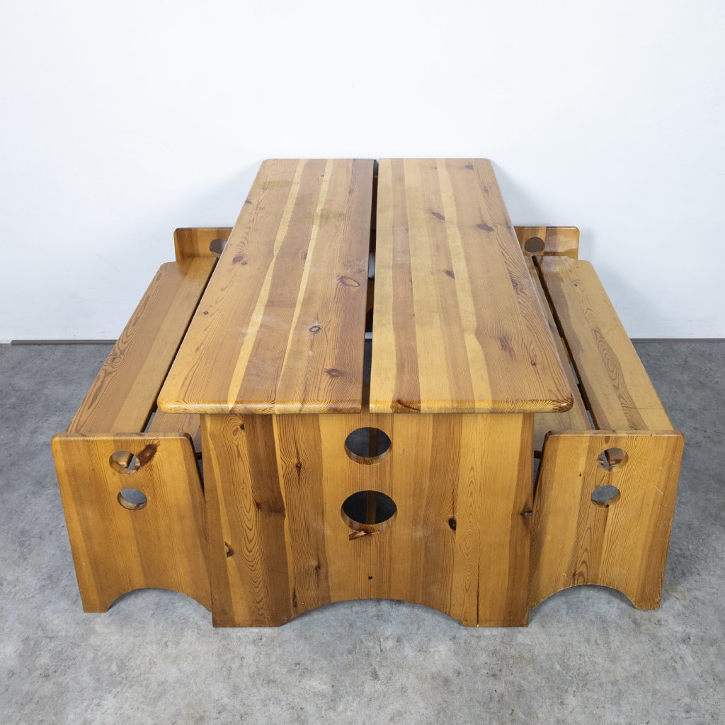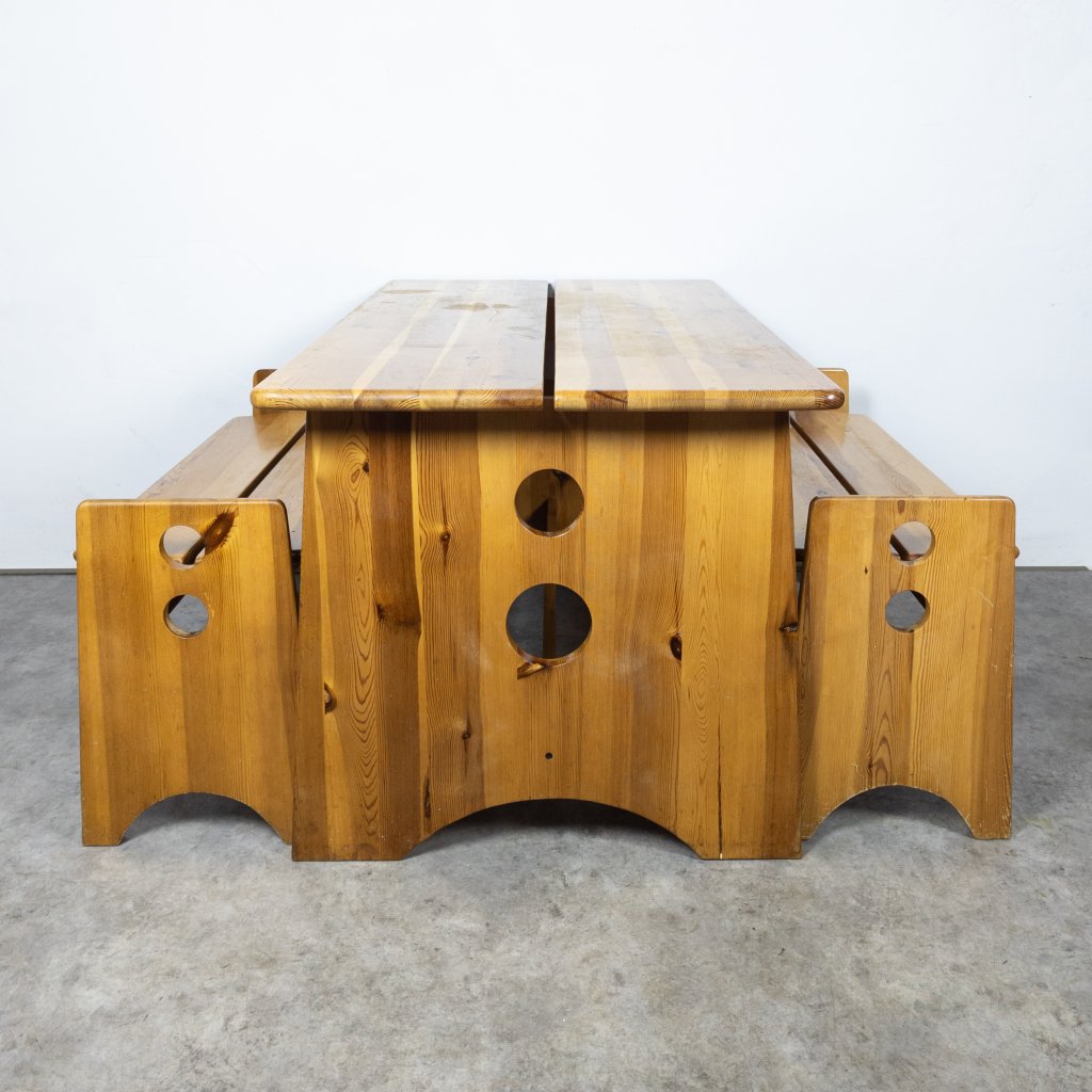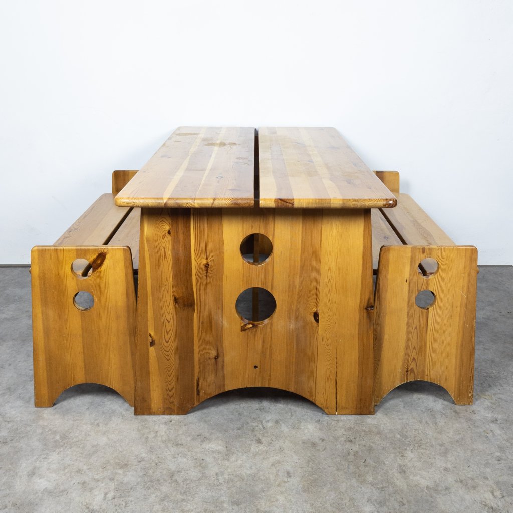 Matching dining table available. The set accommodates four people comfortably, with benches that can slide completely underneath the tabletop.