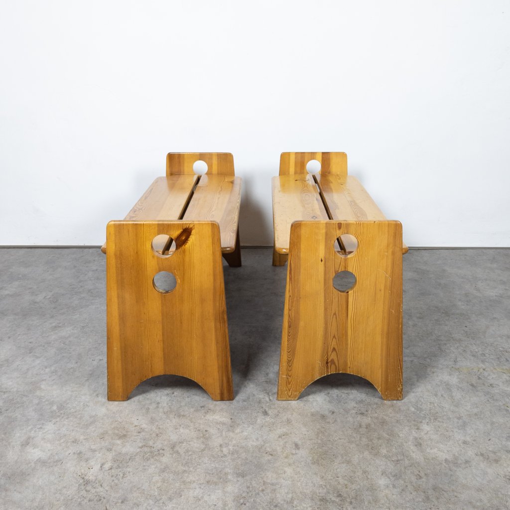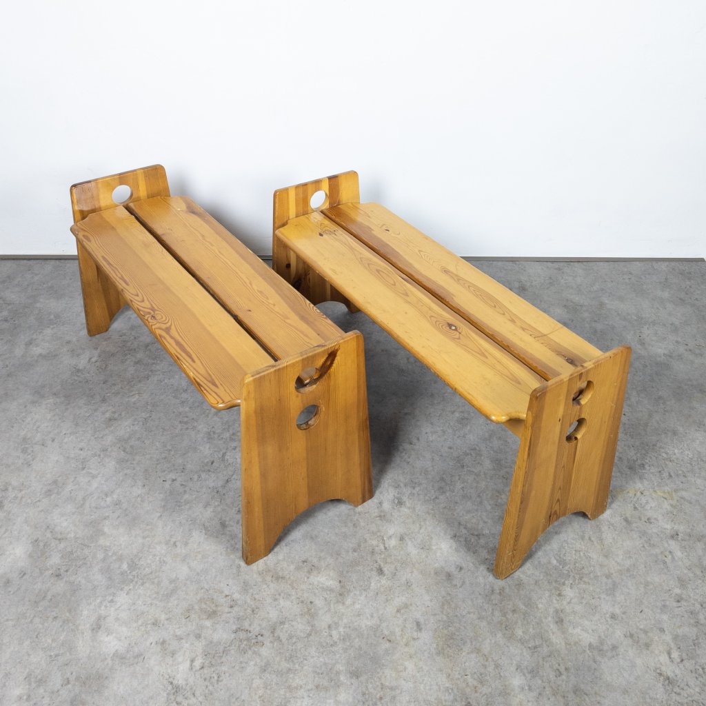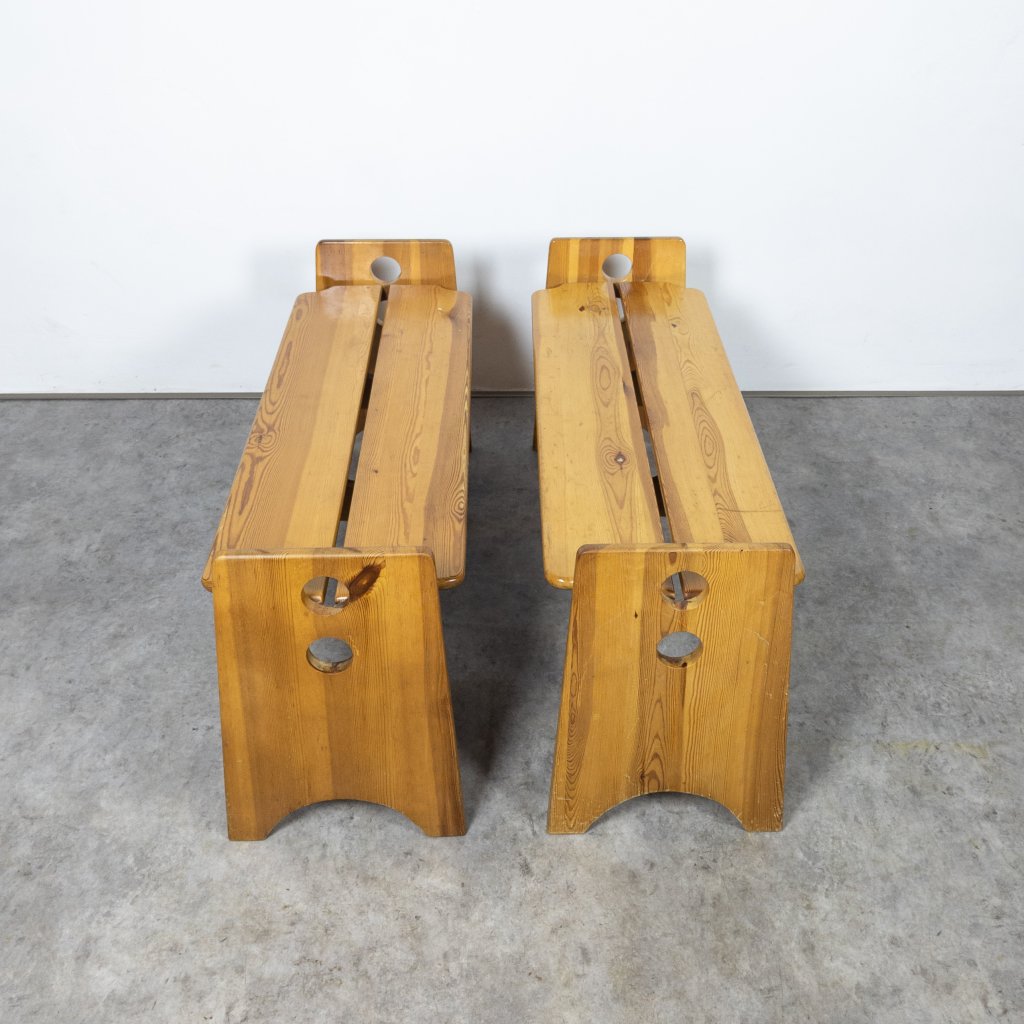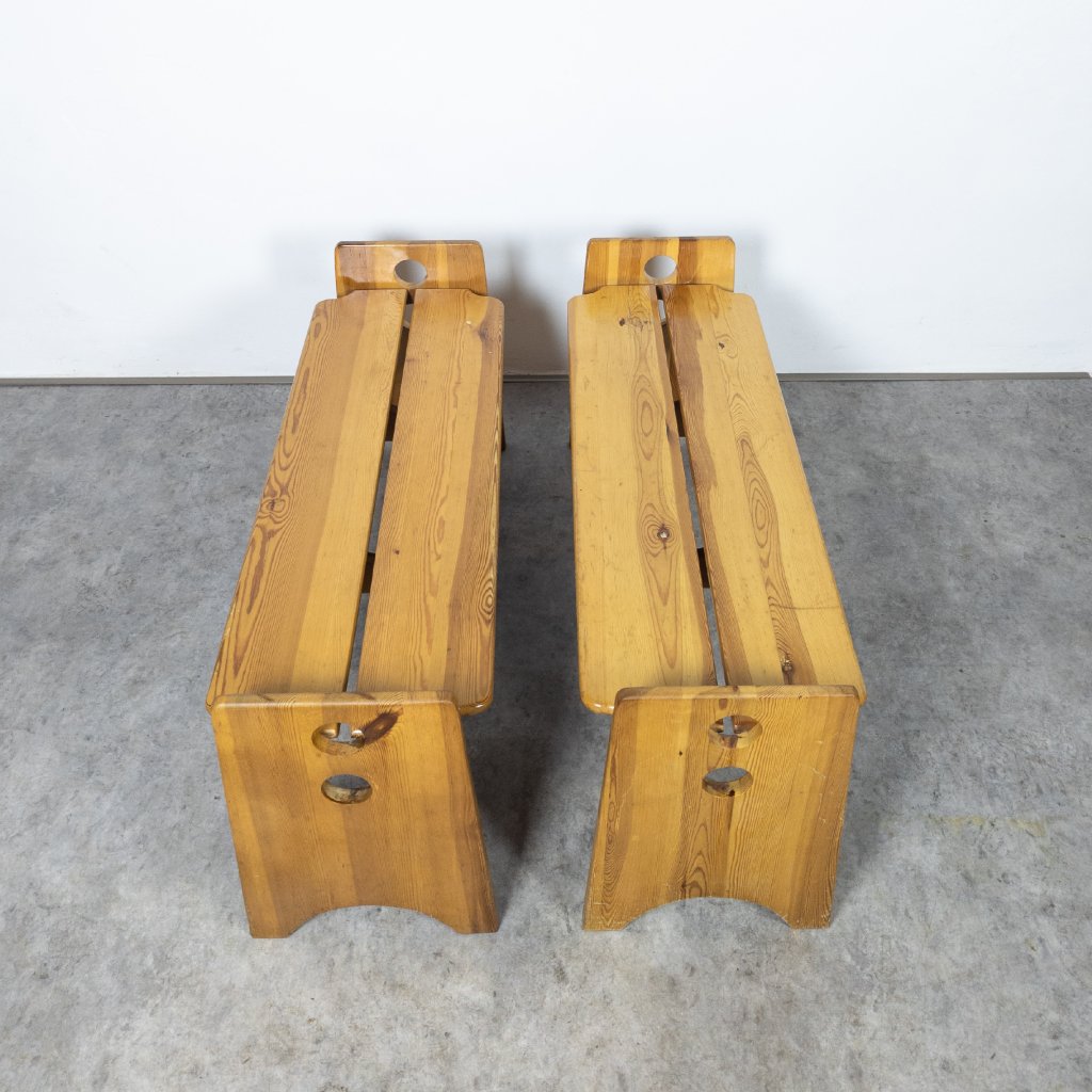 Pair of durable, solid pine wood benches in original condition. Exceptionally sturdy, showcasing impressive Scandinavian craftsmanship. Displaying typical signs of wear and age, yet structurally sound. Length 112 cm, depth 37 cm, seat height 44 cm.