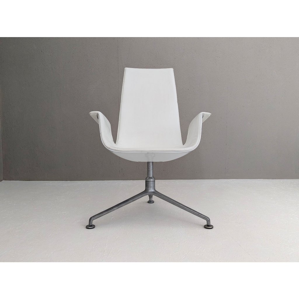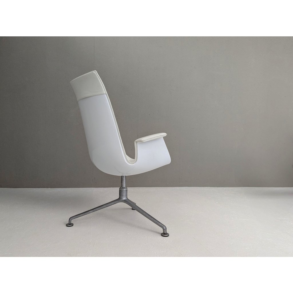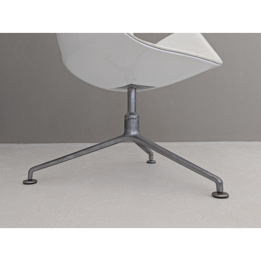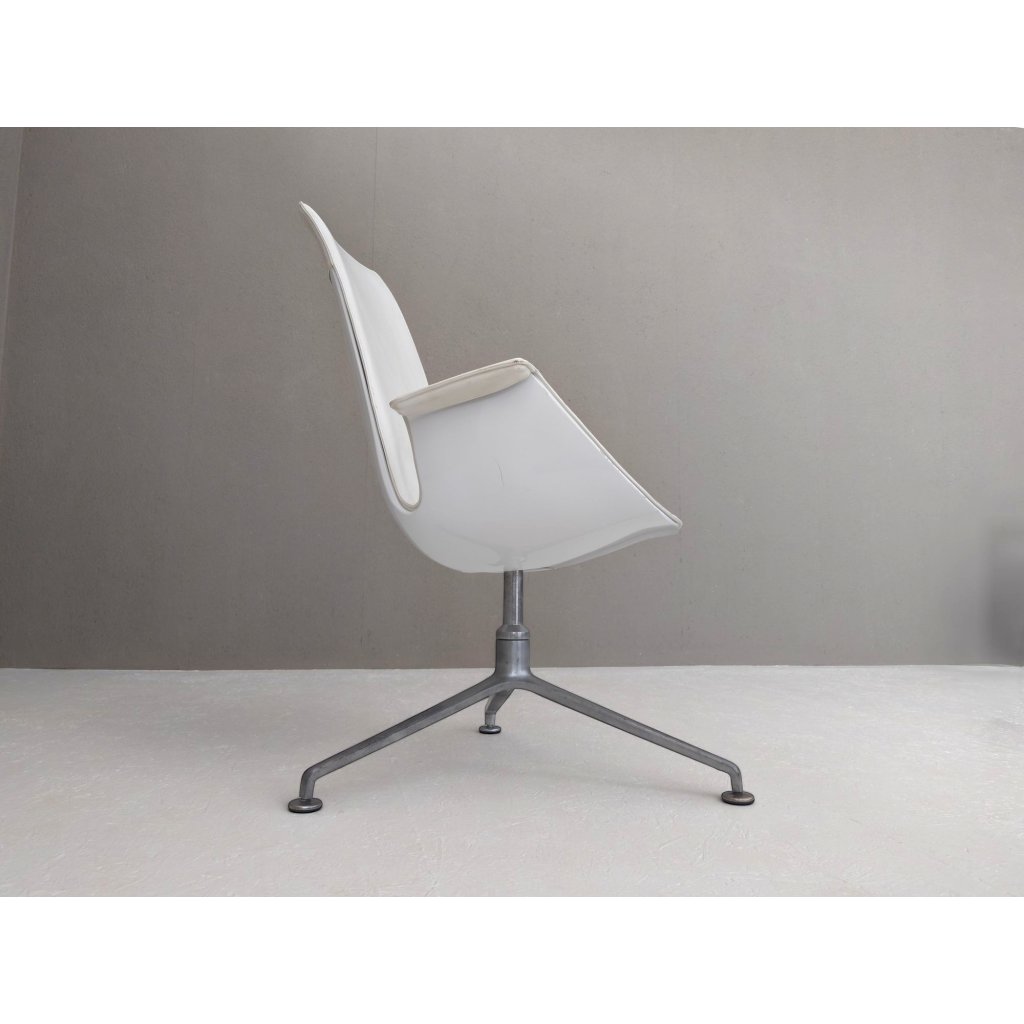Manufactured by Walter Knoll, the chair features a sculptural fiberglass shell that offers both comfort and a sense of lightness. The shell is covered in white leather, adding a touch of luxury while maintaining the chair’s clean, streamlined look. It is supported by an elegant aluminum tripod base, which gives it a distinctive architectural presence.