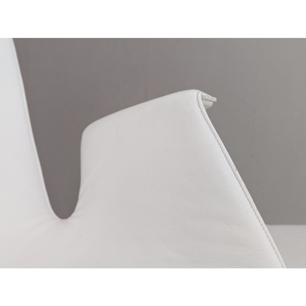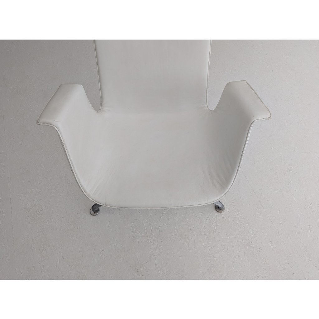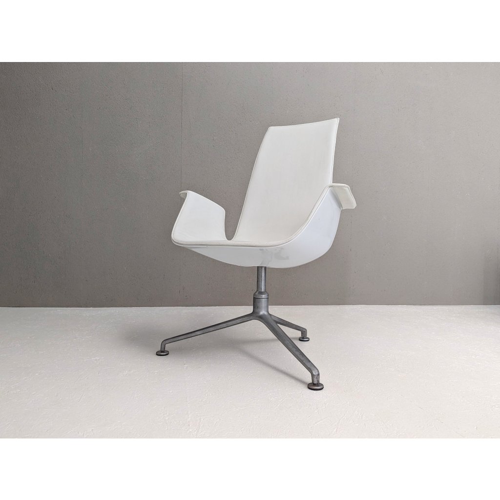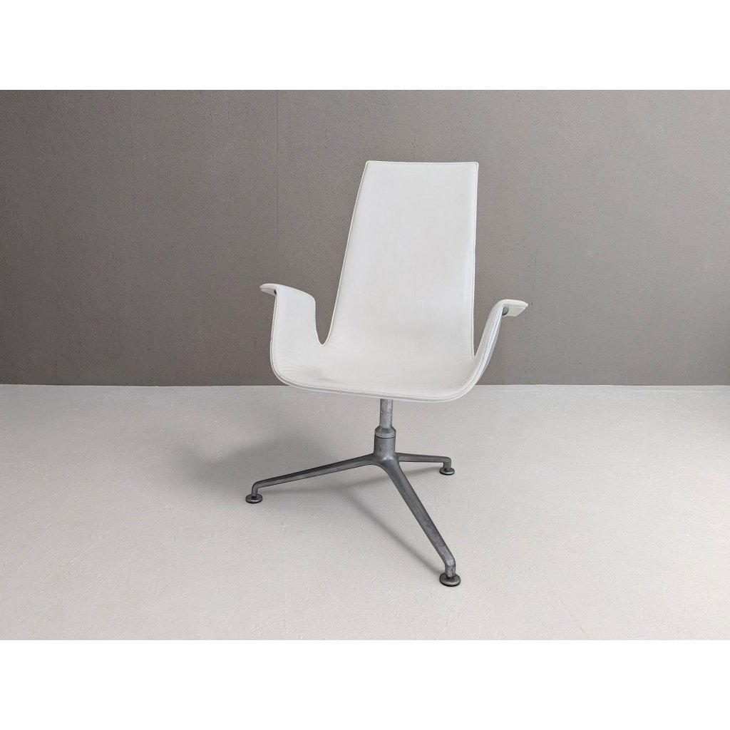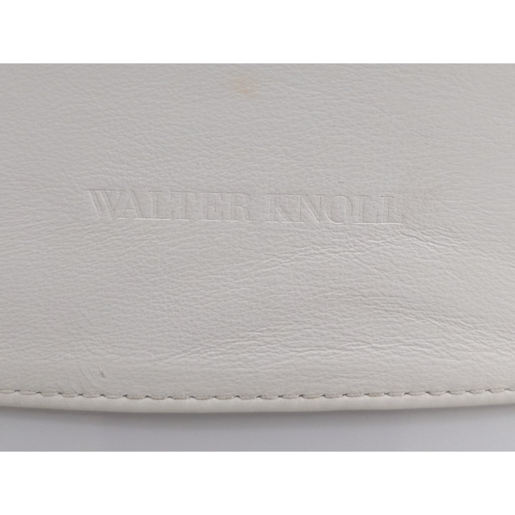 Manufactured by Walter Knoll, the chair features a sculptural fiberglass shell that offers both comfort and a sense of lightness. The shell is covered in white leather, adding a touch of luxury while maintaining the chair’s clean, streamlined look. It is supported by an elegant aluminum tripod base, which gives it a distinctive architectural presence.