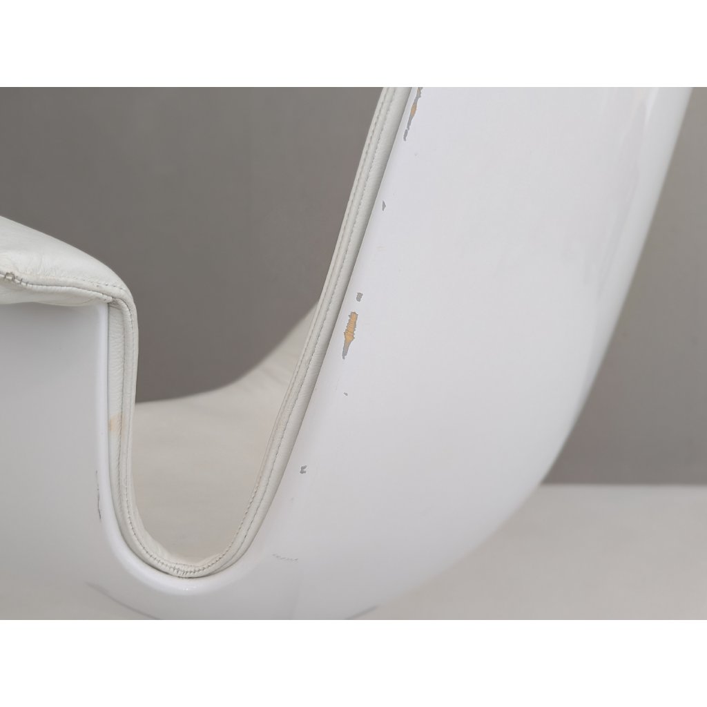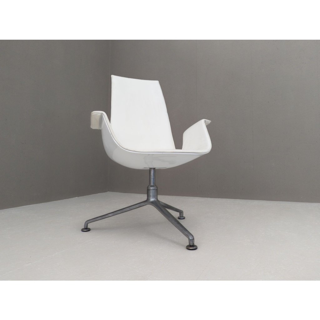 This particular piece, remains in good original condition, showing only minor signs of wear that are consistent with its age. The white leather upholstery is clean and free from any rips or tears, with just a few small surface scratches that do not detract from its overall appearance. Similarly, the fiberglass shell is structurally sound, with the lacquer exhibiting some minor scratches, typical for a chair of this vintage. Despite these subtle signs of use, the chair retains its strong form and iconic design, making it a striking addition to any modern interior. A testament to the enduring quality of mid-century craftsmanship, this FK6725 Tulip Chair is both a functional piece of furniture and a collectible work of design history.