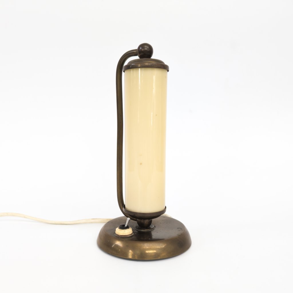 Beautiful Art Deco night stand lamp made of brass base with a cylindrical opaline glass shade. In good original condition, fully functional. Height 24 cm, diameter 11 cm.