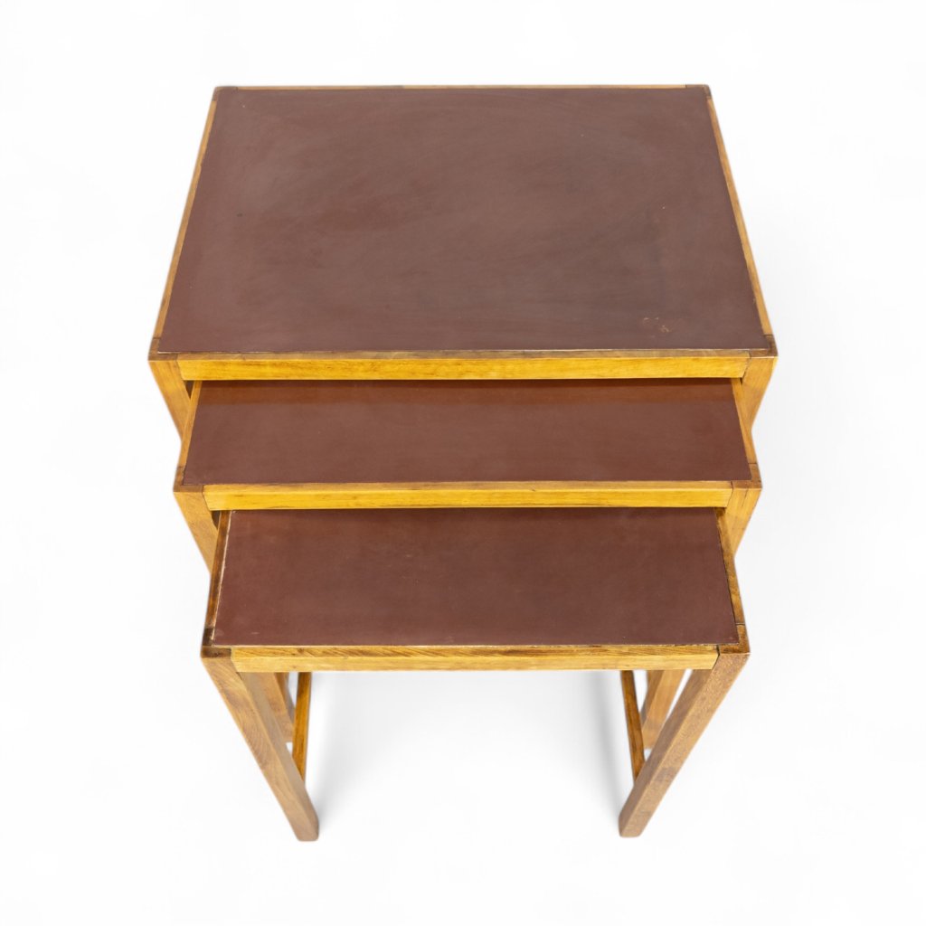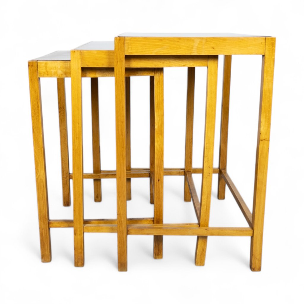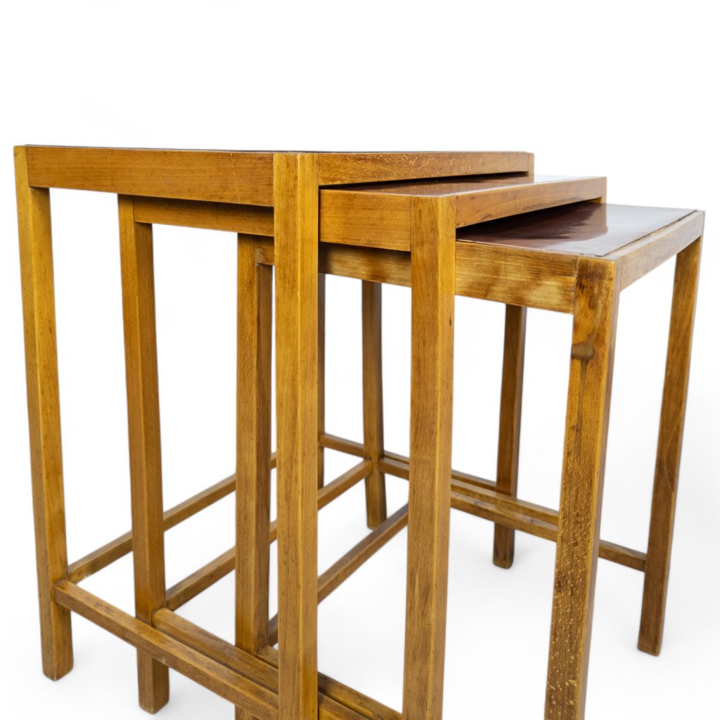 Crafted from oak wood, the tables showcase a sleek and minimalist design, complemented by dark bakelite tops, a material popular in early modern furniture for its durability and aesthetic appeal. The set includes three tables of varying sizes, designed to nest seamlessly within one another for space-saving convenience. The maximum dimensions are 55 × 40 × 65.5 cm, making them versatile for a range of interior applications.
