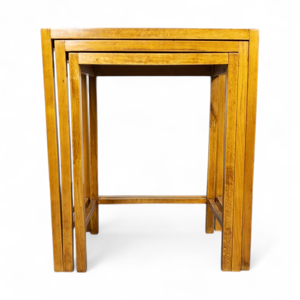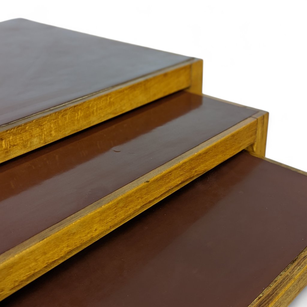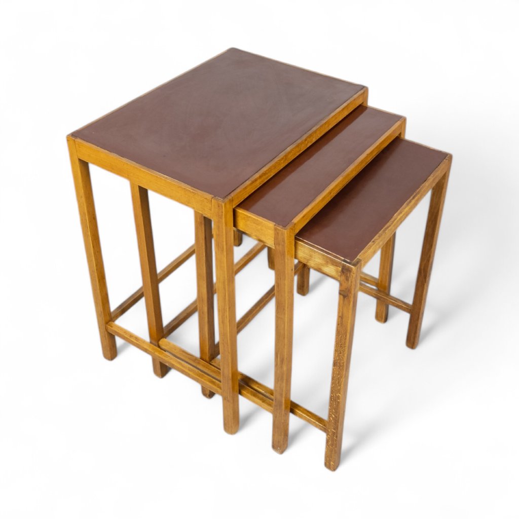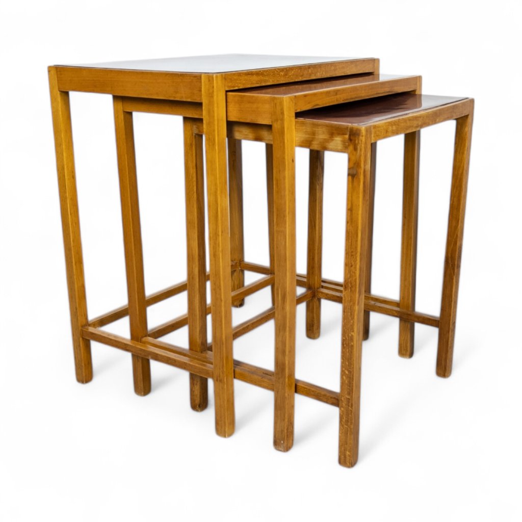 Crafted from oak wood, the tables showcase a sleek and minimalist design, complemented by dark bakelite tops, a material popular in early modern furniture for its durability and aesthetic appeal. The set includes three tables of varying sizes, designed to nest seamlessly within one another for space-saving convenience. The maximum dimensions are 55 × 40 × 65.5 cm, making them versatile for a range of interior applications.
