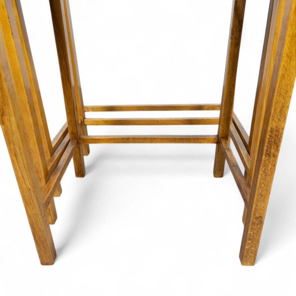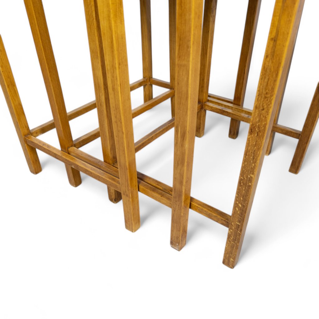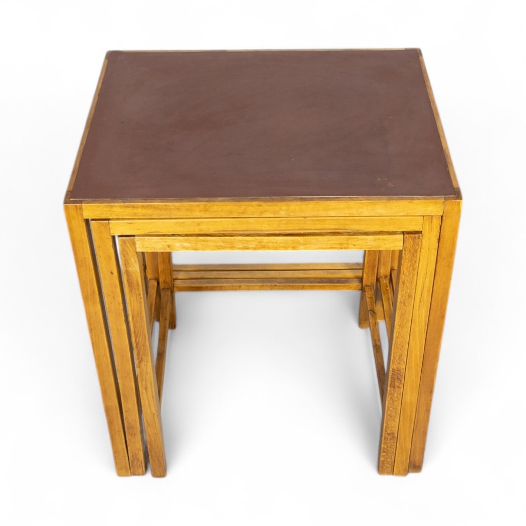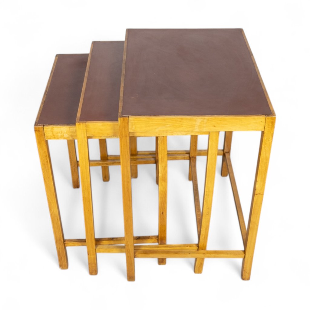 Bauhaus-style nesting tables, model H-50, designed by the renowned Jindřich Halabala. These tables were manufactured by UP Závody in Czechoslovakia during the 1930s, a time when modernist design flourished. Identified under the catalogue number H-50, this set features a unique variable-anchored strut mechanism, reflecting the innovative spirit of the era.