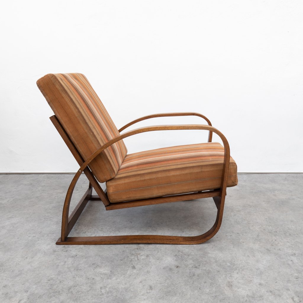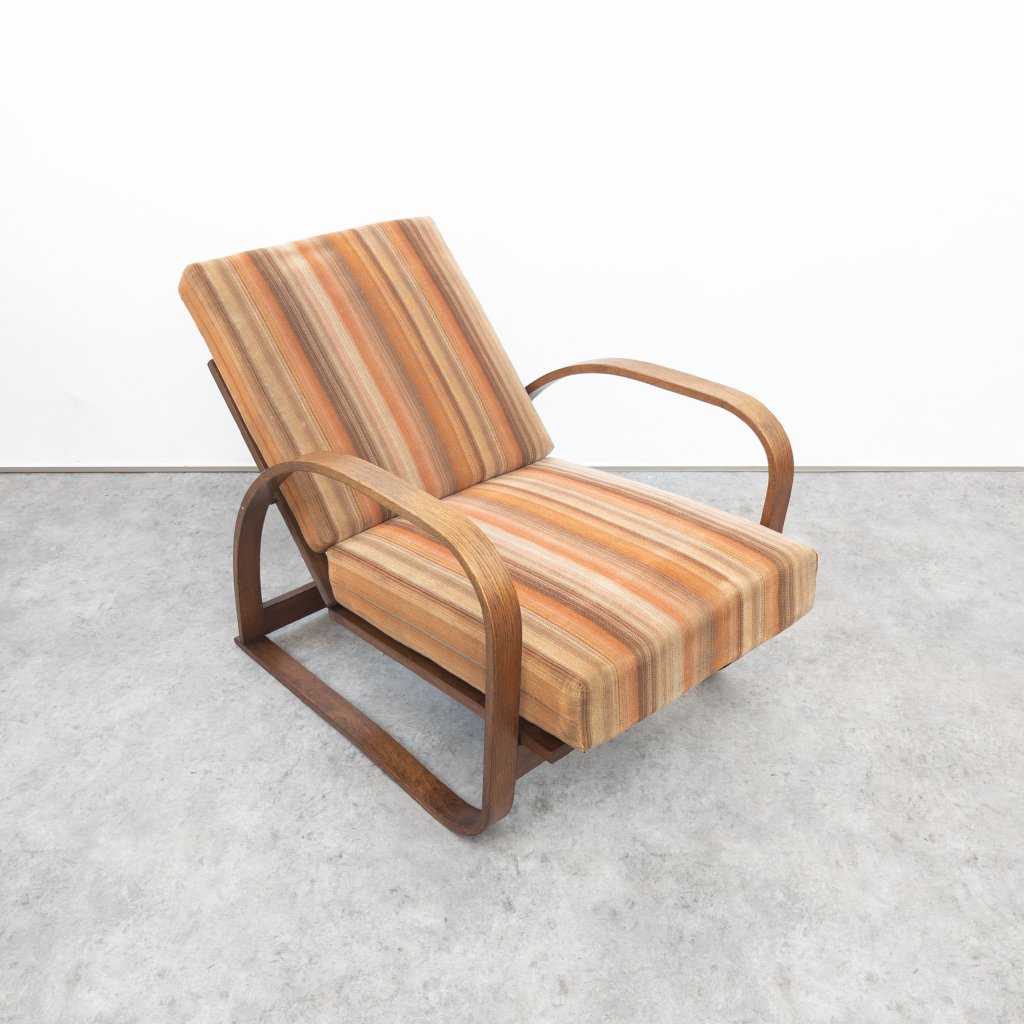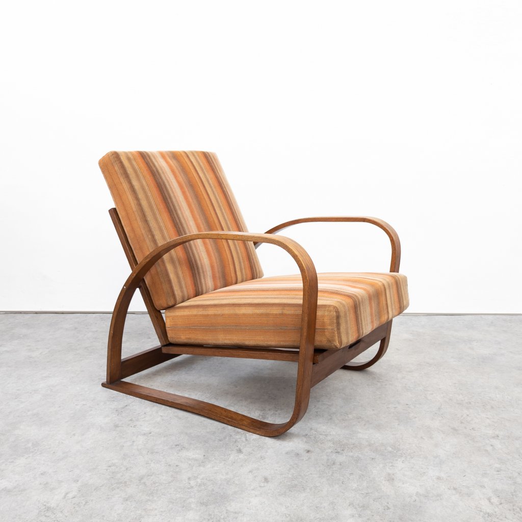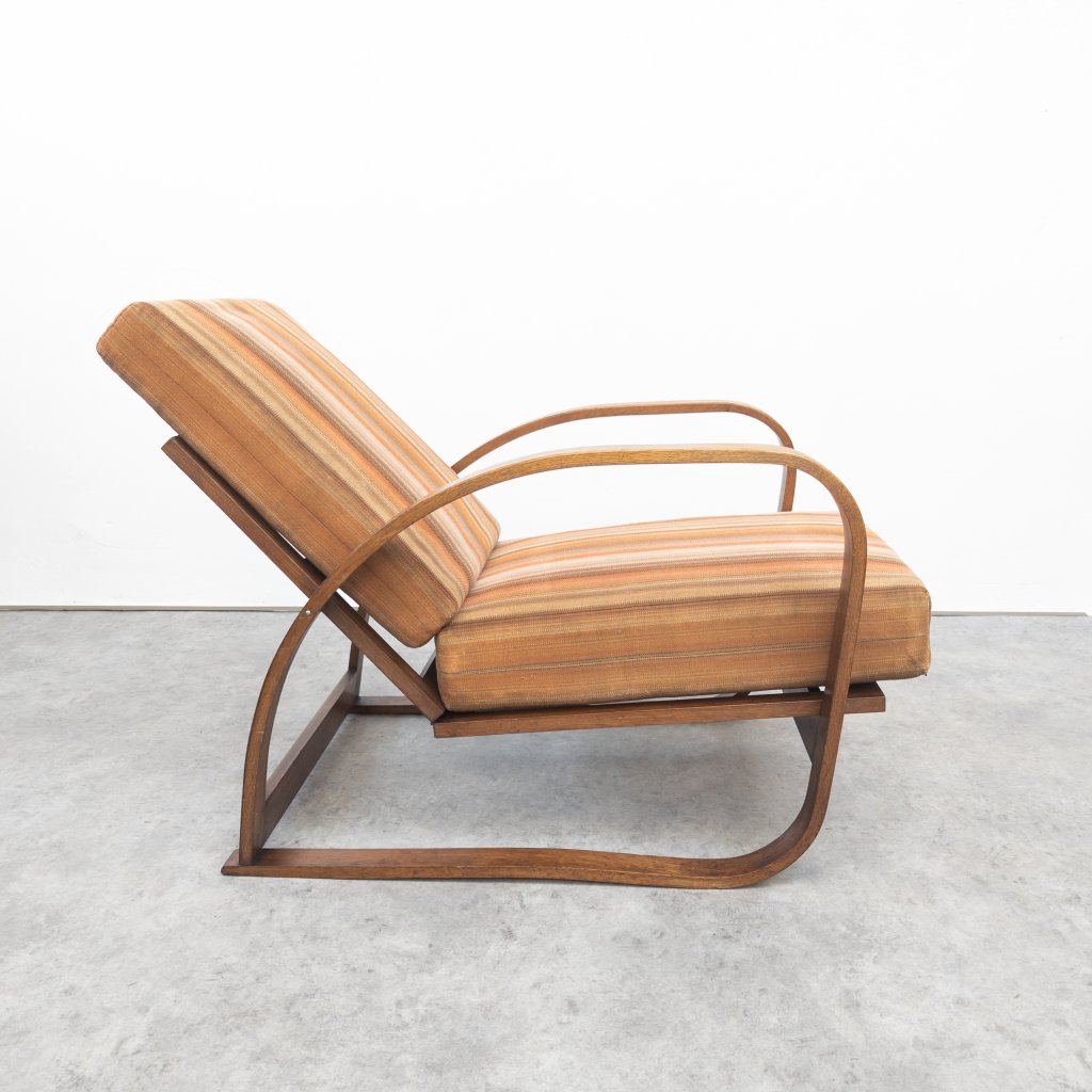 Fabric attributed to famous Czech textile designer Antonín Kybal. The chair can be adjusted by pulling the bottom part of the seat construction. Made of bent oakwood. In very good original condition with some traces of wear and age. Both wood and cushions expertly cleaned. Collectors piece, yet ready to be used.