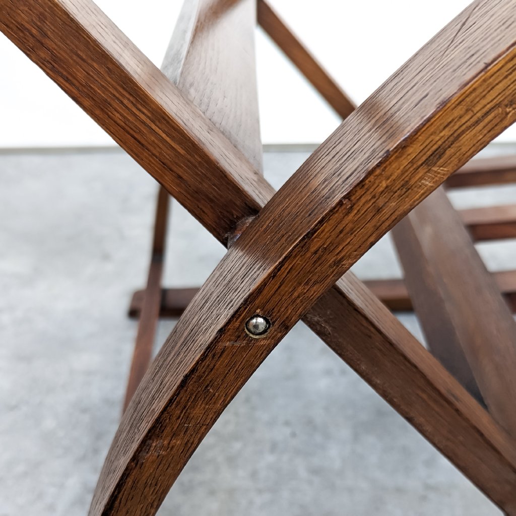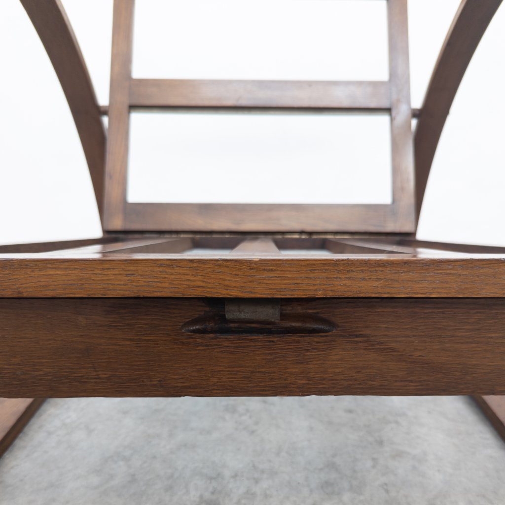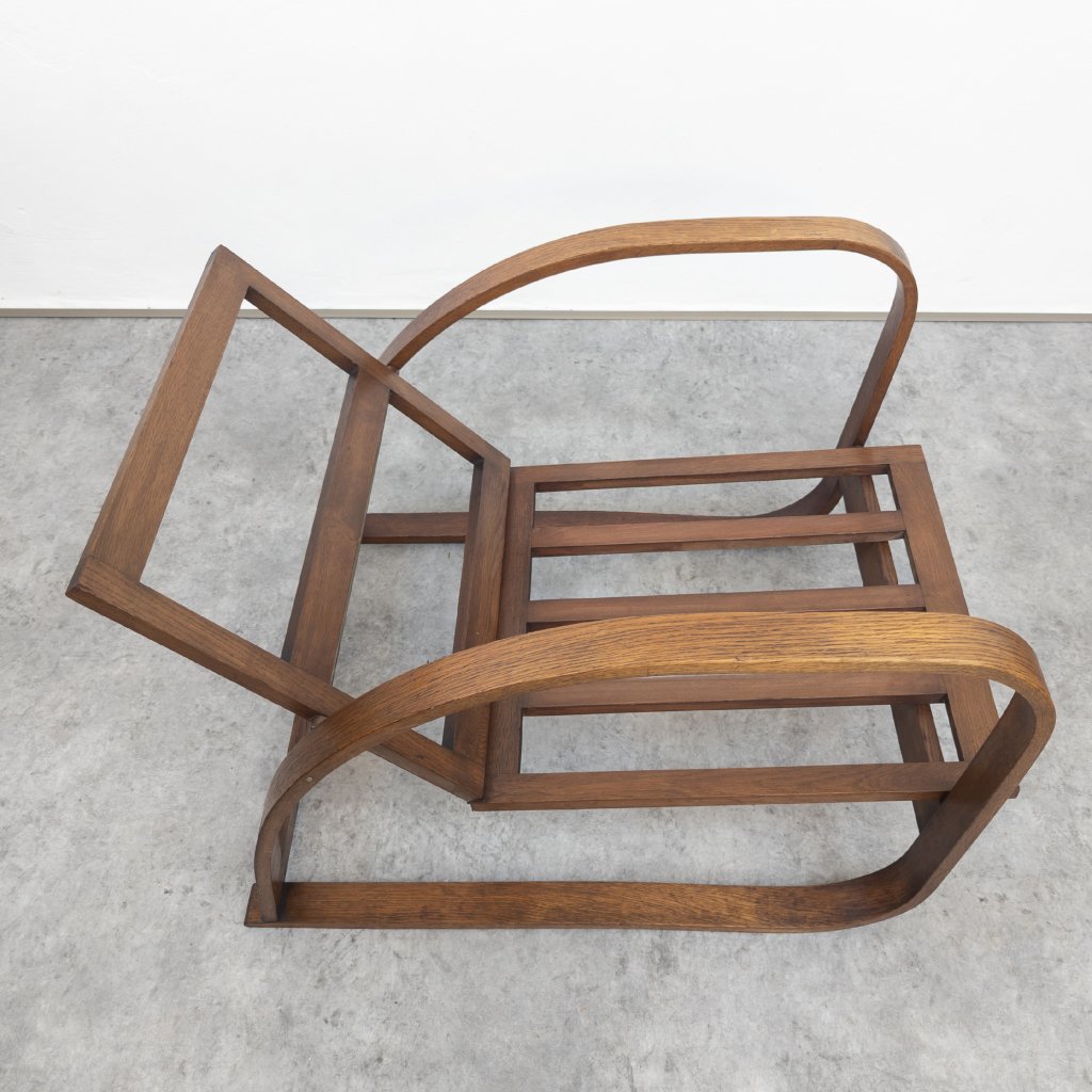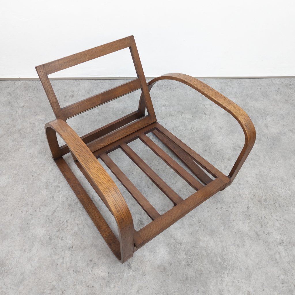 Fabric attributed to famous Czech textile designer Antonín Kybal. The chair can be adjusted by pulling the bottom part of the seat construction. Made of bent oakwood. In very good original condition with some traces of wear and age. Both wood and cushions expertly cleaned. Collectors piece, yet ready to be used.
