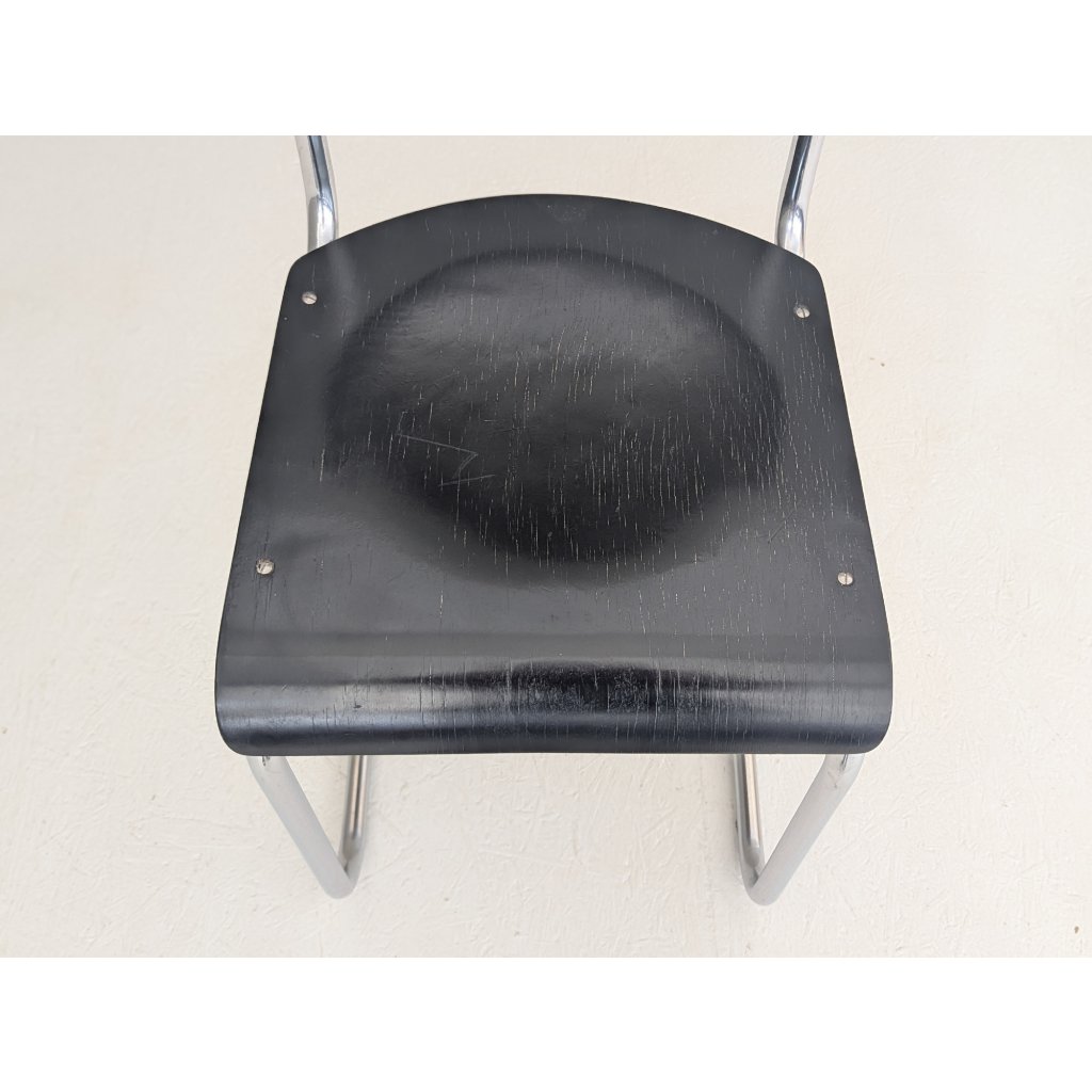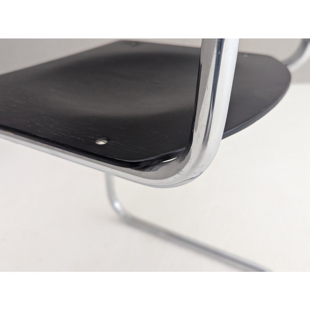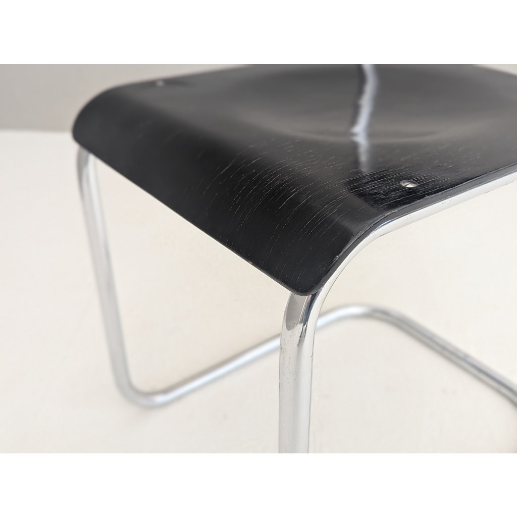 The chairs feature black lacquered plywood seats and backrests paired with chrome-plated tubular steel frames in a classic cantilever construction. This early production version is identifiable by its unique detail: the rounded tube ends at the backrest, typical for Vichr production variant.