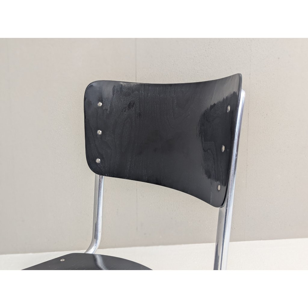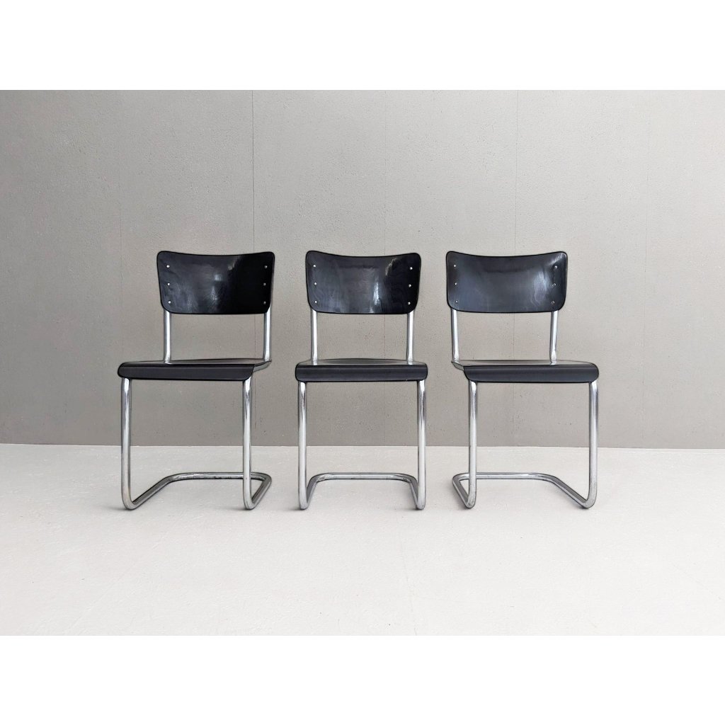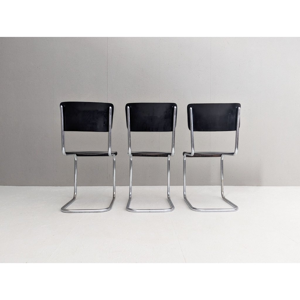 The chairs feature black lacquered plywood seats and backrests paired with chrome-plated tubular steel frames in a classic cantilever construction. This early production version is identifiable by its unique detail: the rounded tube ends at the backrest, typical for Vichr production variant.