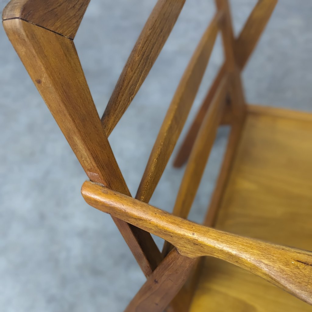 Wooden frame in good original condition, structurally sound. New cushions including filling with fabric matching the original. Overall height 74 cm, width 64 cm, depth 68 cm.