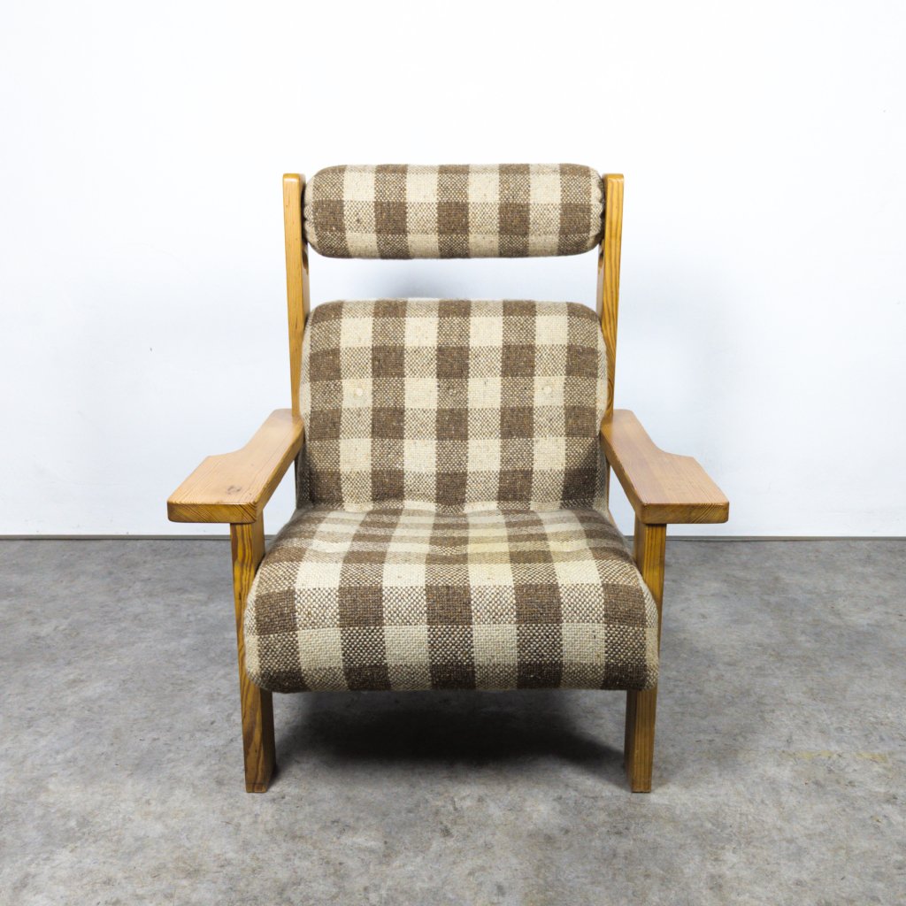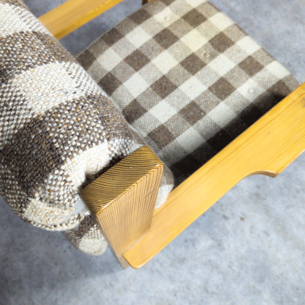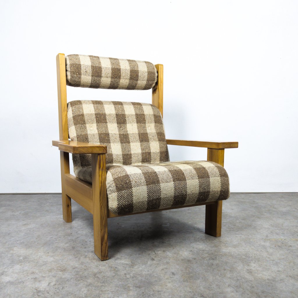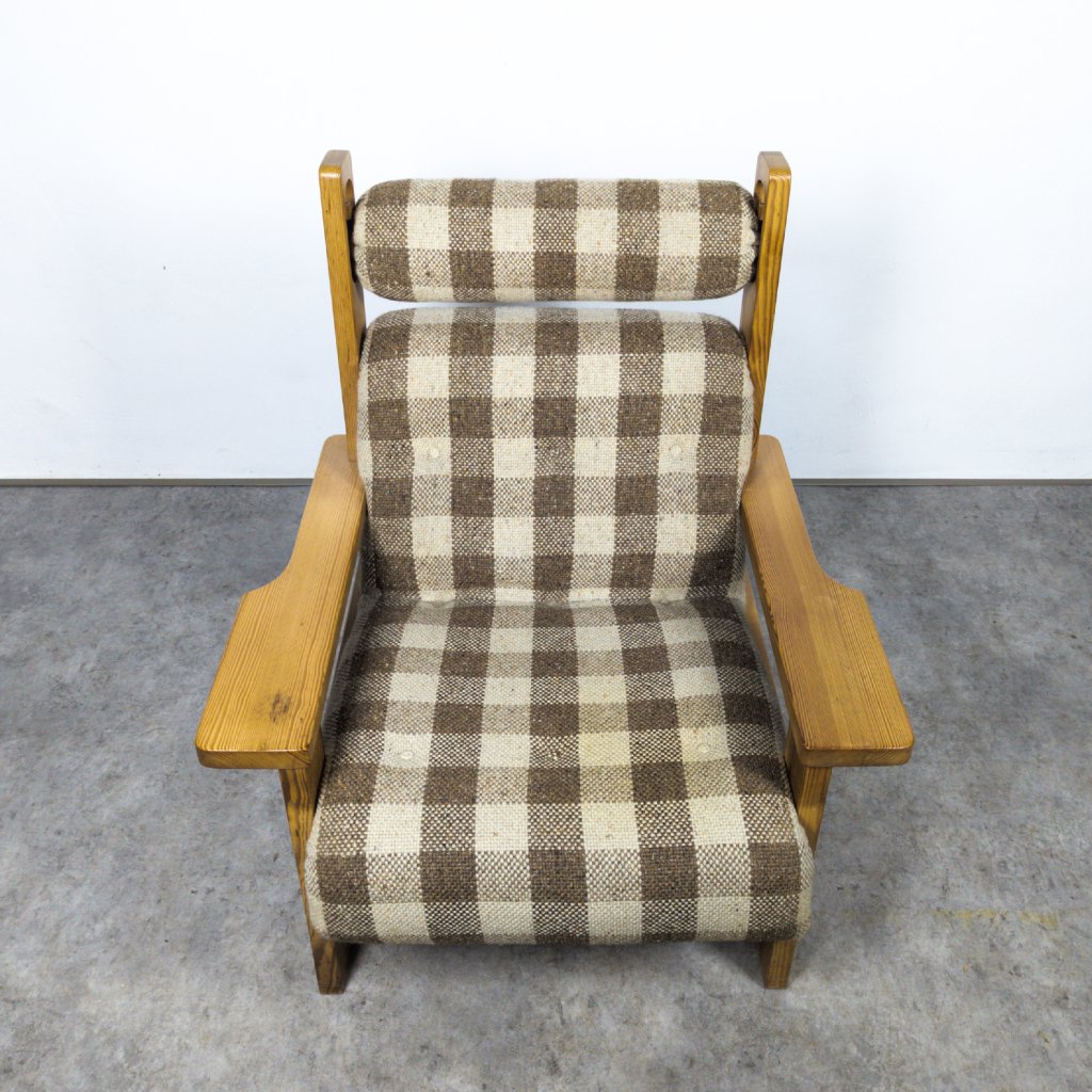 Made of solid pine wood with checkered wool upholstery. With adjustable headrest and removable cushions. Manufactured in Sweden in the 1970s. In very good original condition with only minor traces of wear and age. Wood polished and upholstery expertly cleaned. Structurally sound. Height 98 cm, depth 74 cm, width 60/86 cm, seat height 38 cm.
