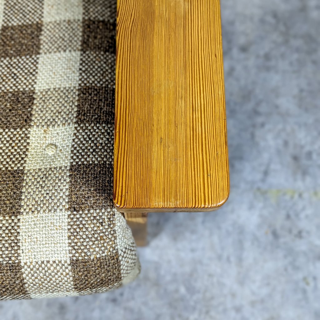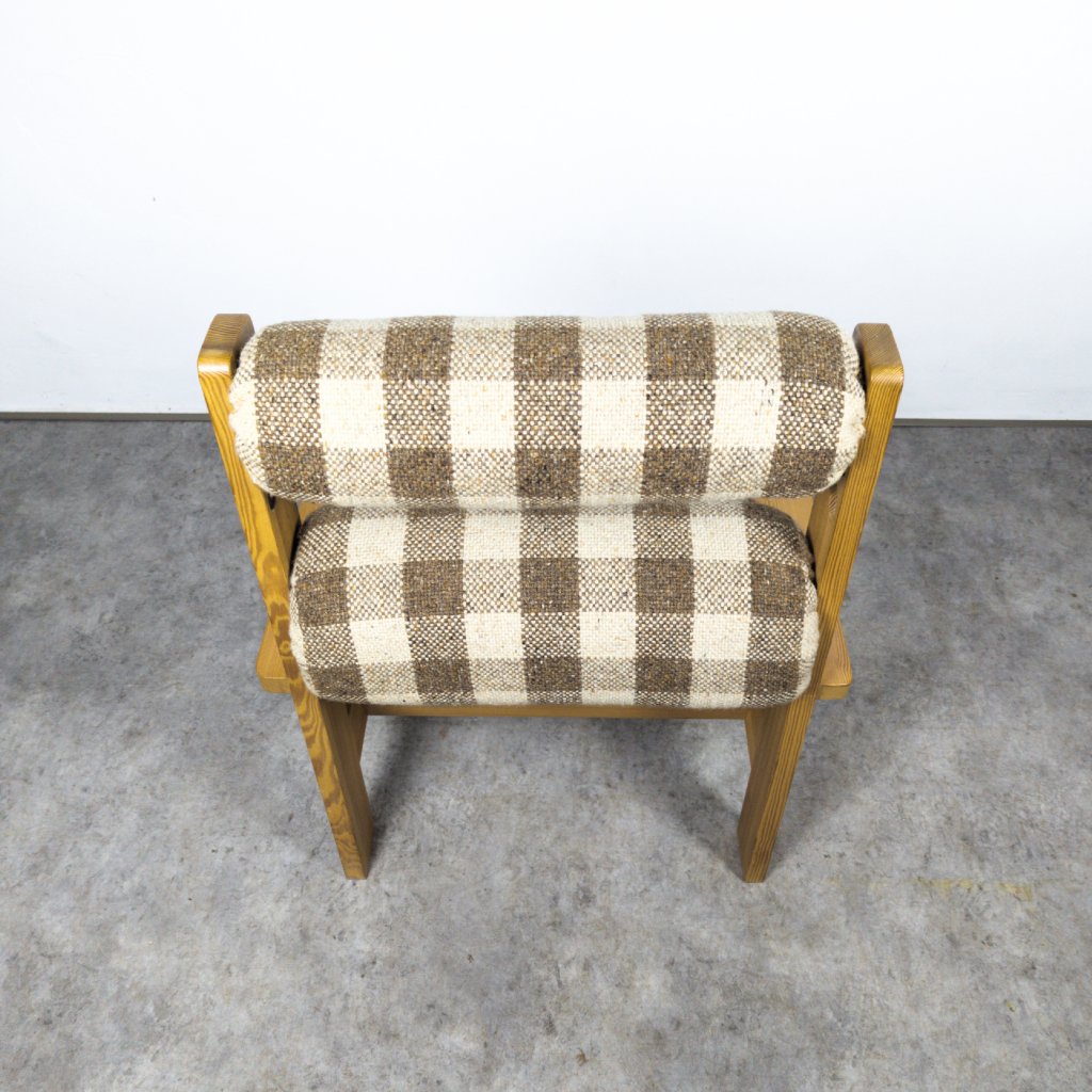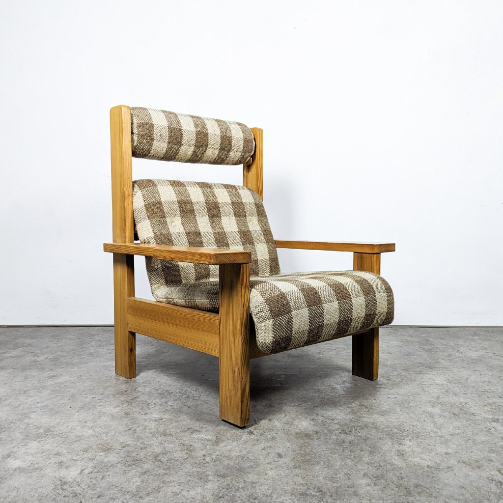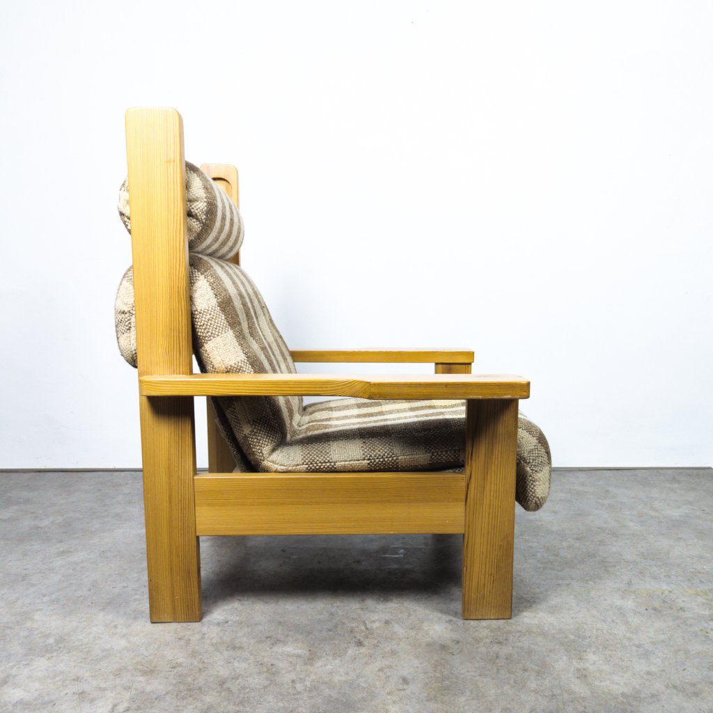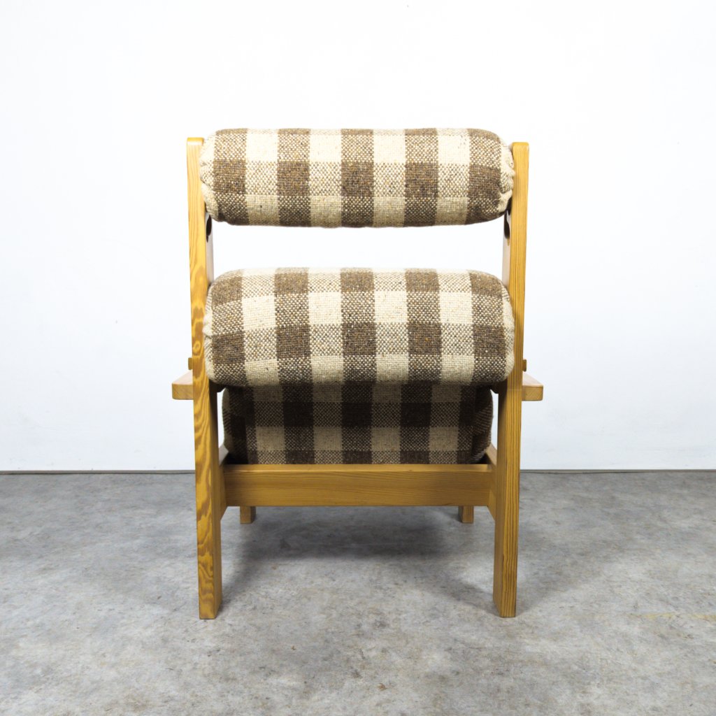 Made of solid pine wood with checkered wool upholstery. With adjustable headrest and removable cushions. Manufactured in Sweden in the 1970s. In very good original condition with only minor traces of wear and age. Wood polished and upholstery expertly cleaned. Structurally sound. Height 98 cm, depth 74 cm, width 60/86 cm, seat height 38 cm.