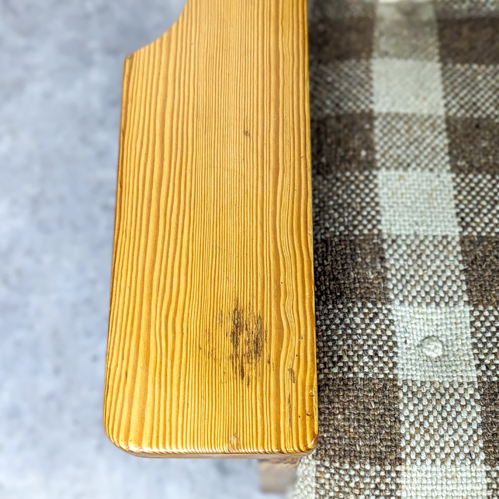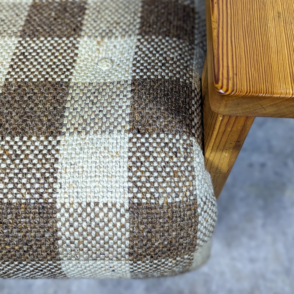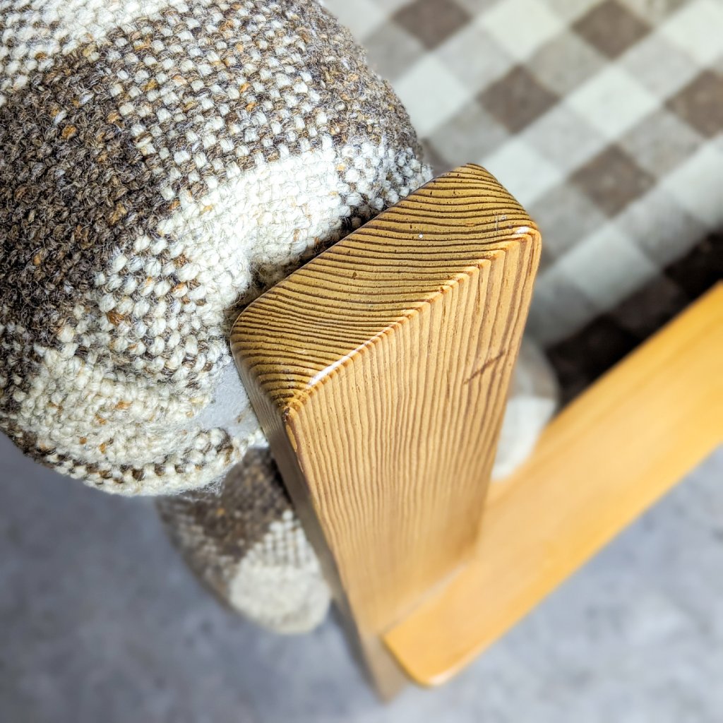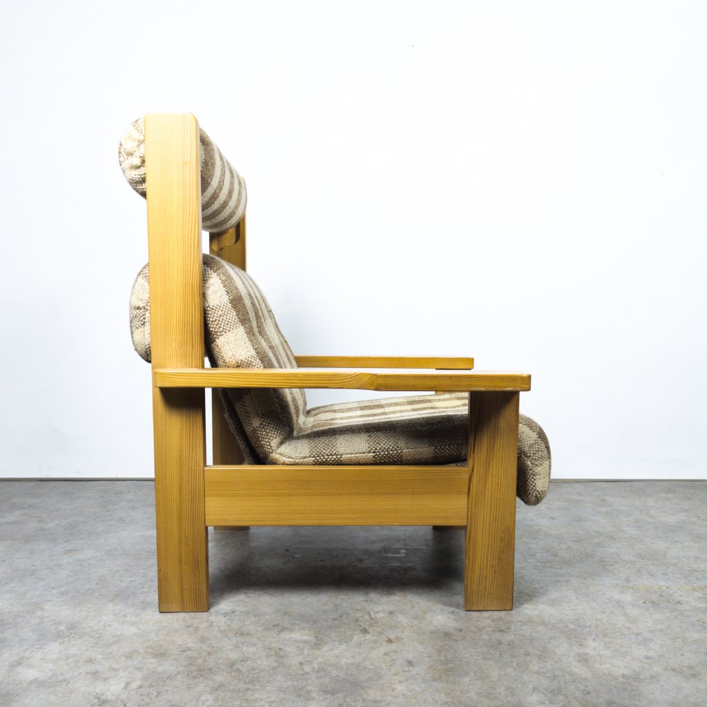 Made of solid pine wood with checkered wool upholstery. With adjustable headrest and removable cushions. Manufactured in Sweden in the 1970s. In very good original condition with only minor traces of wear and age. Wood polished and upholstery expertly cleaned. Structurally sound. Height 98 cm, depth 74 cm, width 60/86 cm, seat height 38 cm.
