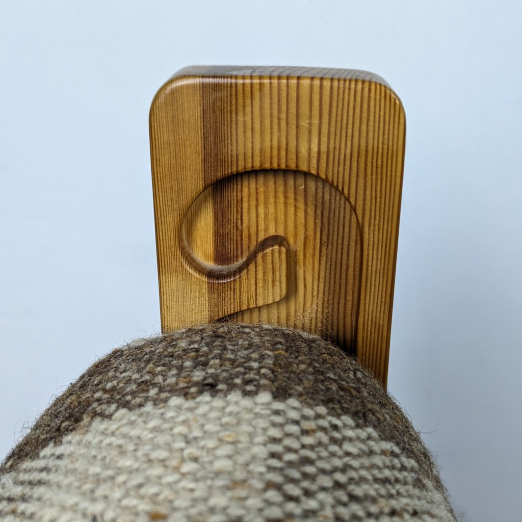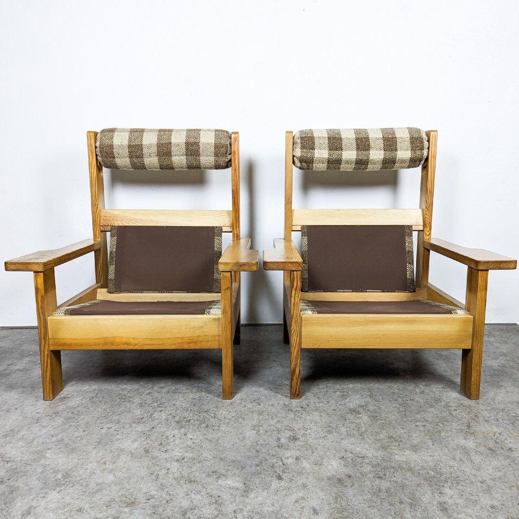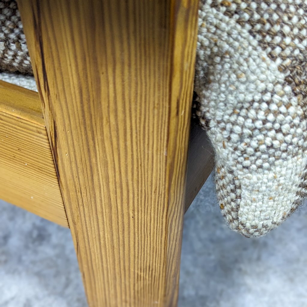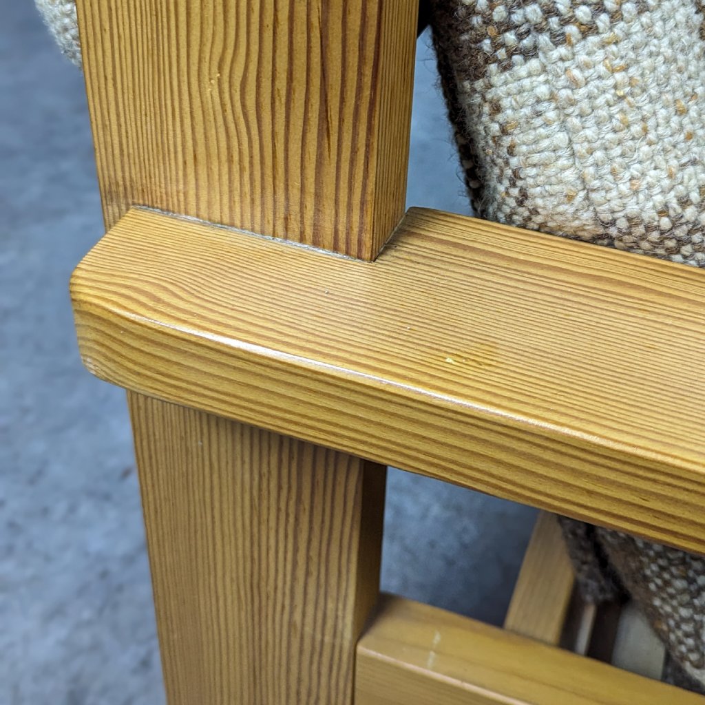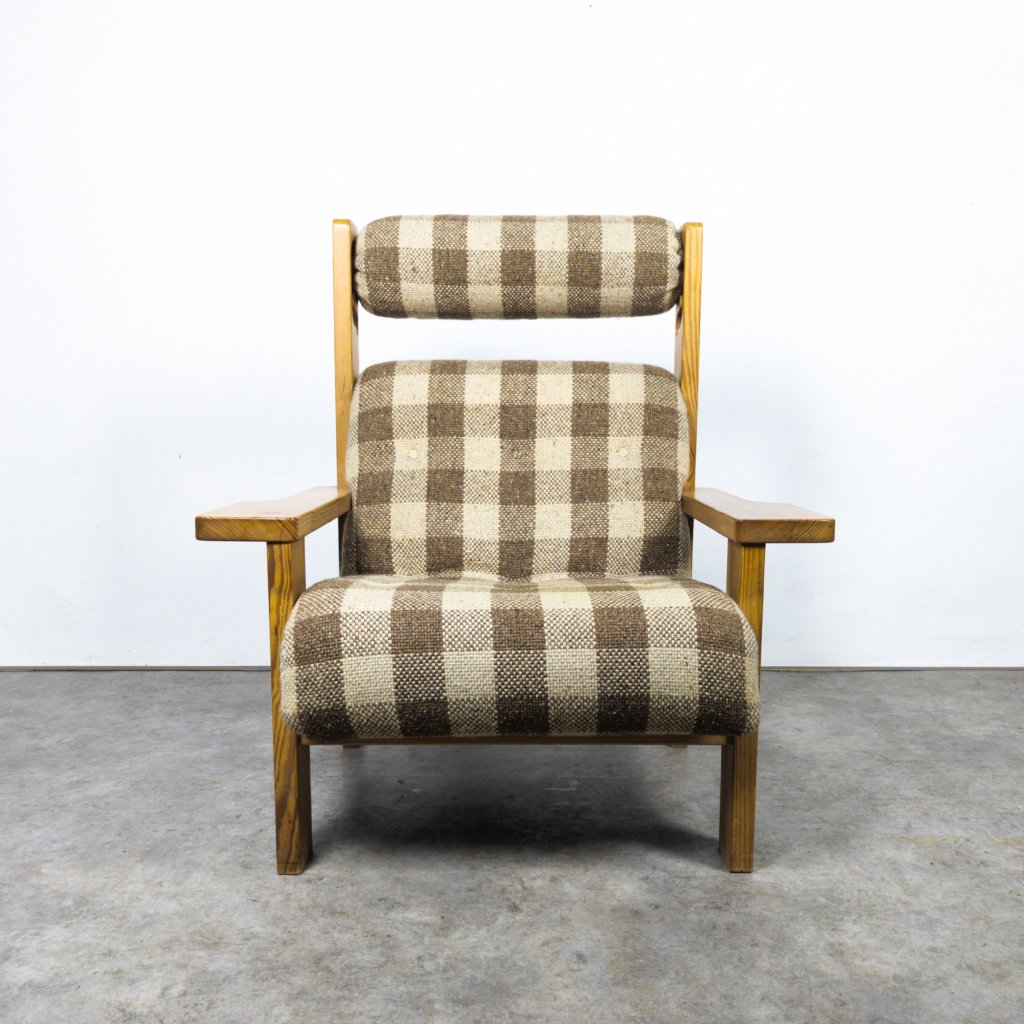 Made of solid pine wood with checkered wool upholstery. With adjustable headrest and removable cushions. Manufactured in Sweden in the 1970s. In very good original condition with only minor traces of wear and age. Wood polished and upholstery expertly cleaned. Structurally sound. Height 98 cm, depth 74 cm, width 60/86 cm, seat height 38 cm.