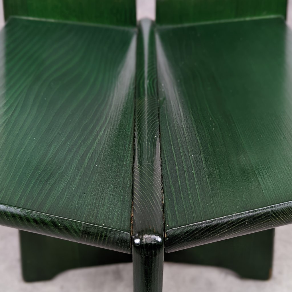 Made of green varnished pine wood. In very good original condition with traces of wear and use. Firm and stable. Dimensions: Height 77 cm, Width 43 cm, Depth 52 cm, Seat Height 45 cm.