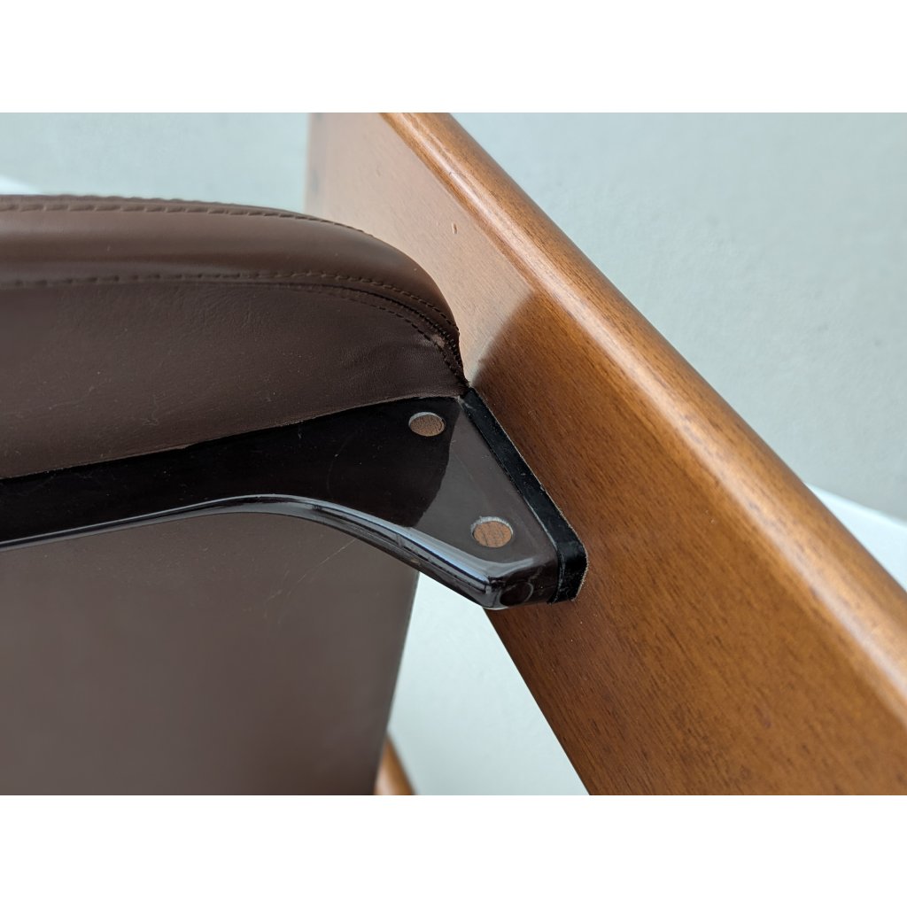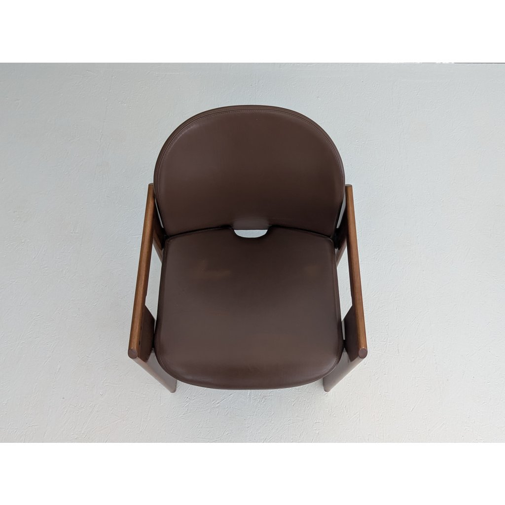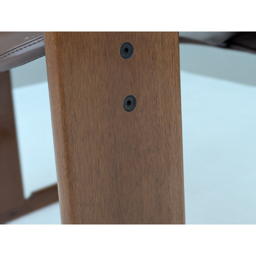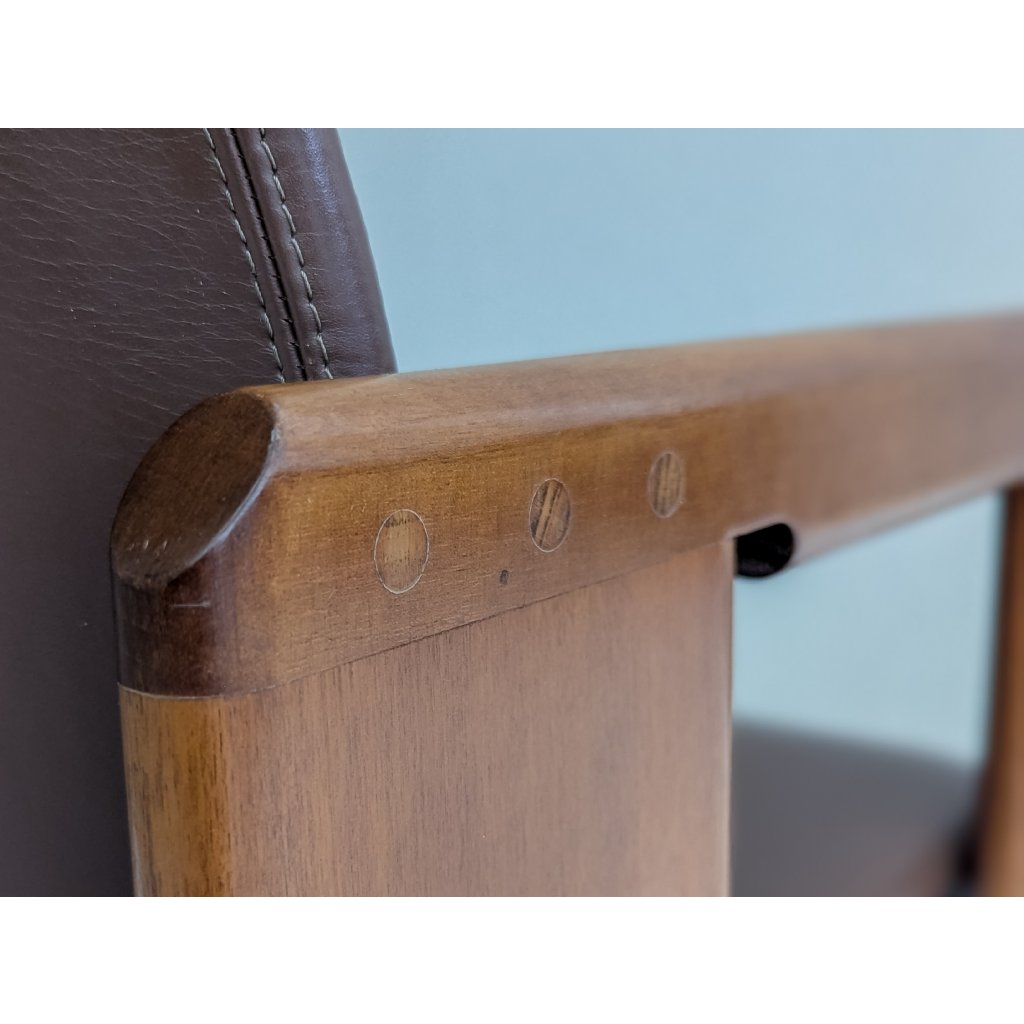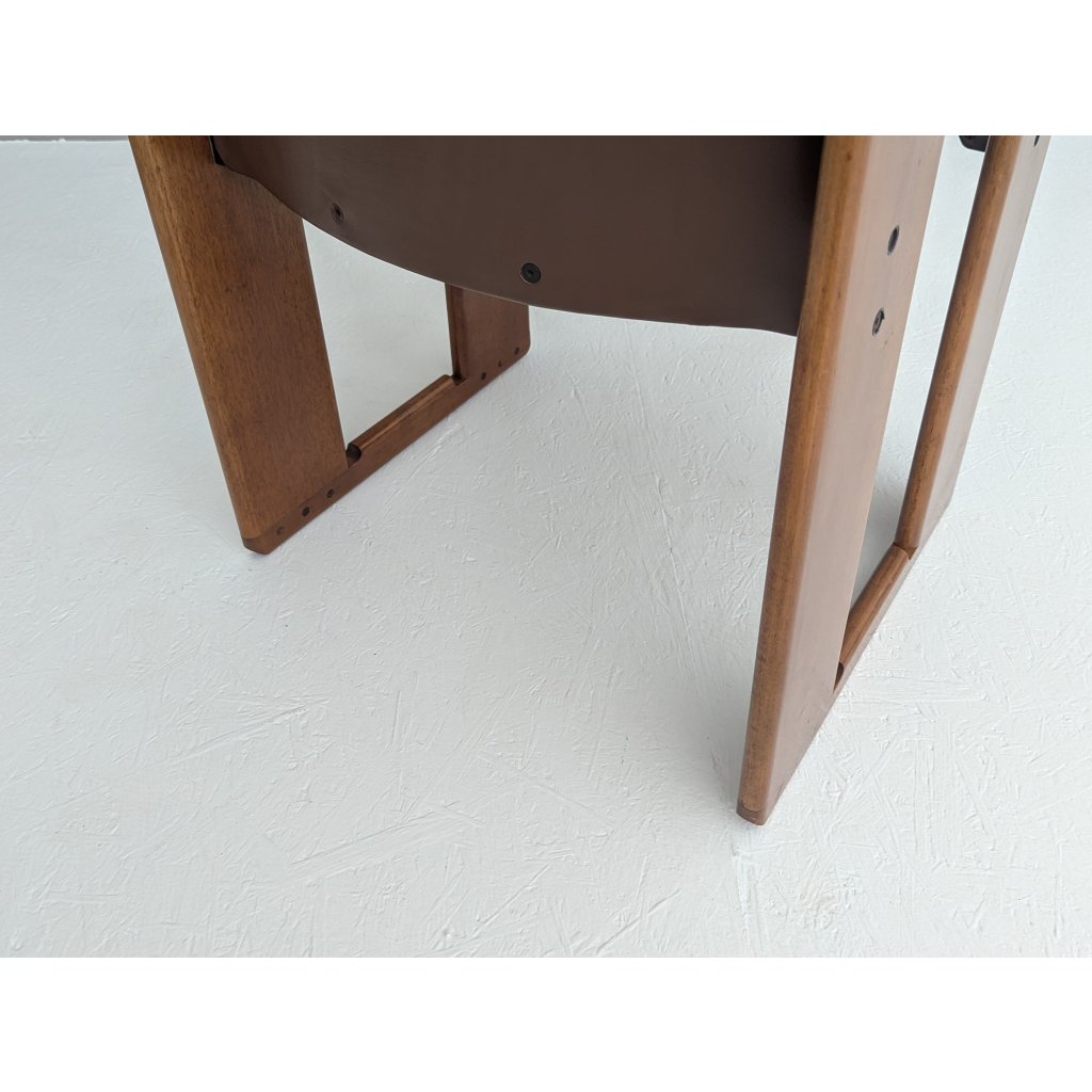 The sculptural black lacquered frames contrast elegantly with the warm brown leather seats, which show just the right amount of wear to speak of authenticity without distraction. Precision-cut joints, fluid contours, and a balanced tension between line and volume reflect the Scarpas’ architectural sensibility and deep respect for craft.