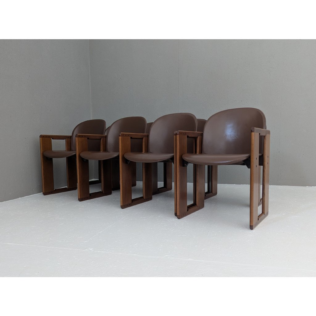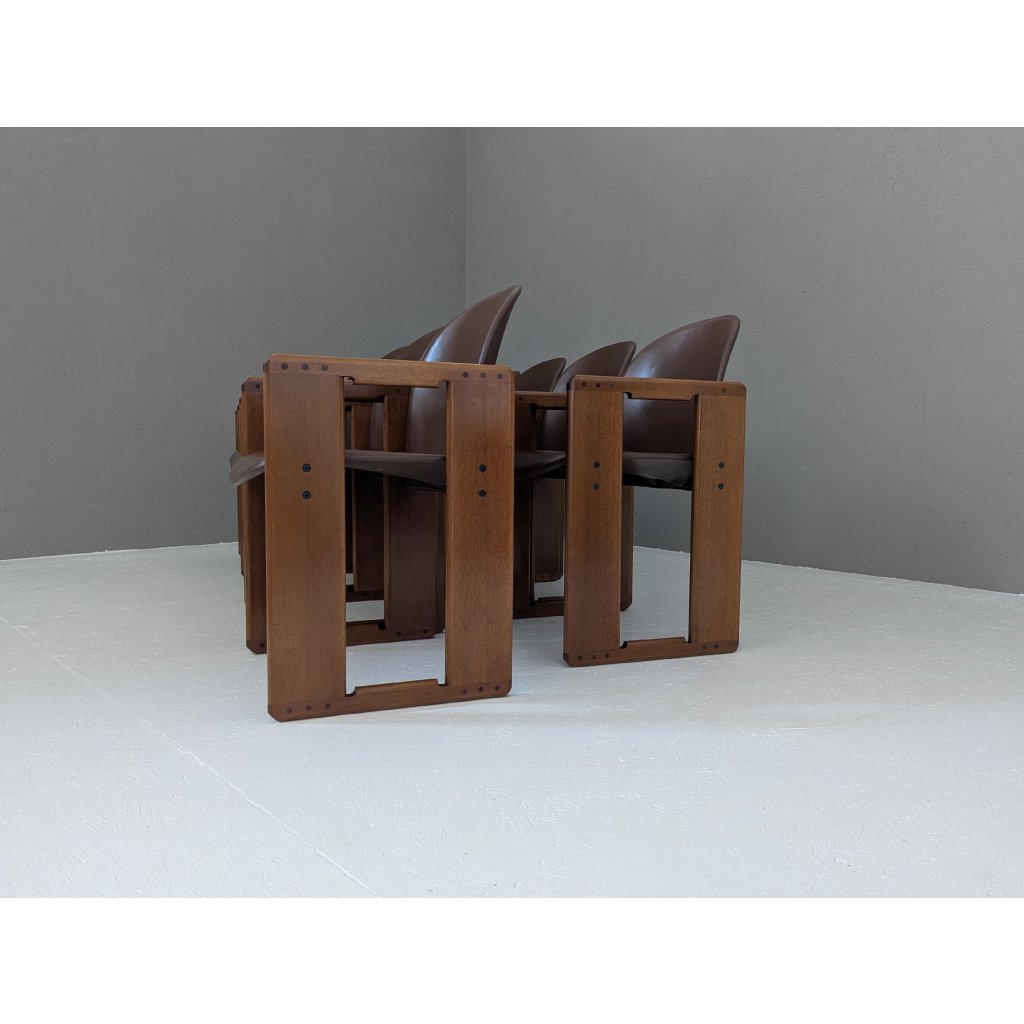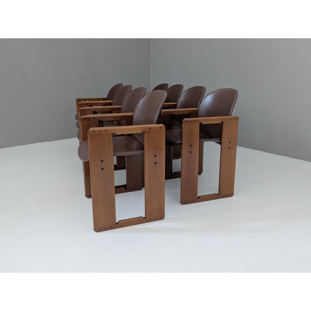 Designed in the early 1970s by the visionary duo Afra and Tobia Scarpa, the Dialogo chair is a masterclass in quiet complexity. This set of eight exemplifies the pair’s commitment to structural clarity and understated luxury — a dialogue between geometry, material, and human presence.