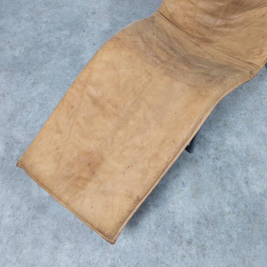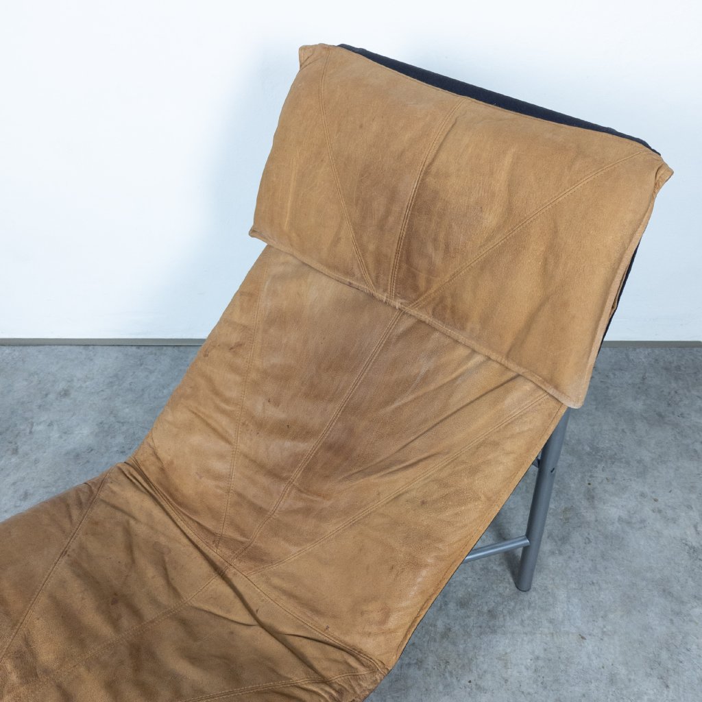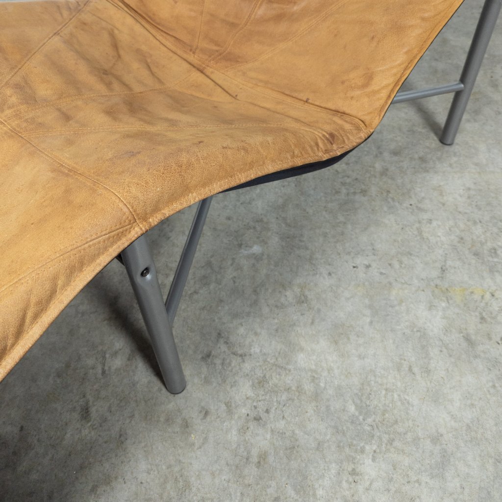 This chair offers exceptional comfort with its buffalo leather original upholstery. The lacquered tubular steel structure adds a modern touch. Overall, it's in very good condition for its age, with only minor wear. The leather seating remains in excellent shape with lovely patina. Length 160, width 70, seat height 32, height 94 cm.