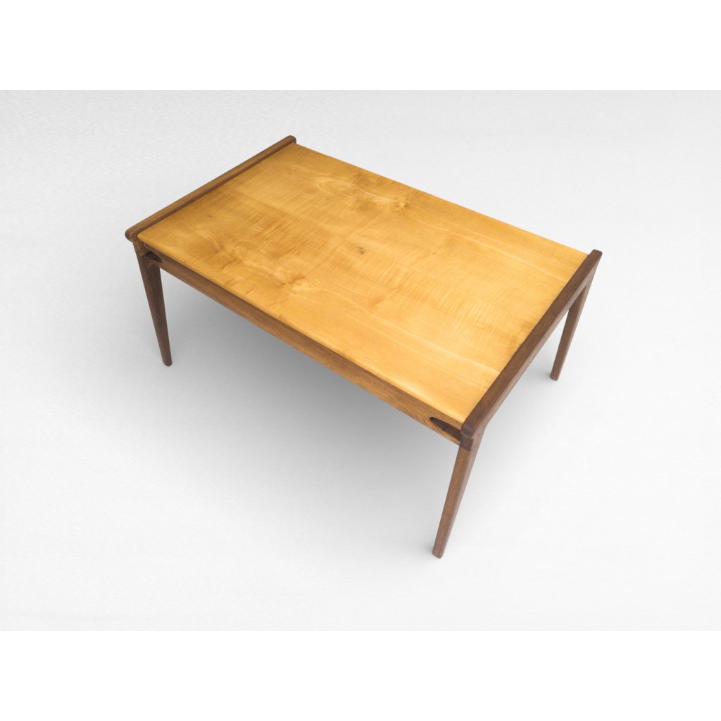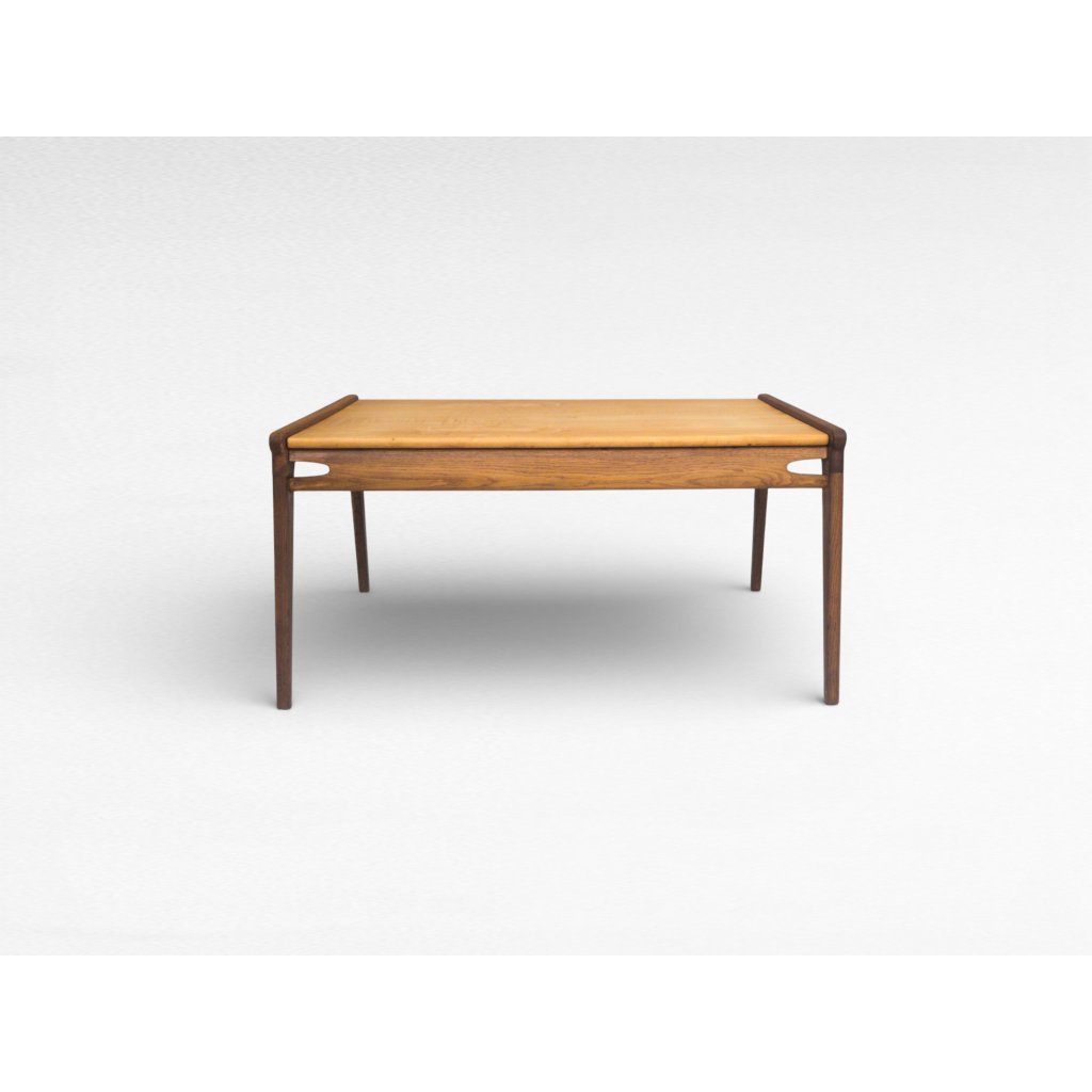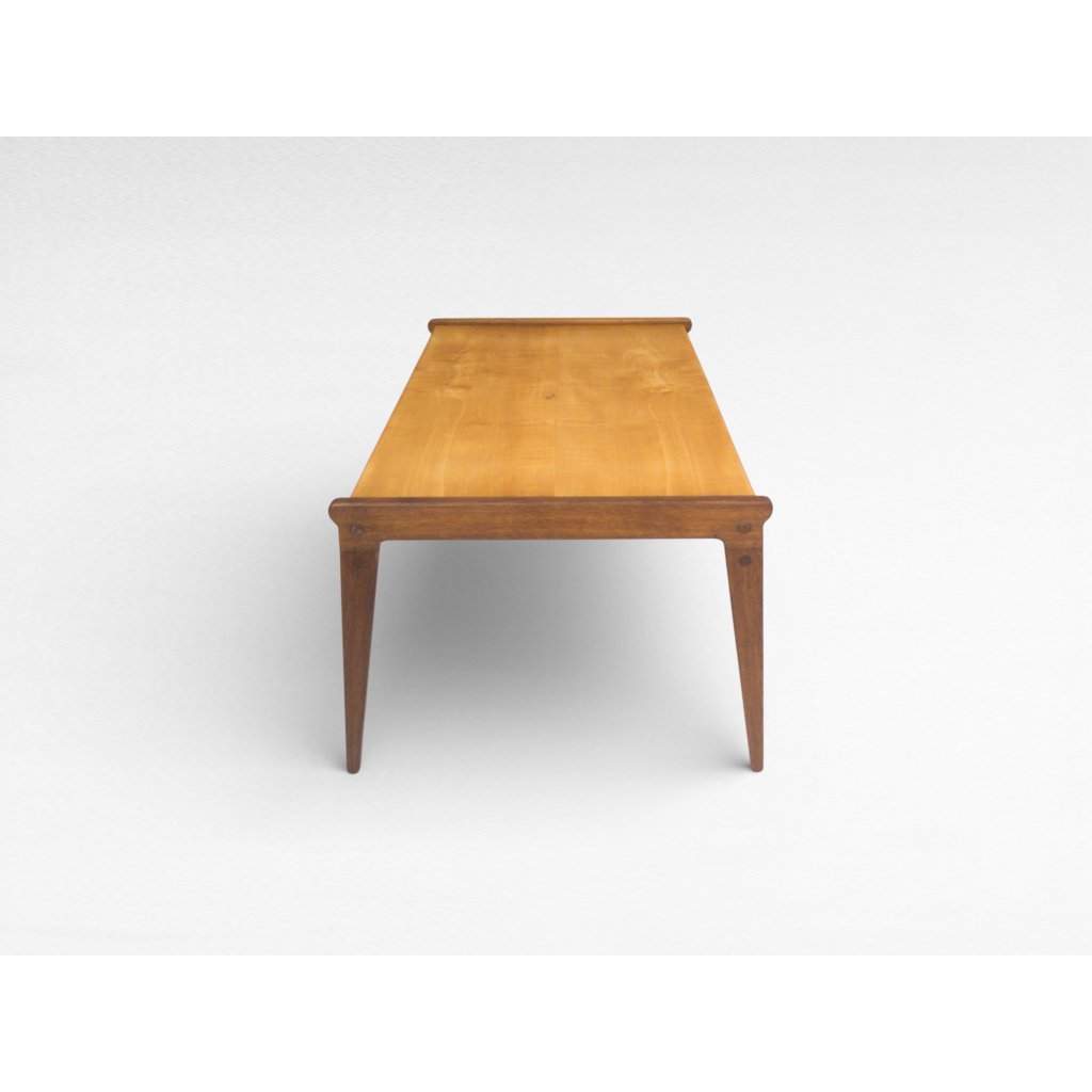 Executed in solid hardwood with a contrasting lighter inset top, the design reveals Heger’s distinctive sculptural language. The softly rounded frame elements, exposed joinery details, and elongated oval cut-outs beneath the tabletop demonstrate a masterful understanding of proportion, ergonomics, and structural honesty.