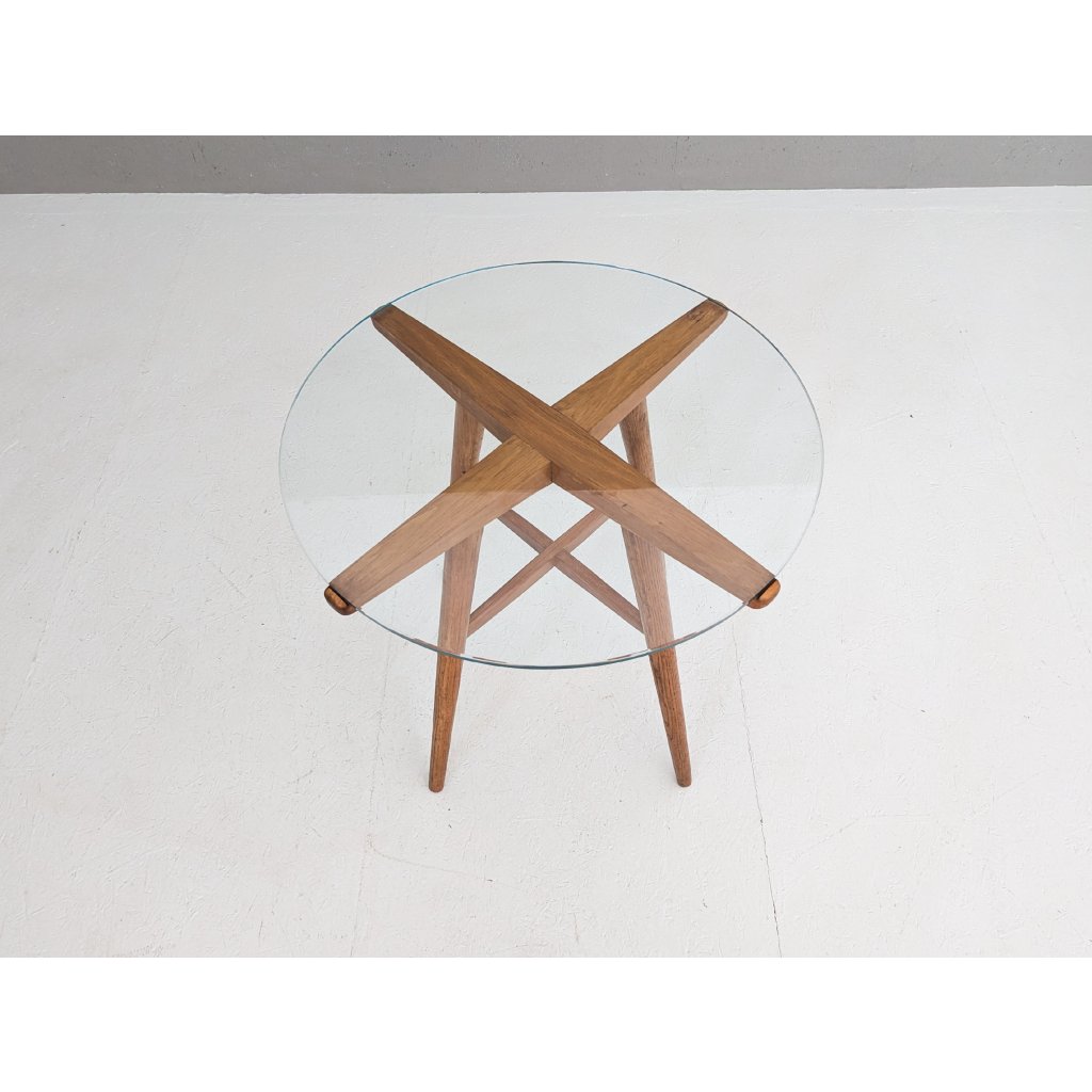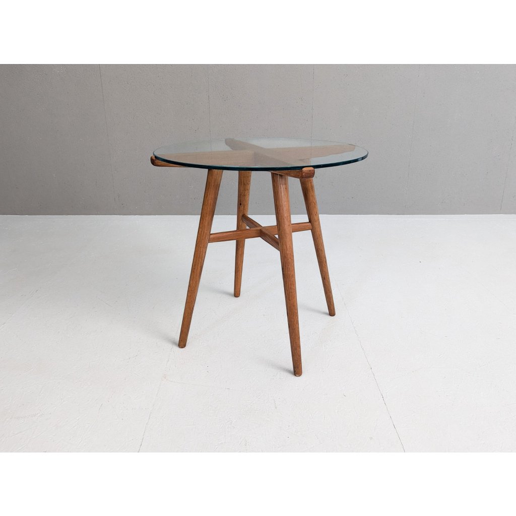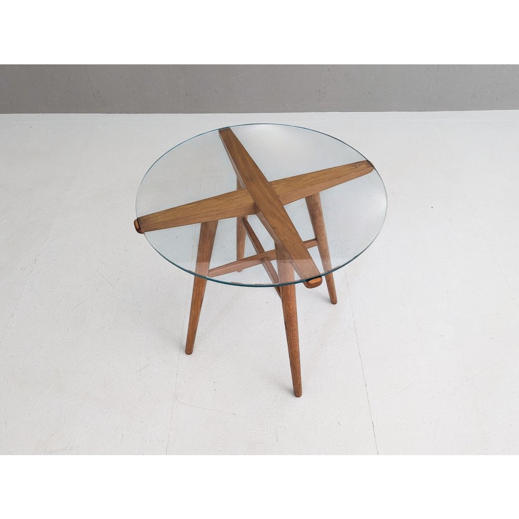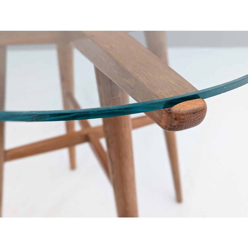 This refined design features a solid beech wood base with elegantly tapered legs and a distinctive cross-form stretcher, supporting a round glass top. The composition exemplifies Czech postwar modernism — functional, light, and meticulously crafted.