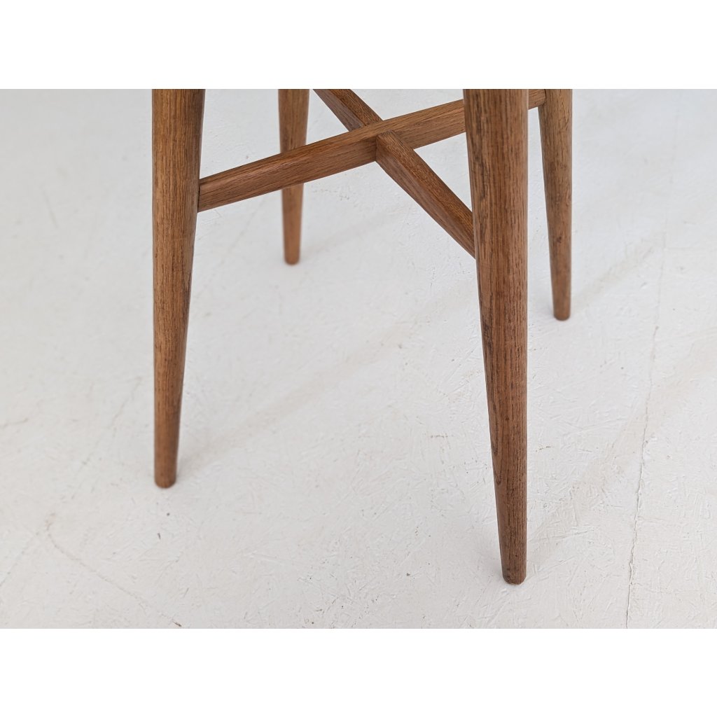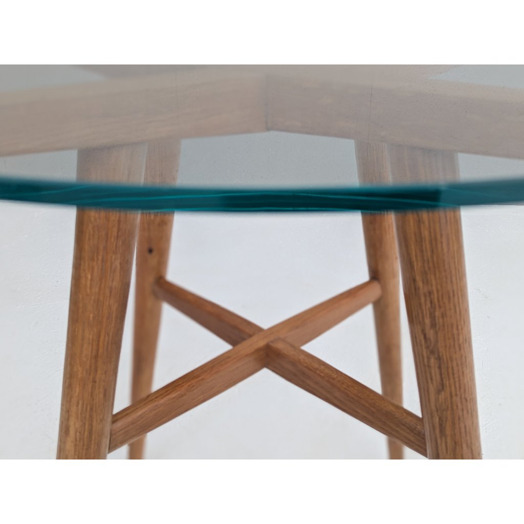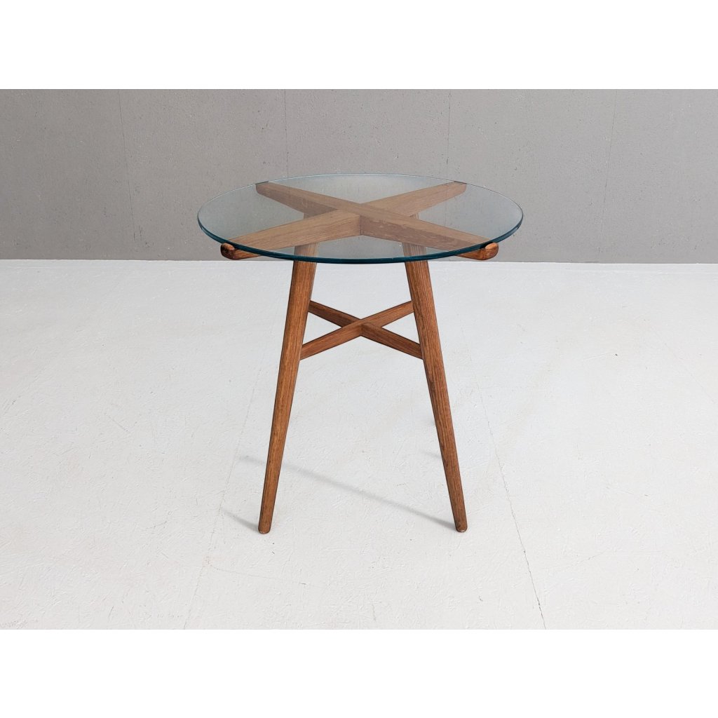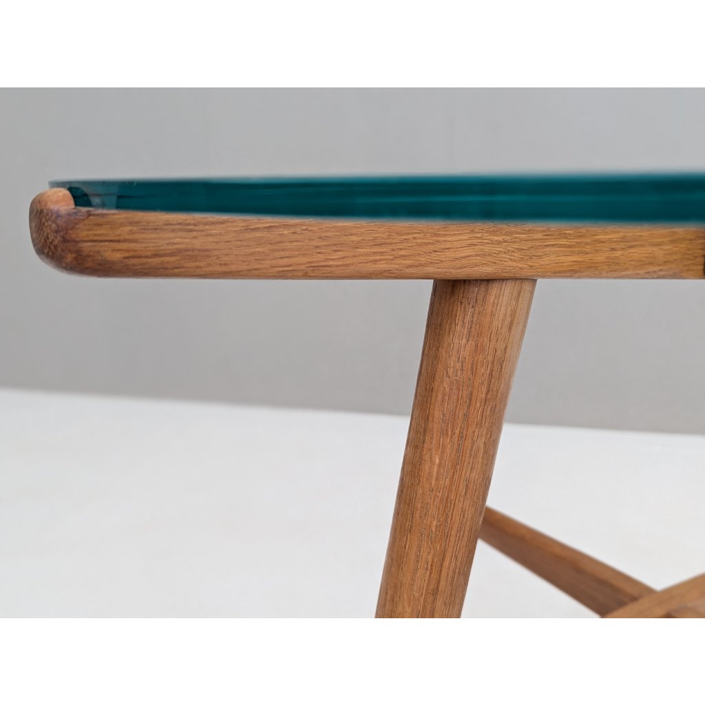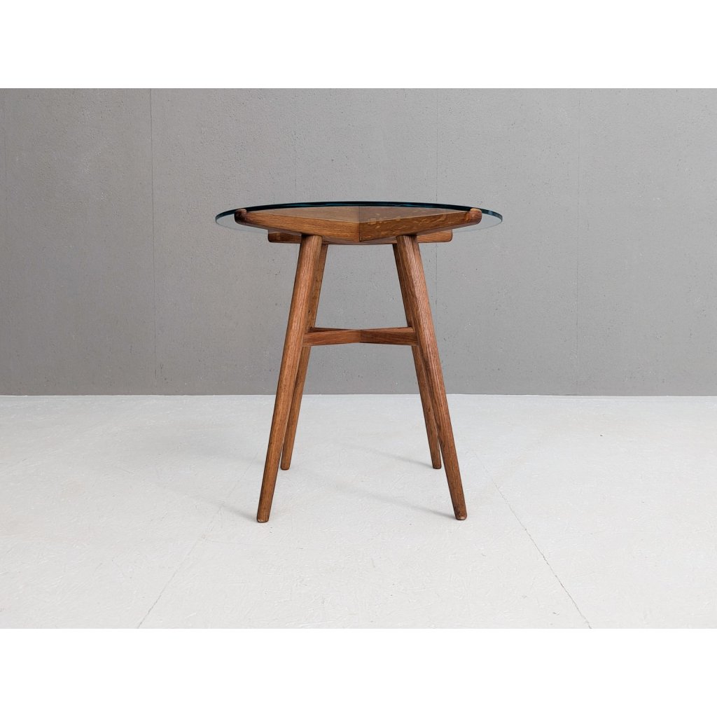 This refined design features a solid beech wood base with elegantly tapered legs and a distinctive cross-form stretcher, supporting a round glass top. The composition exemplifies Czech postwar modernism — functional, light, and meticulously crafted.