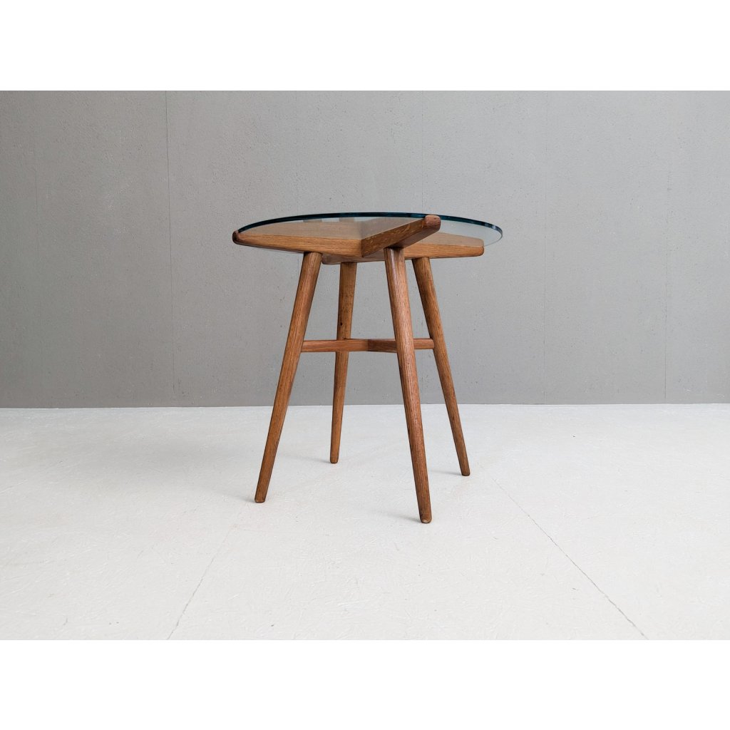Expertly preserved, the table remains in excellent original condition. The wood has been cleaned and polished, and the glass top is free of chips, retaining its original clarity and warmth of finish.